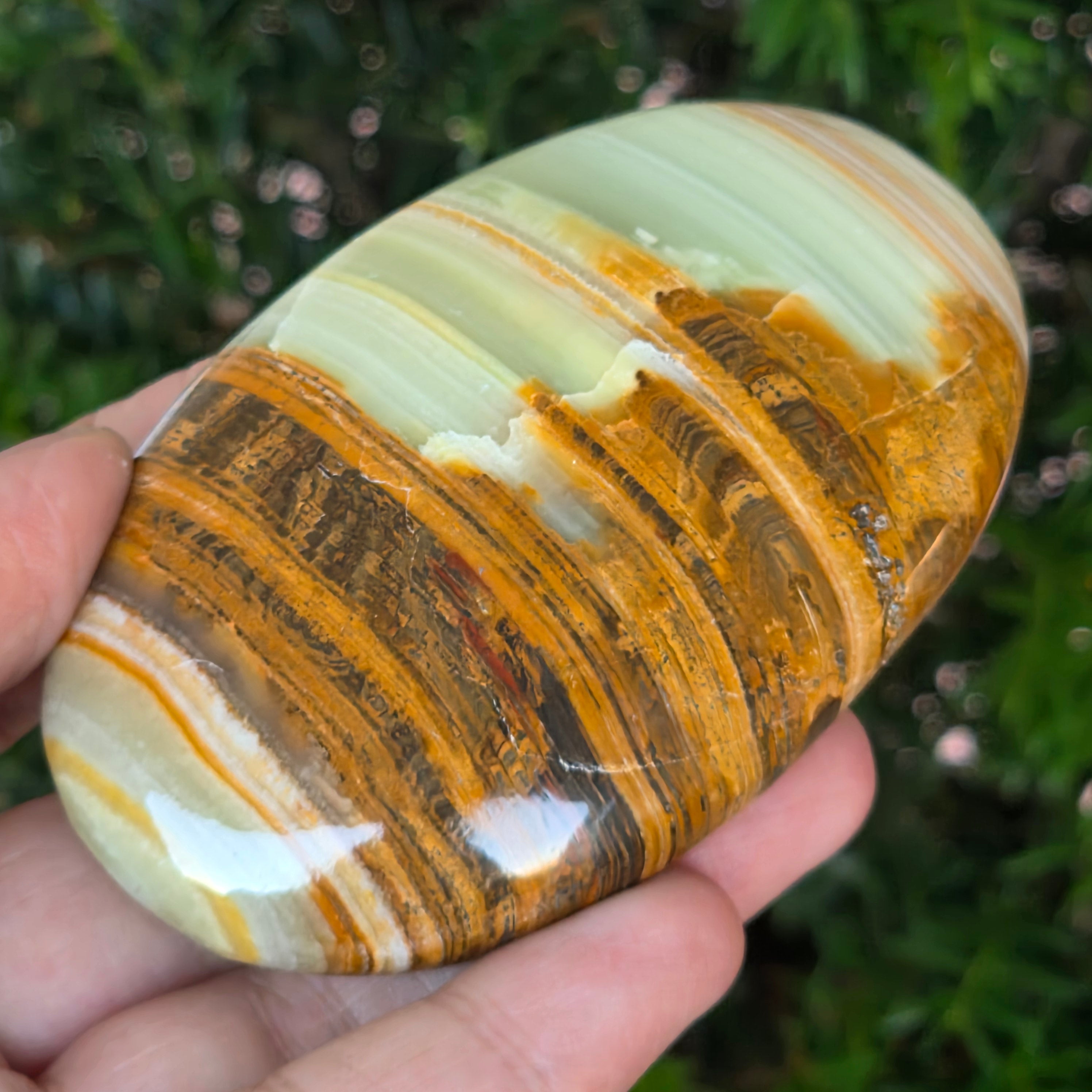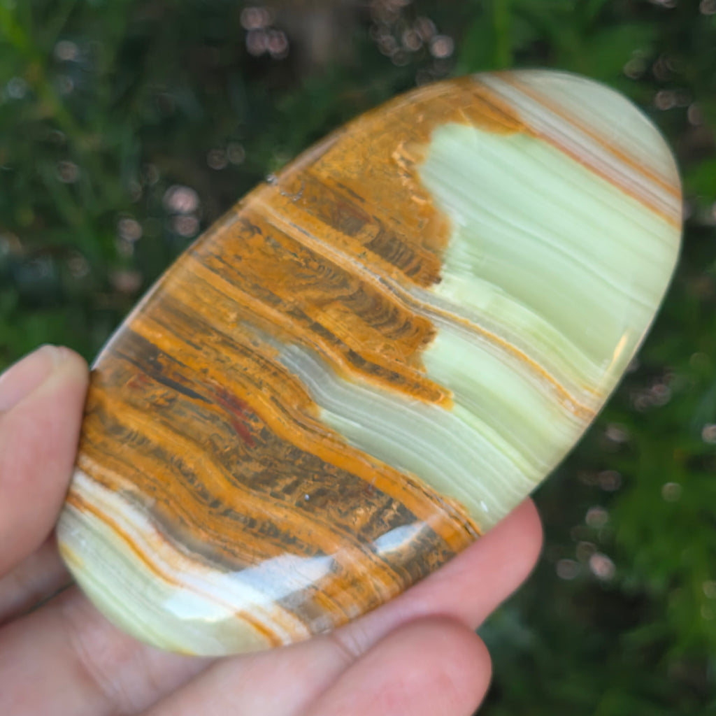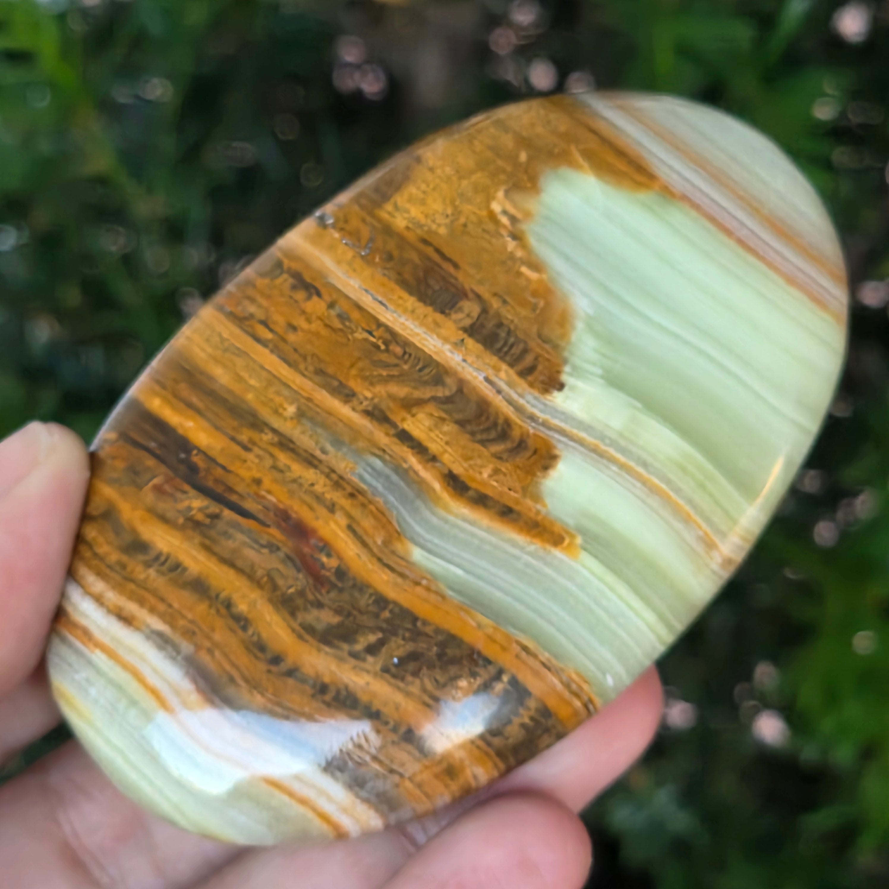 Ținut între palme, acest palmstone din onix verde natural devine un aliat al echilibrului, un memento tăcut al armoniei dintre trup și spirit. Este ideal pentru meditație, relaxare sau pur și simplu ca obiect decorativ cu energie blândă și rafinată.