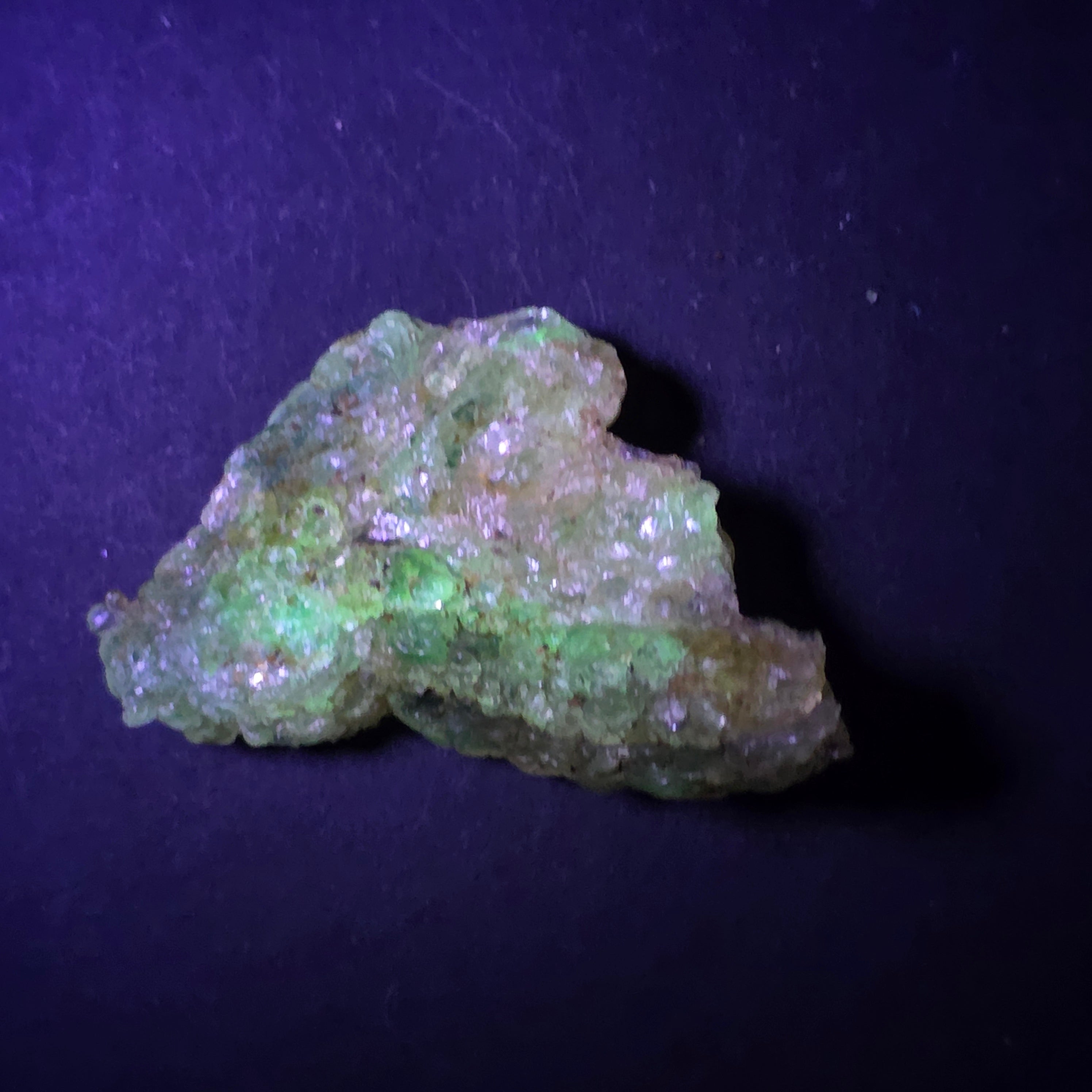 În lumină naturală, opalul hialit apare incolor până la alb-translucid, cu un aspect discret și elegant. Sub lumină ultravioletă însă, mineralul se transformă complet, emițând o strălucire verde neon, puternică și uniformă, efect care îl face extrem de căutat de colecționari. Această fluorescență se datorează urmelor naturale de uraniu din structura sa, prezente în cantități foarte mici și stabile.