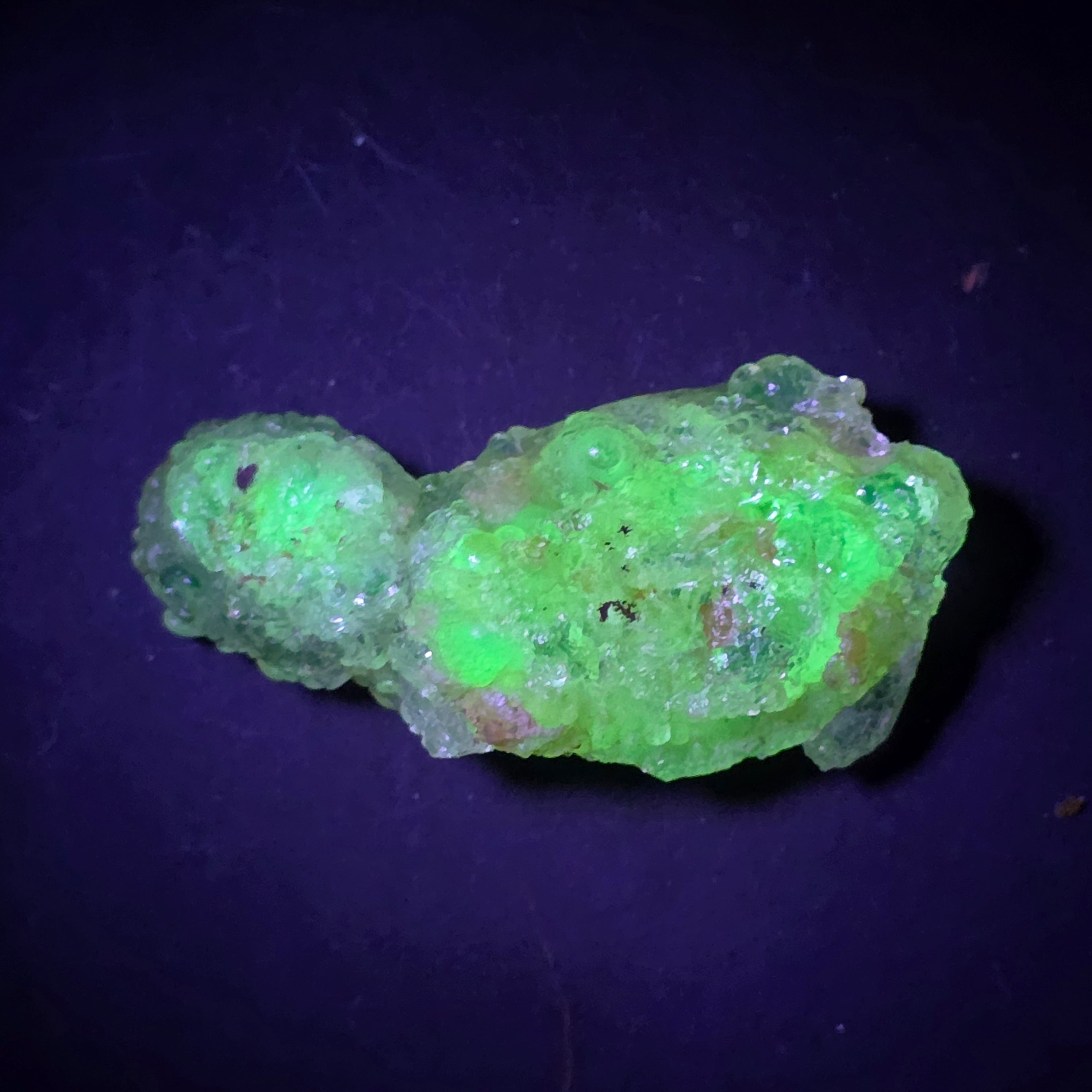 În lumină naturală, opalul hialit apare incolor până la alb-translucid, cu un aspect discret și elegant. Sub lumină ultravioletă însă, mineralul se transformă complet, emițând o strălucire verde neon, puternică și uniformă, efect care îl face extrem de căutat de colecționari. Această fluorescență se datorează urmelor naturale de uraniu din structura sa, prezente în cantități foarte mici și stabile.