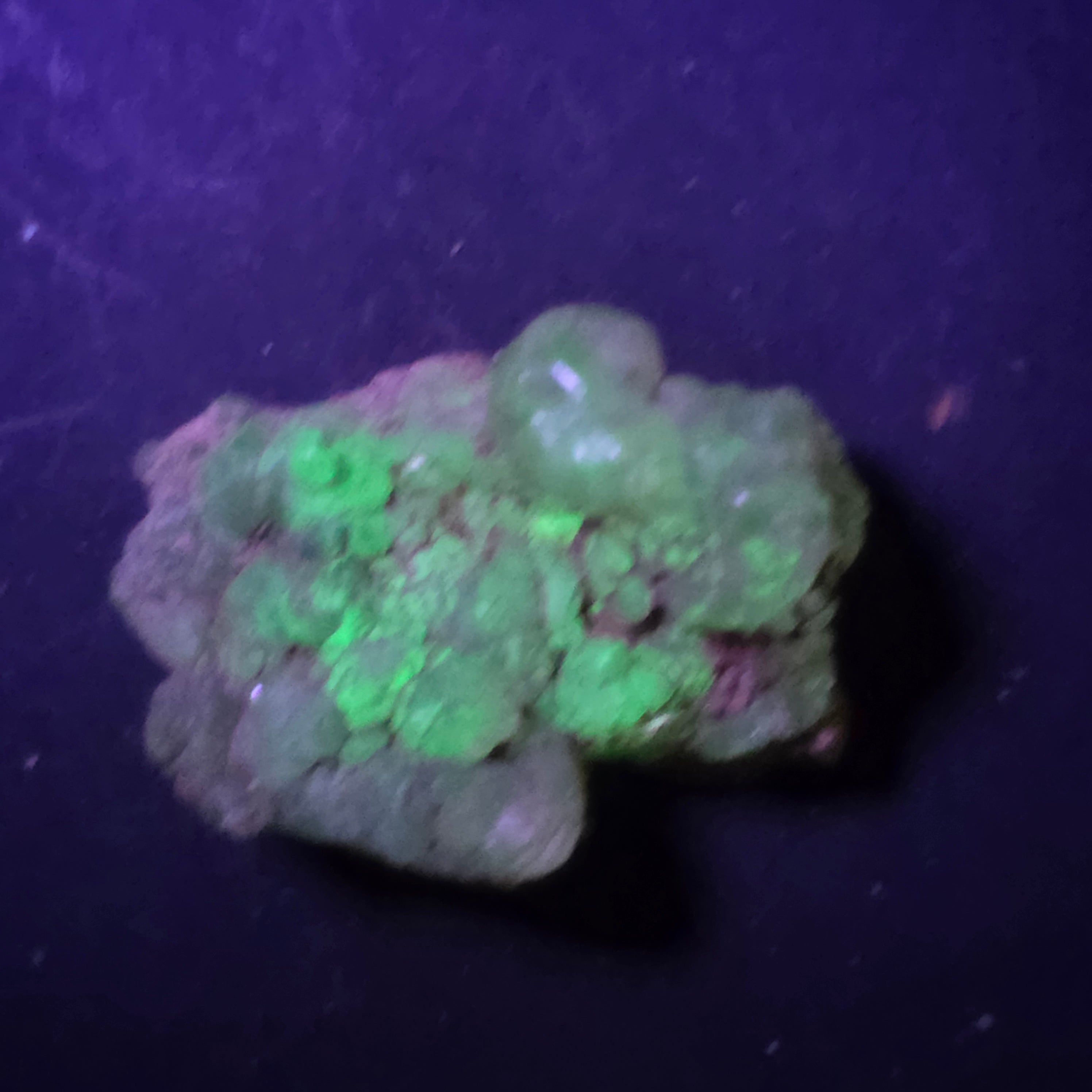 În lumină naturală, opalul hialit apare incolor până la alb-translucid, cu un aspect discret și elegant. Sub lumină ultravioletă însă, mineralul se transformă complet, emițând o strălucire verde neon, puternică și uniformă, efect care îl face extrem de căutat de colecționari. Această fluorescență se datorează urmelor naturale de uraniu din structura sa, prezente în cantități foarte mici și stabile.