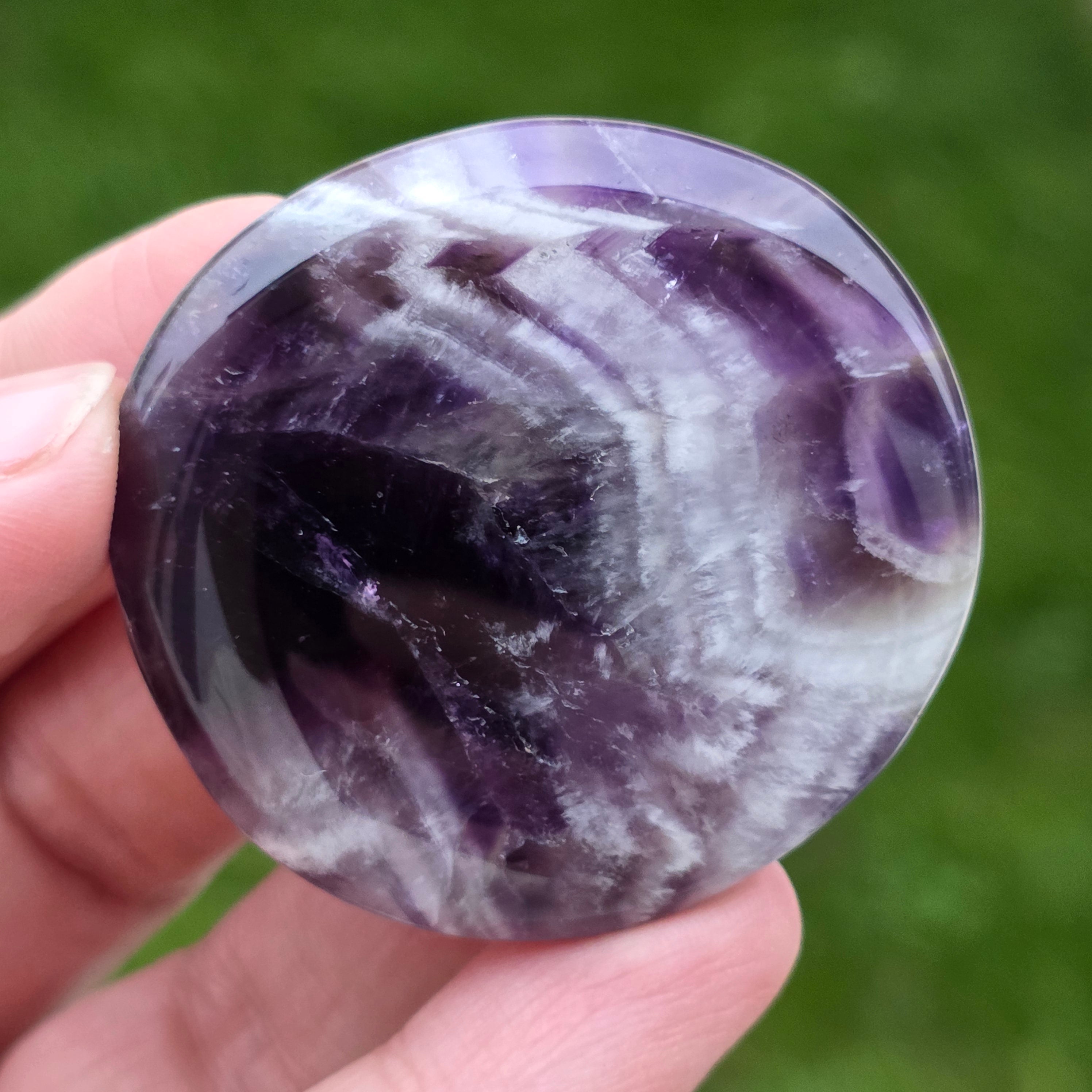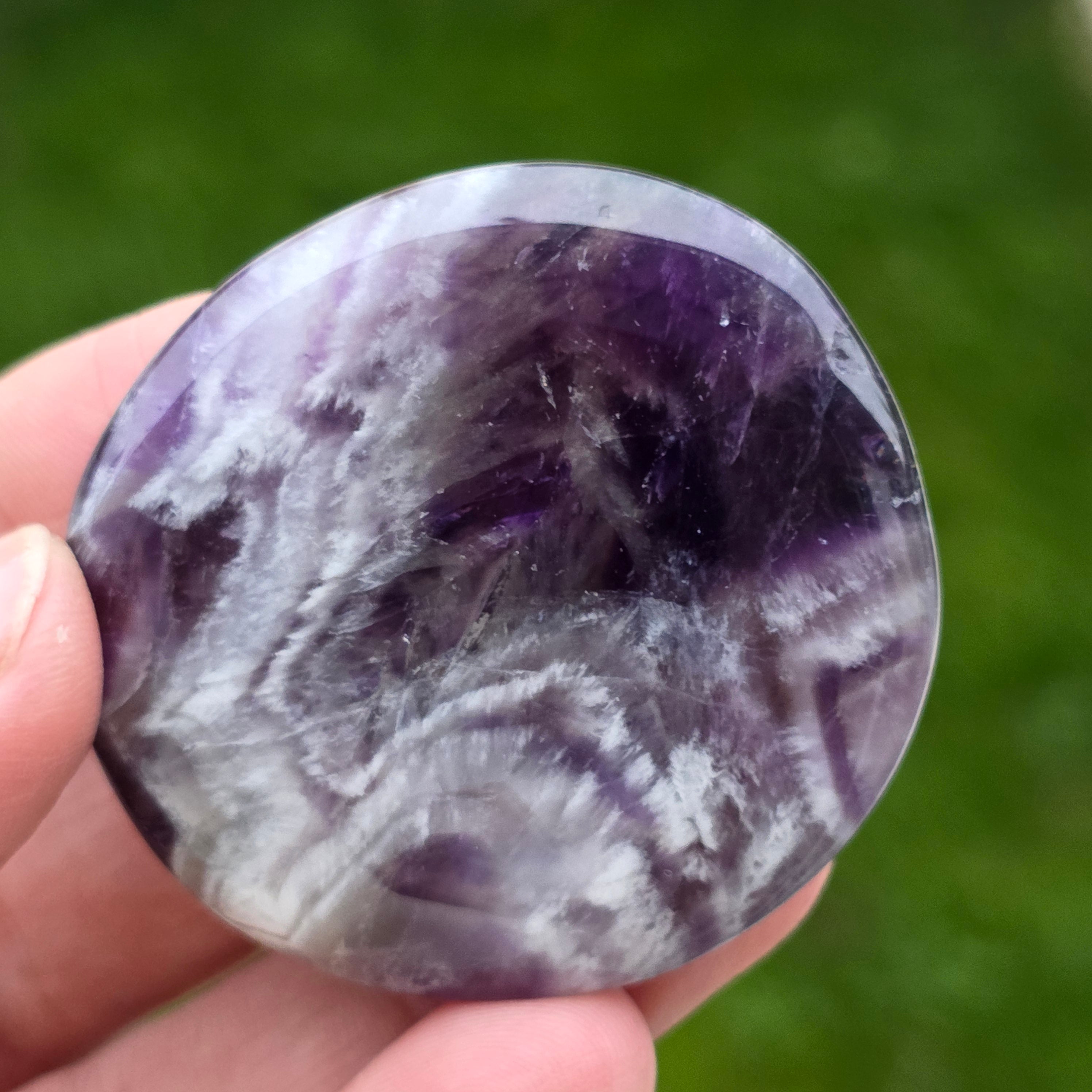 Ametistul chevron este recunoscut pentru asocierile cu chakrele coroana si al treilea ochi, crescand intuitia si capacitatea de a lua decizii.