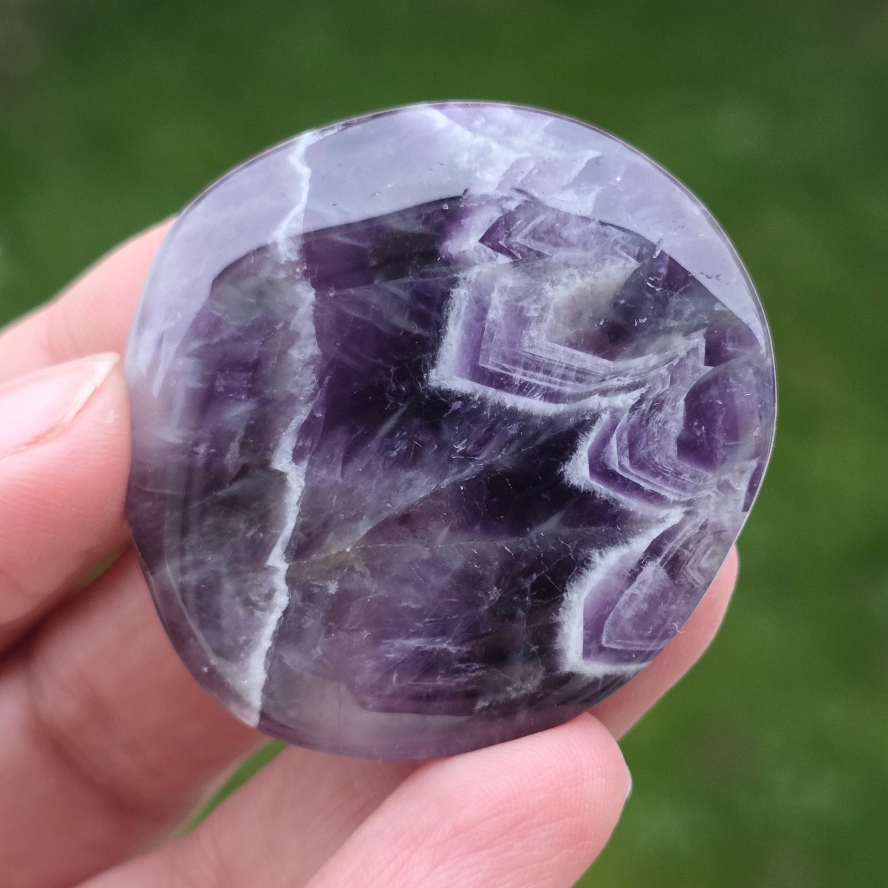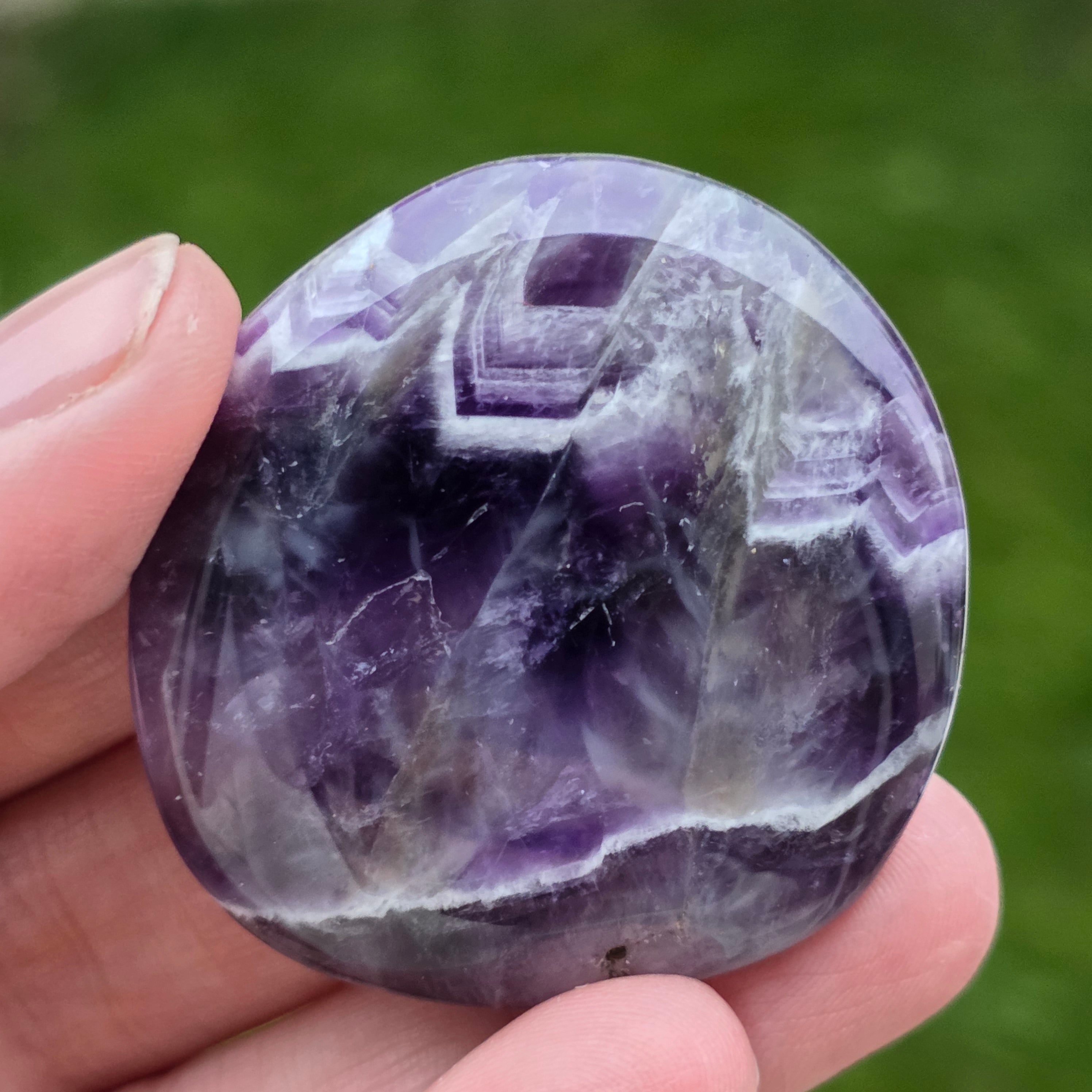 Ametistul chevron este recunoscut pentru asocierile cu chakrele coroana si al treilea ochi, crescand intuitia si capacitatea de a lua decizii.