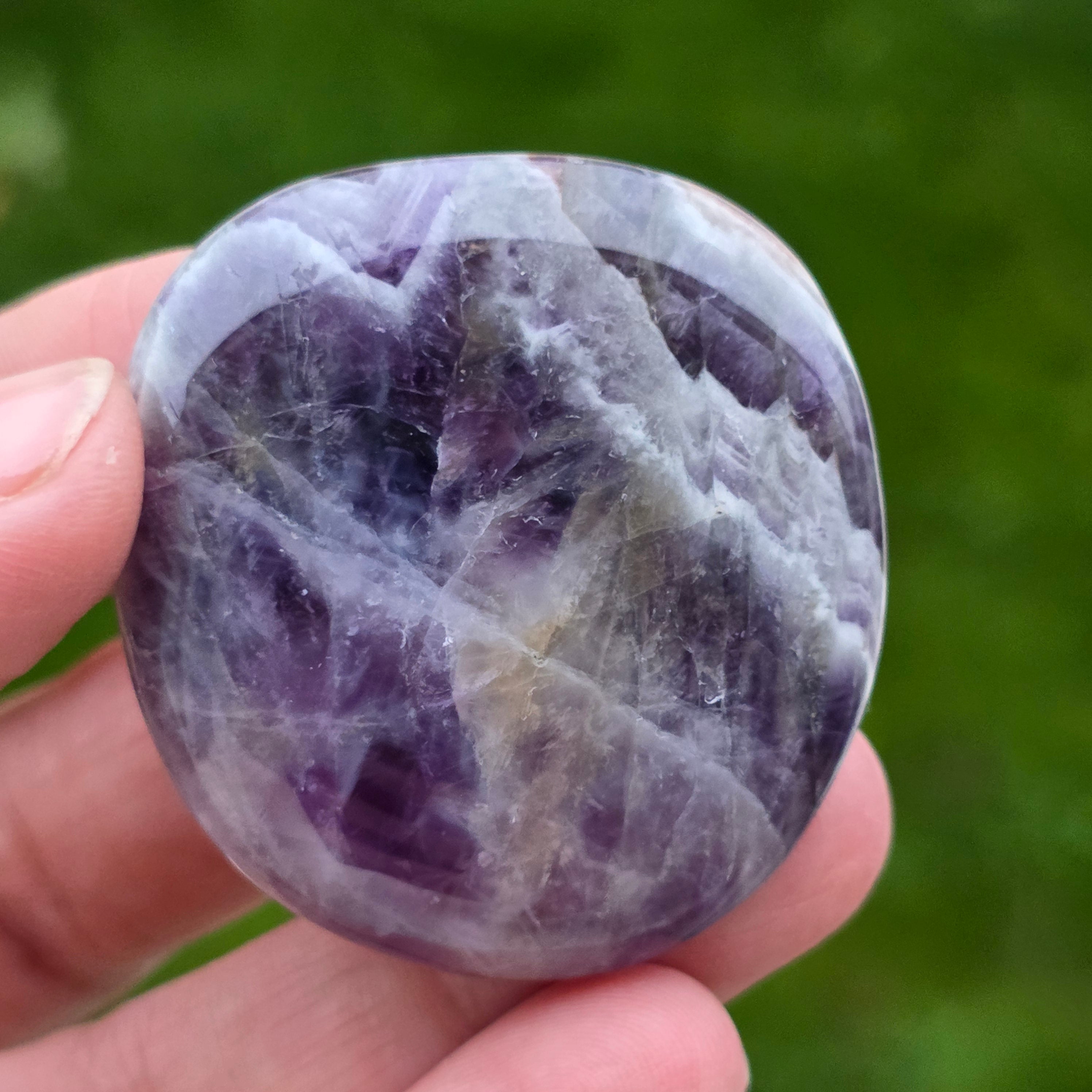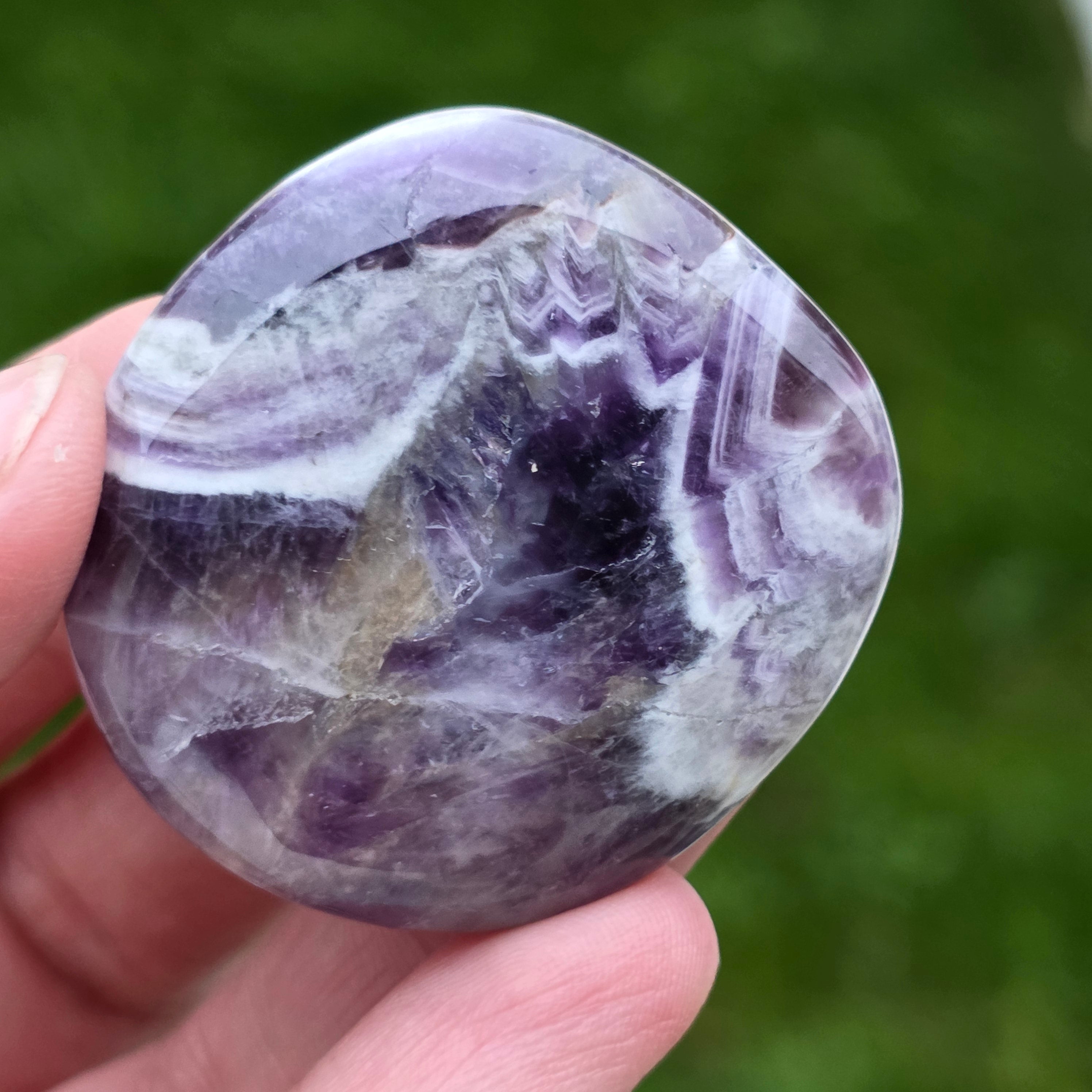 Ametistul chevron este recunoscut pentru asocierile cu chakrele coroana si al treilea ochi, crescand intuitia si capacitatea de a lua decizii.