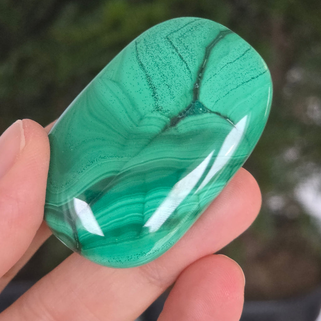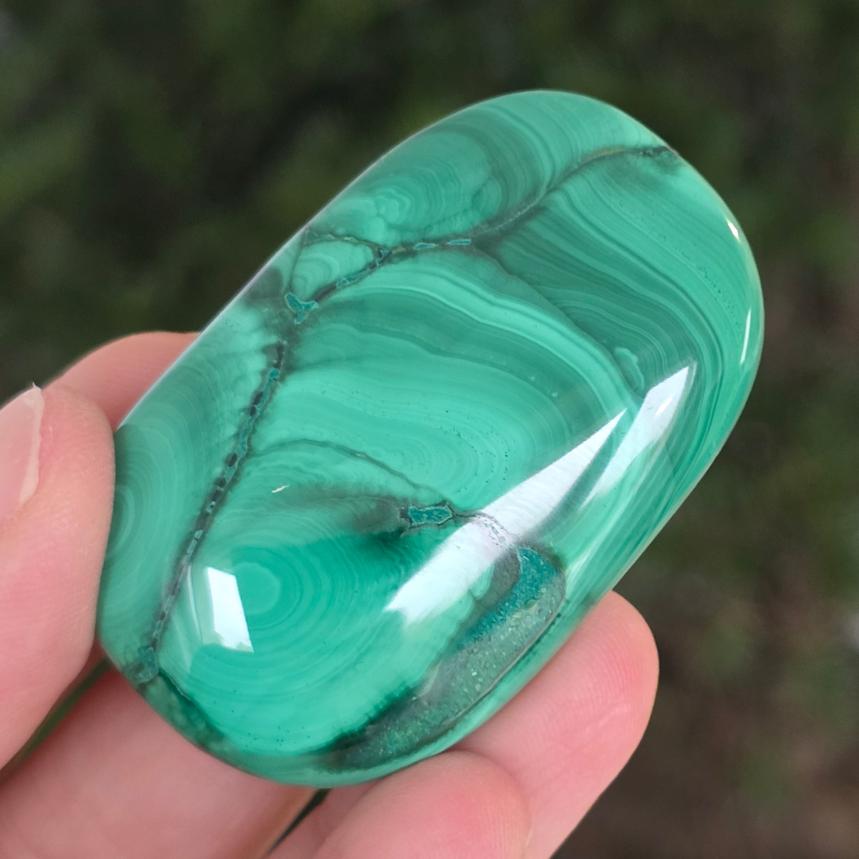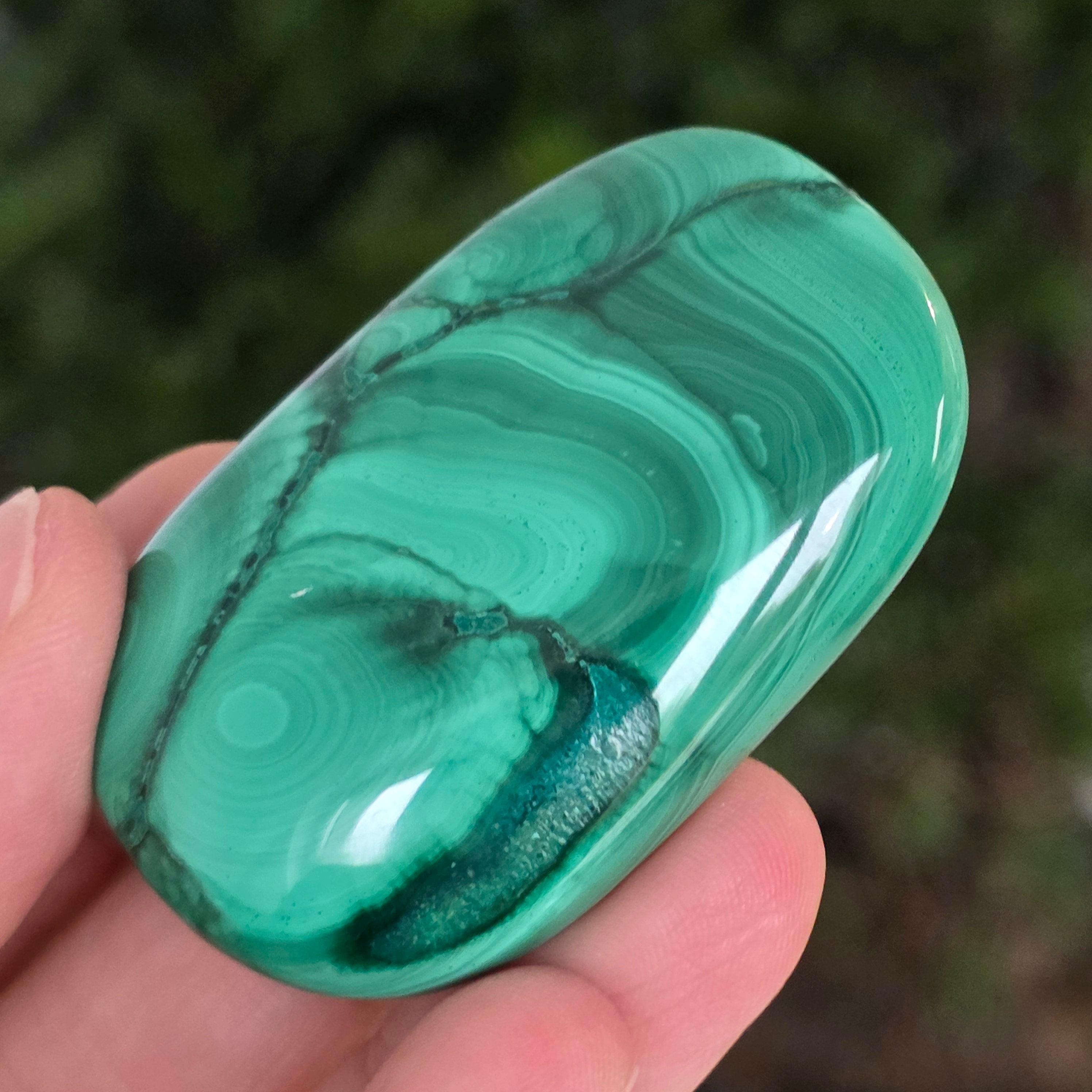 Un palmstone care pare să respire cu energia Pământului viu. Această piesă unicat din malachit natural, dezvăluie ondulații hipnotice de verde intens și smarald, traversate de inele și benzi concentrice ce par sculptate de însăși natura. Textura netedă, perfect șlefuită, face ca piatra să se așeze plăcut în palmă, emanând o vibrație caldă și protectoare.