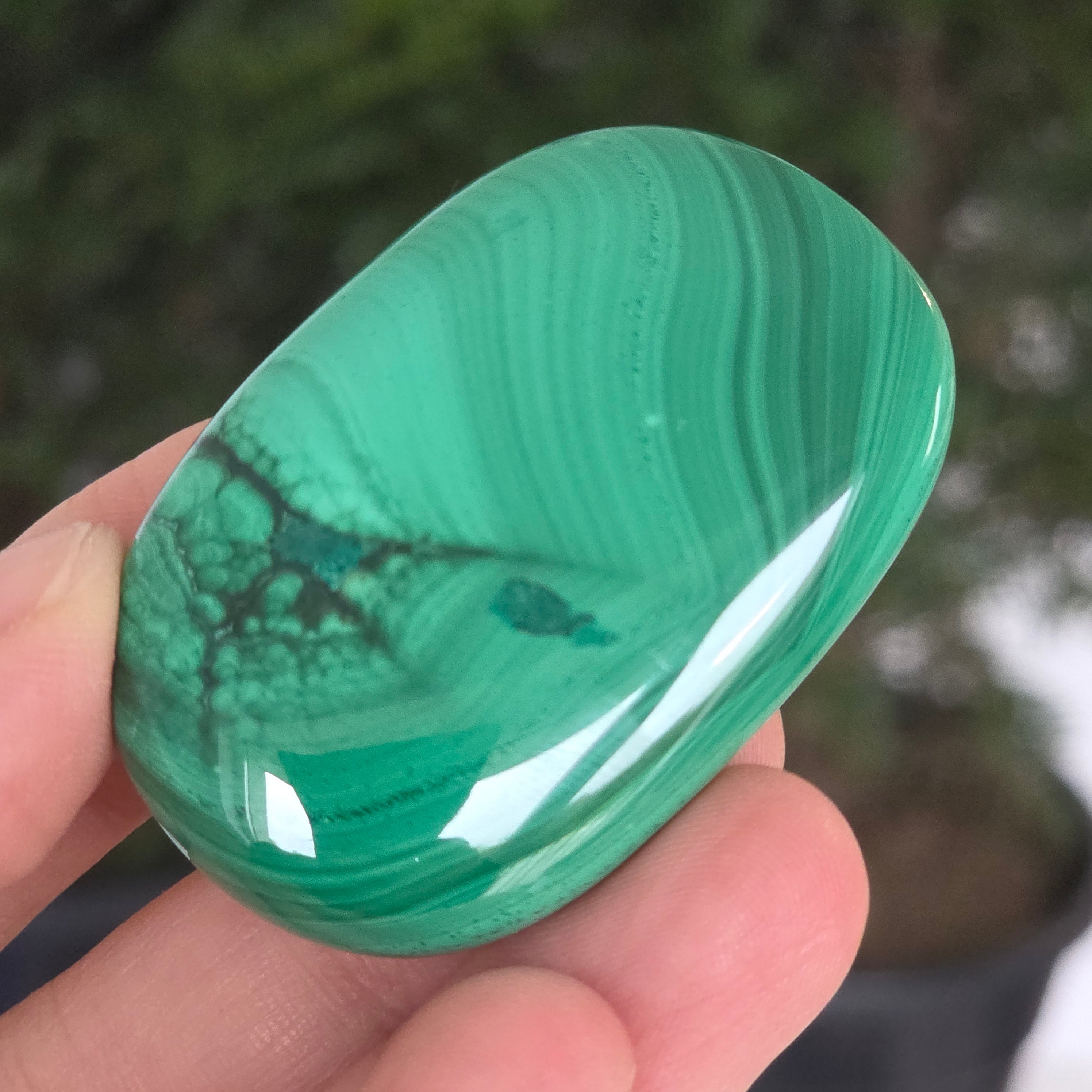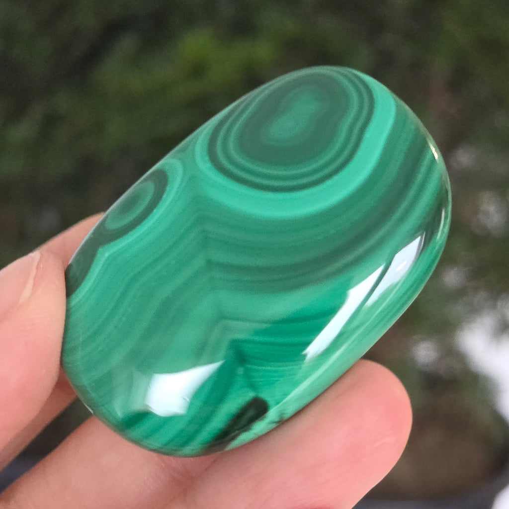 Un palmstone care pare să respire cu energia Pământului viu. Această piesă unicat din malachit natural, dezvăluie ondulații hipnotice de verde intens și smarald, traversate de inele și benzi concentrice ce par sculptate de însăși natura. Textura netedă, perfect șlefuită, face ca piatra să se așeze plăcut în palmă, emanând o vibrație caldă și protectoare.