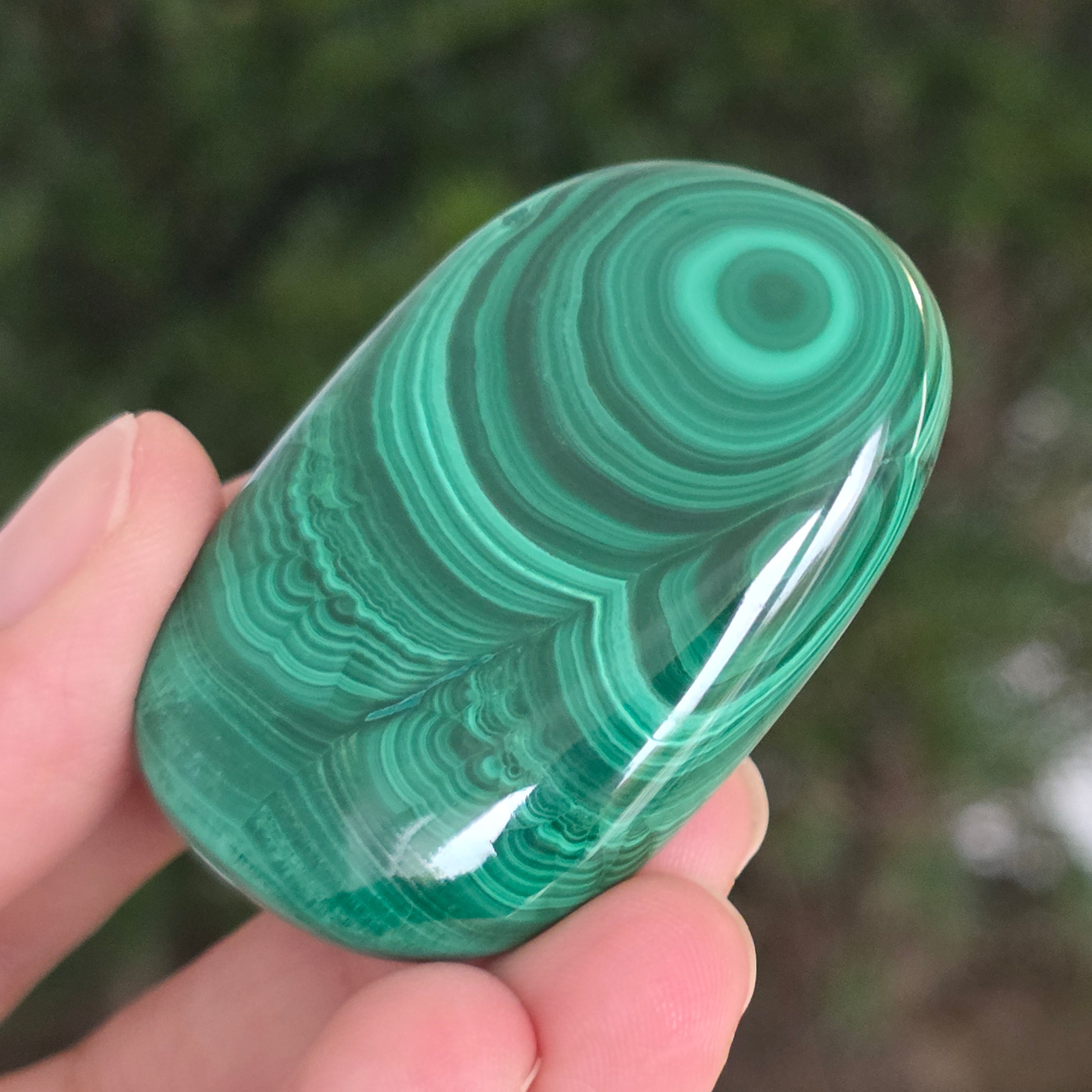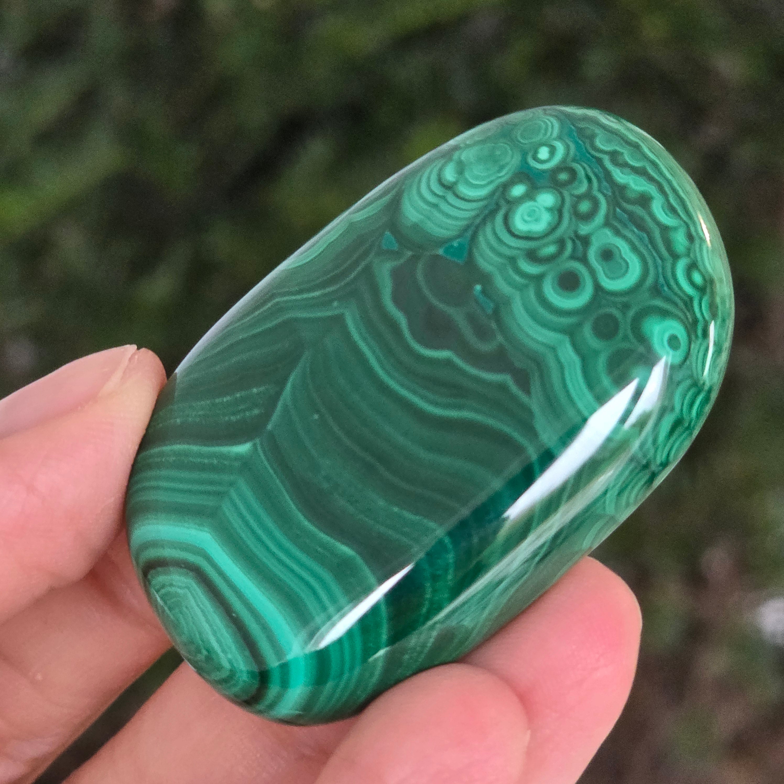 Un palmstone care pare să respire cu energia Pământului viu. Această piesă unicat din malachit natural, dezvăluie ondulații hipnotice de verde intens și smarald, traversate de inele și benzi concentrice ce par sculptate de însăși natura. Textura netedă, perfect șlefuită, face ca piatra să se așeze plăcut în palmă, emanând o vibrație caldă și protectoare.