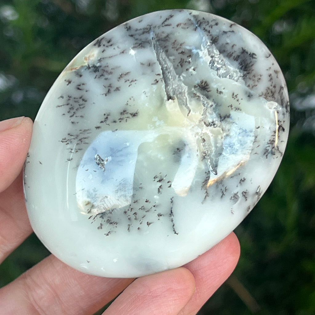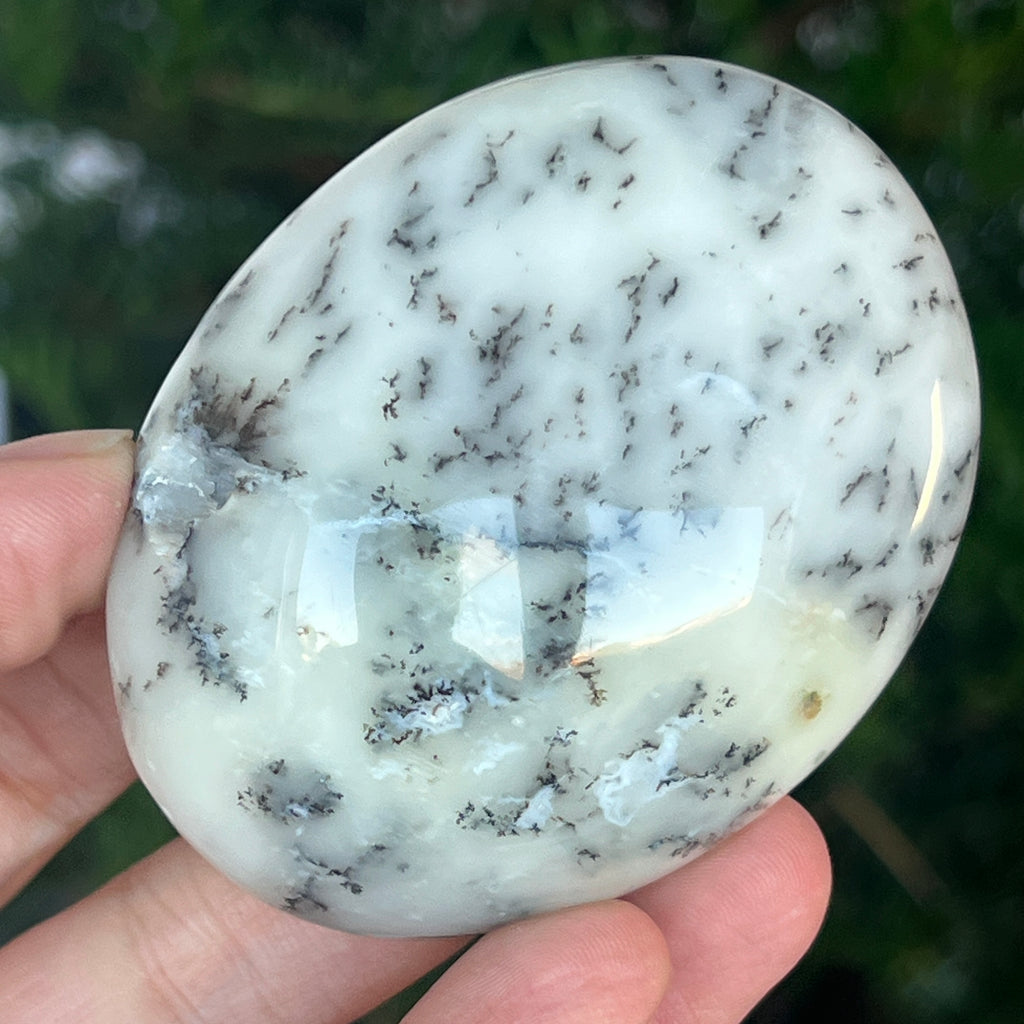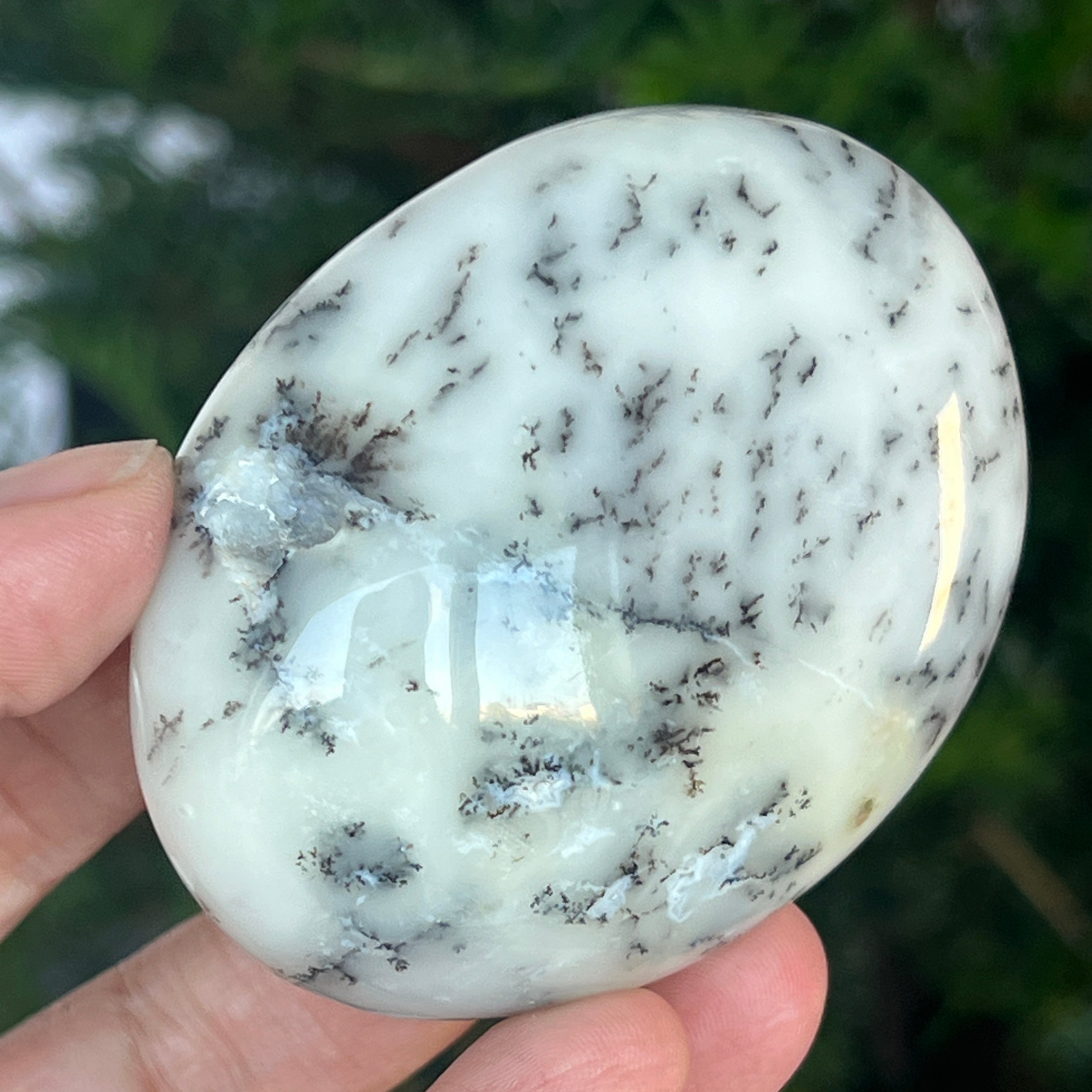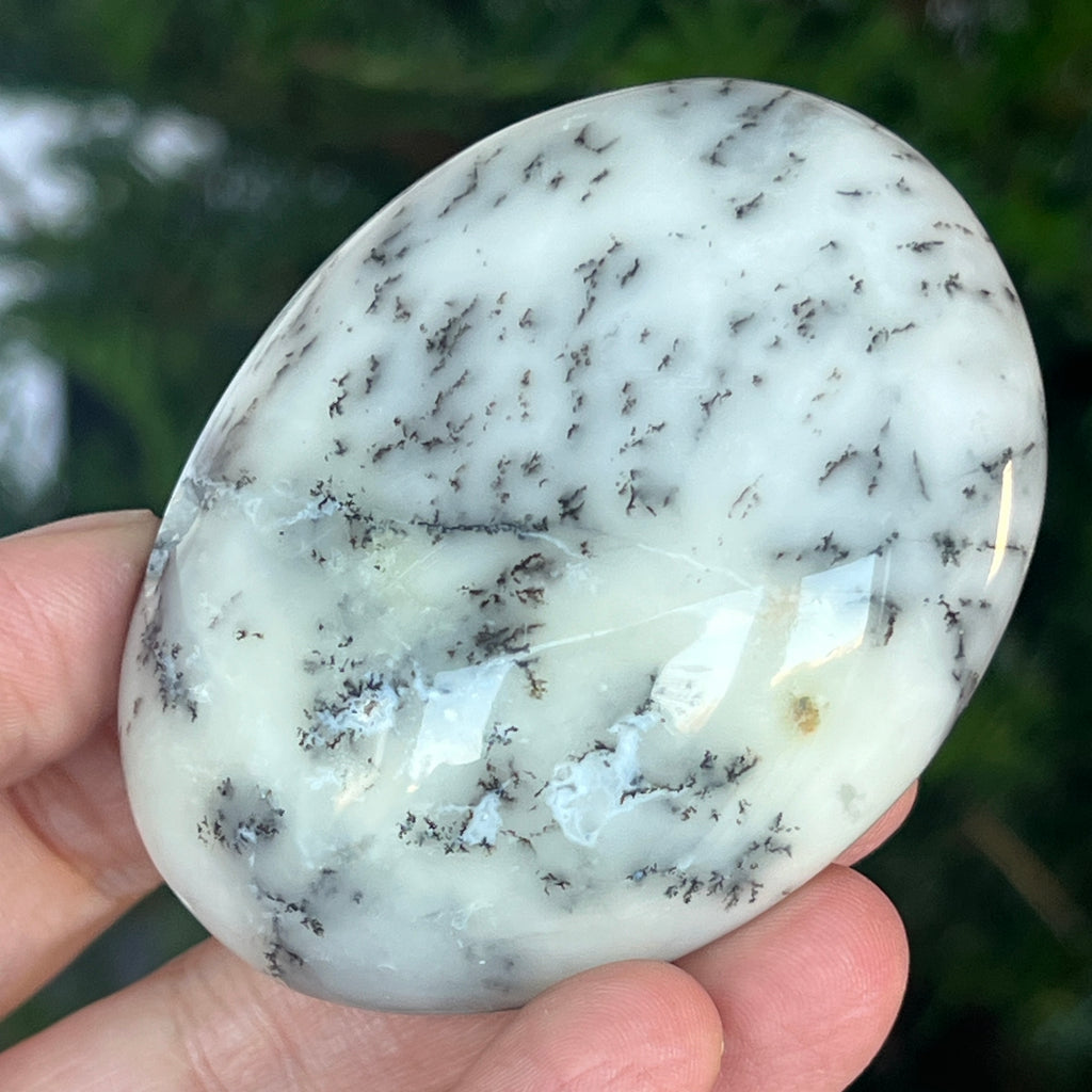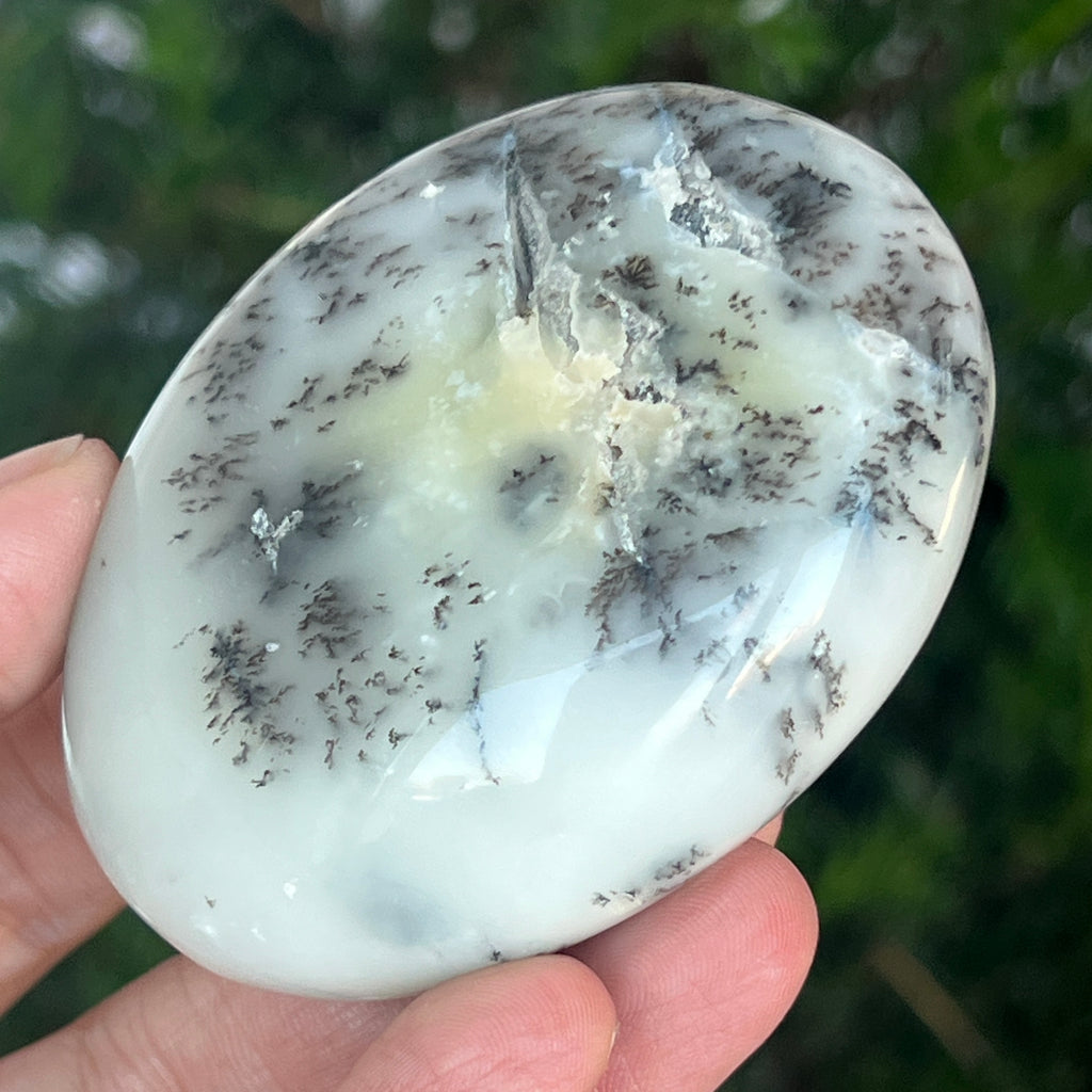 Acest palmstone din opal alb dendritic aduce o stare de pace și o ușoară expansiune a conștiinței. Ideal pentru meditație, pentru momente de reflecție sau pentru a fi păstrat ca piesă decorativă într-un spațiu sacru, el emană o frumusețe pură și organică, un echilibru între lumina albă și umbrele subtile ale naturii.