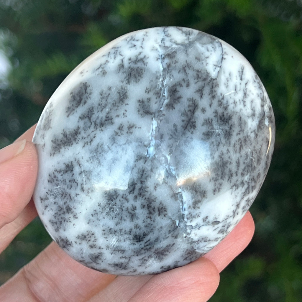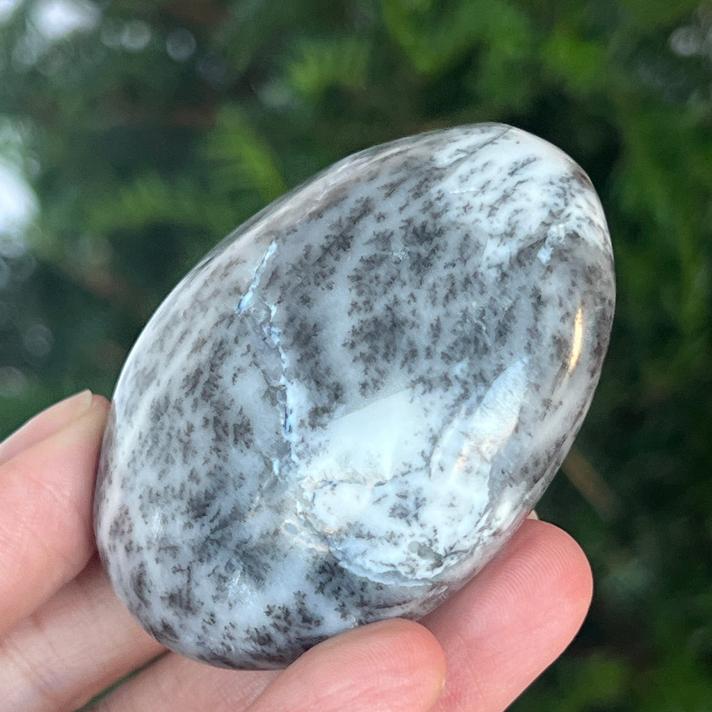 Acest palmstone din opal alb dendritic aduce o stare de pace și o ușoară expansiune a conștiinței. Ideal pentru meditație, pentru momente de reflecție sau pentru a fi păstrat ca piesă decorativă într-un spațiu sacru, el emană o frumusețe pură și organică, un echilibru între lumina albă și umbrele subtile ale naturii.