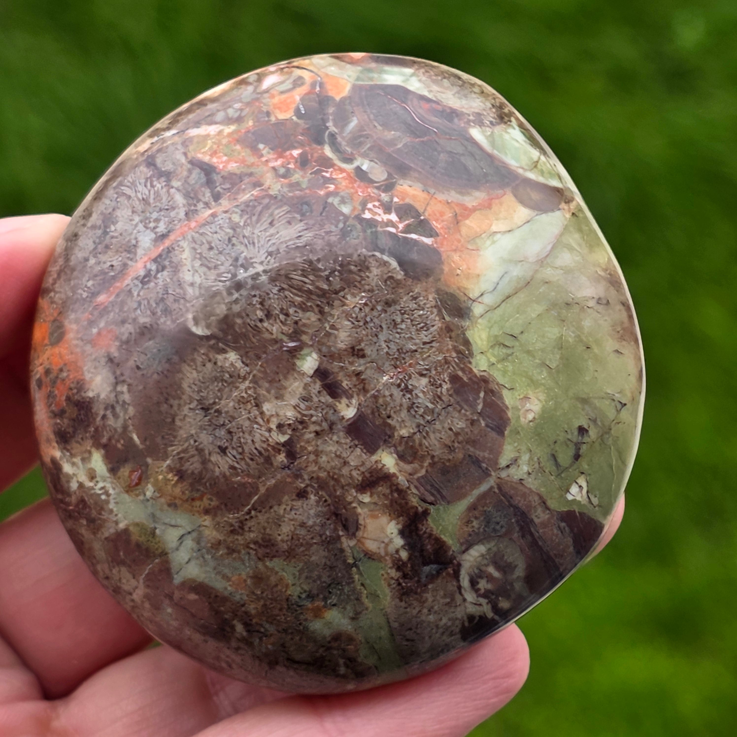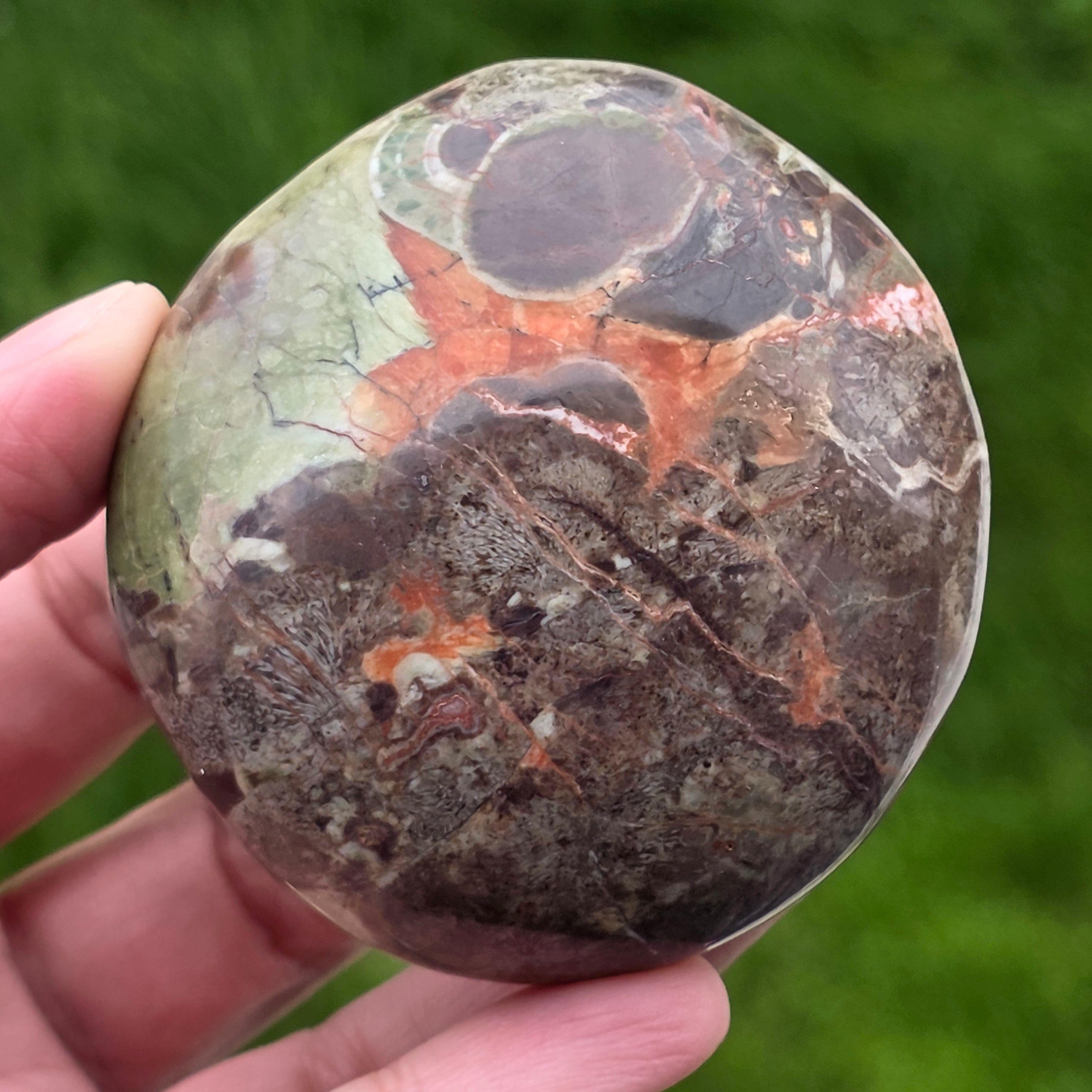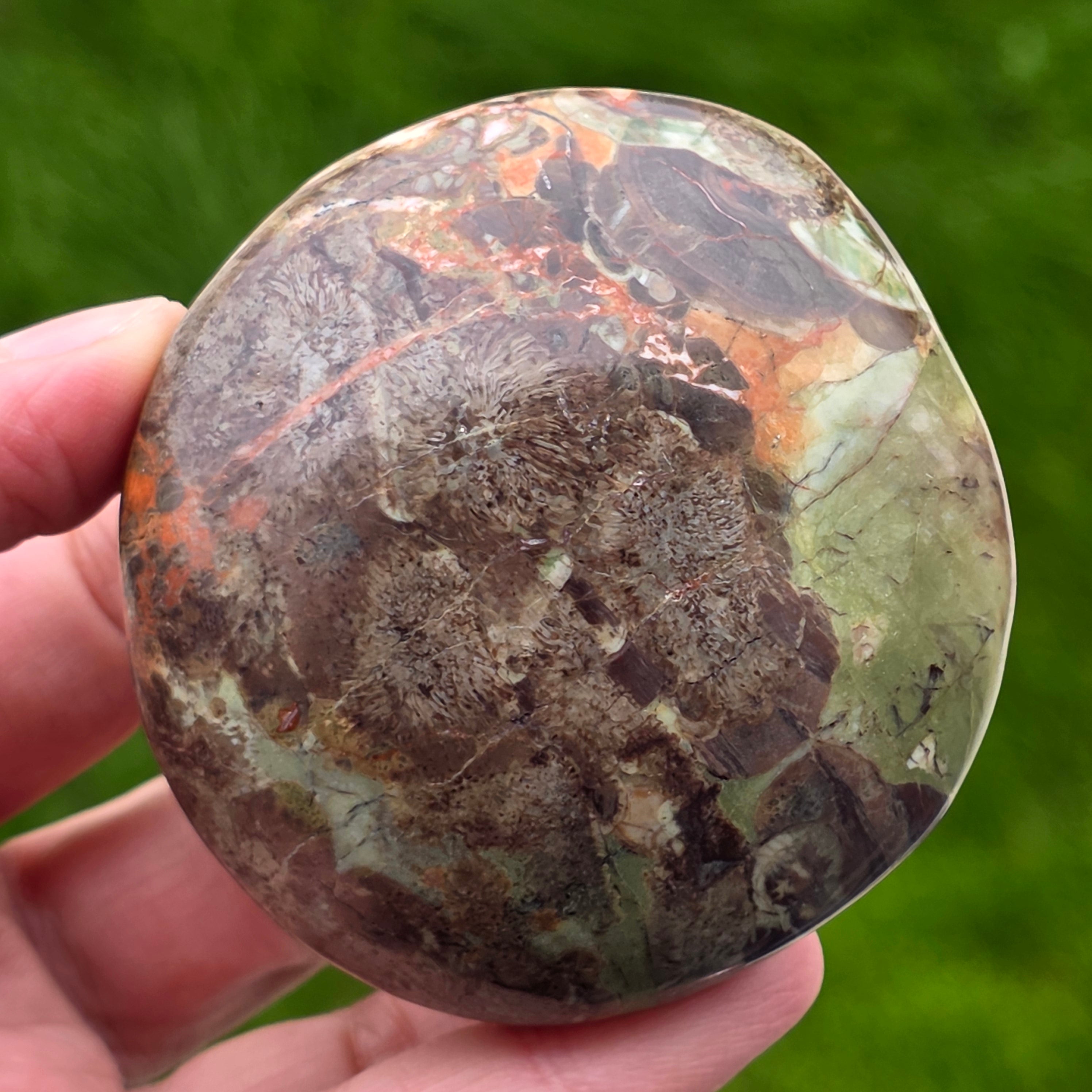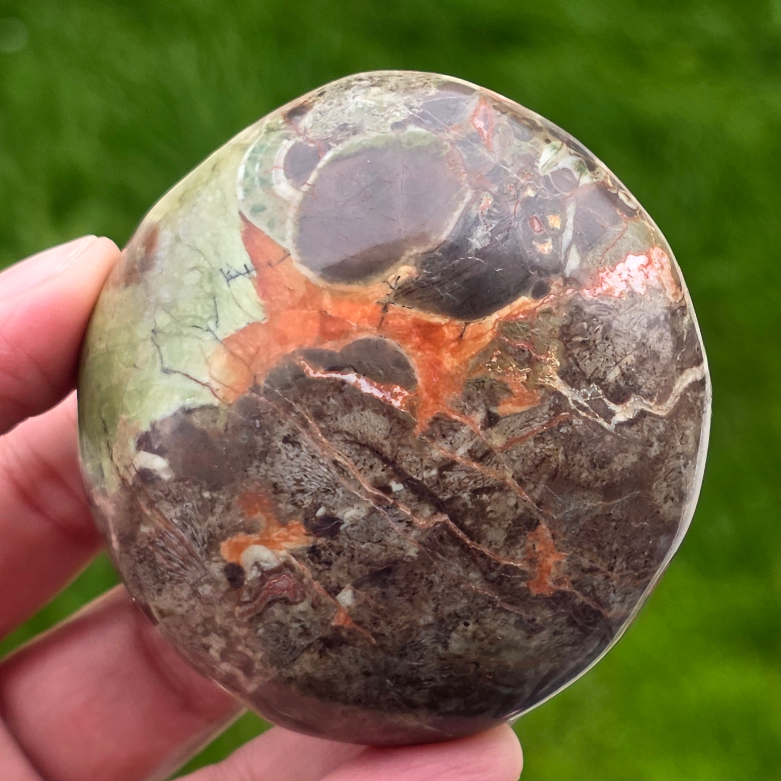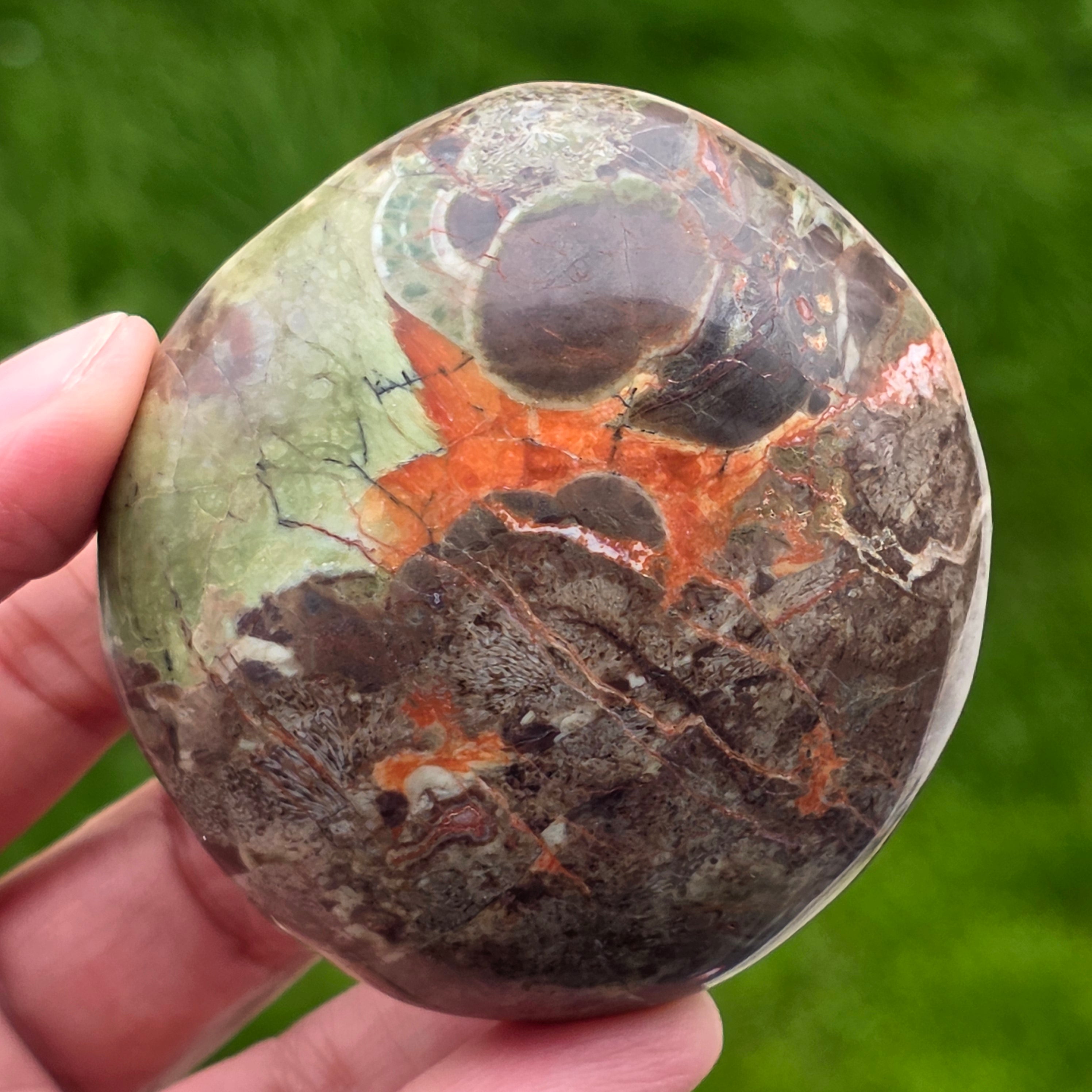 Această piatră șlefuită cu grijă încape perfect în palmă, purtând în ea energia tăcută a munților și forța unei lumi modelate de foc. Riolitul de munte cu nuanțe calde de maro, accente de verde mineral și irizații de portocaliu vulcanic ne amintește de pădurile dense, pământul umed și cerul în flăcări de la apus.