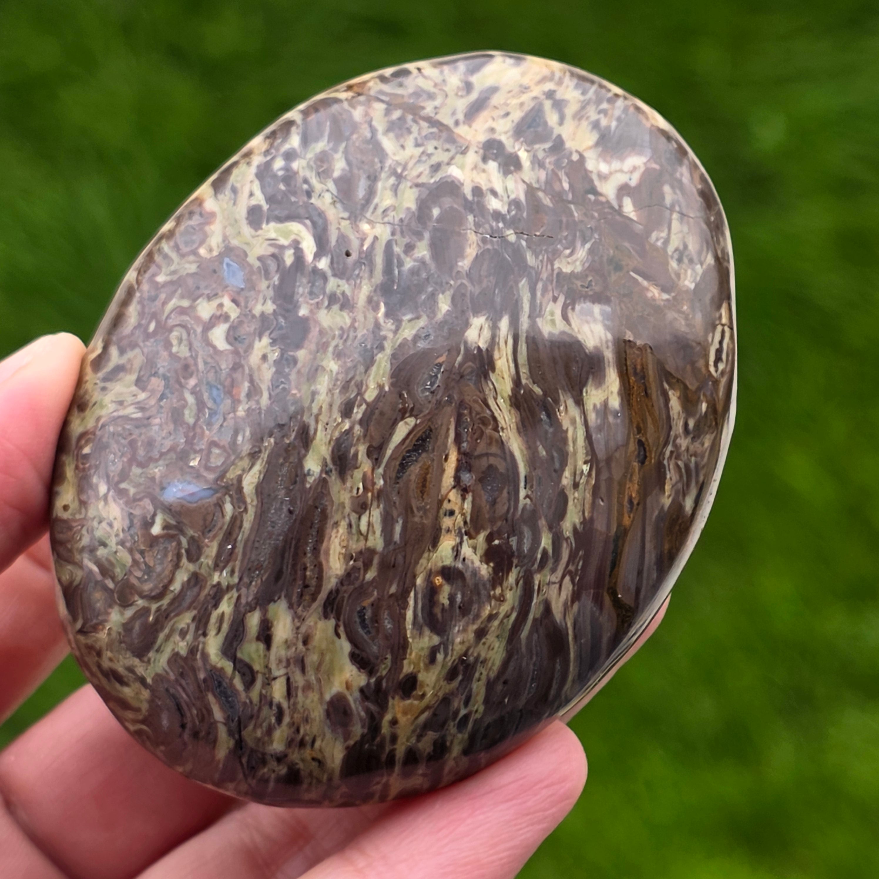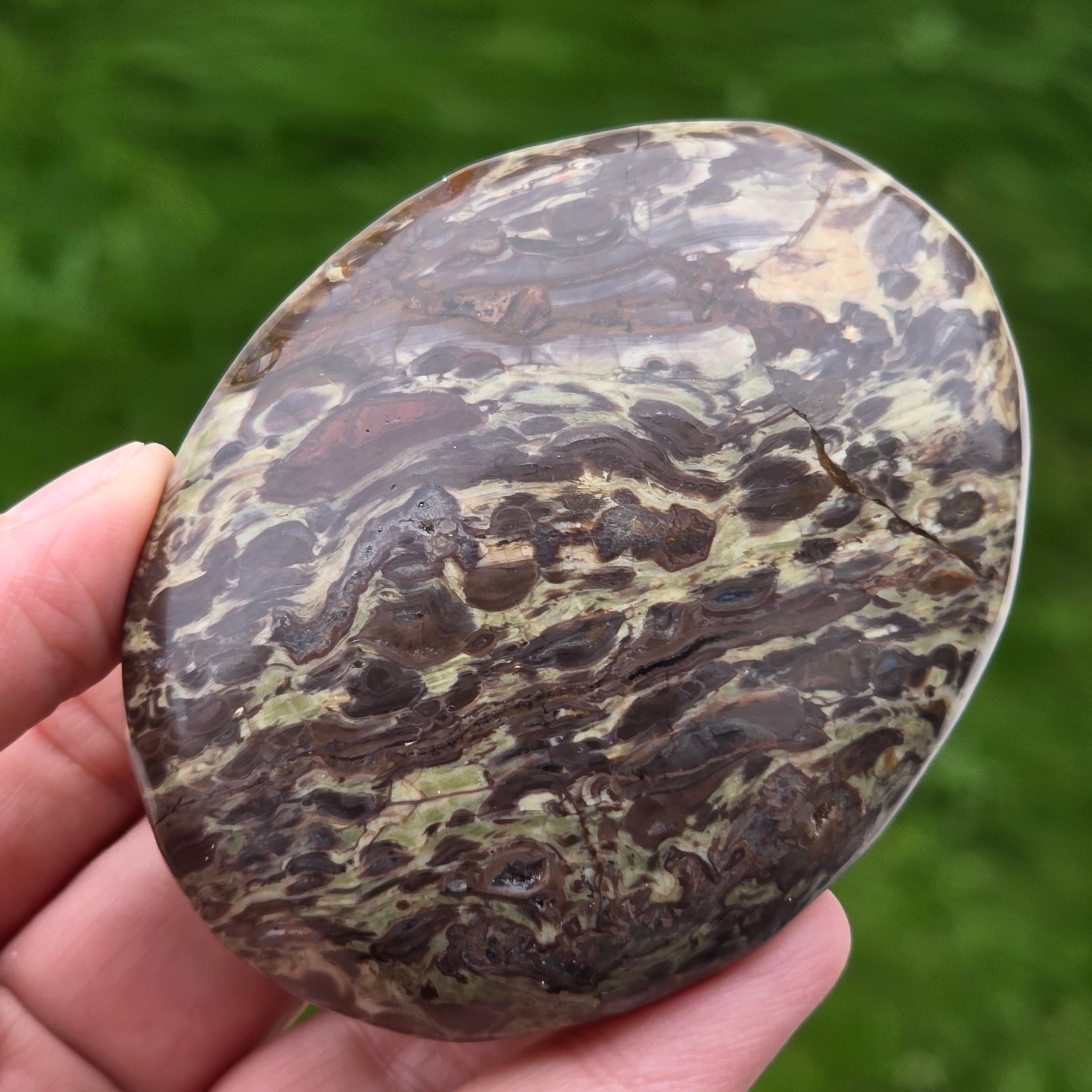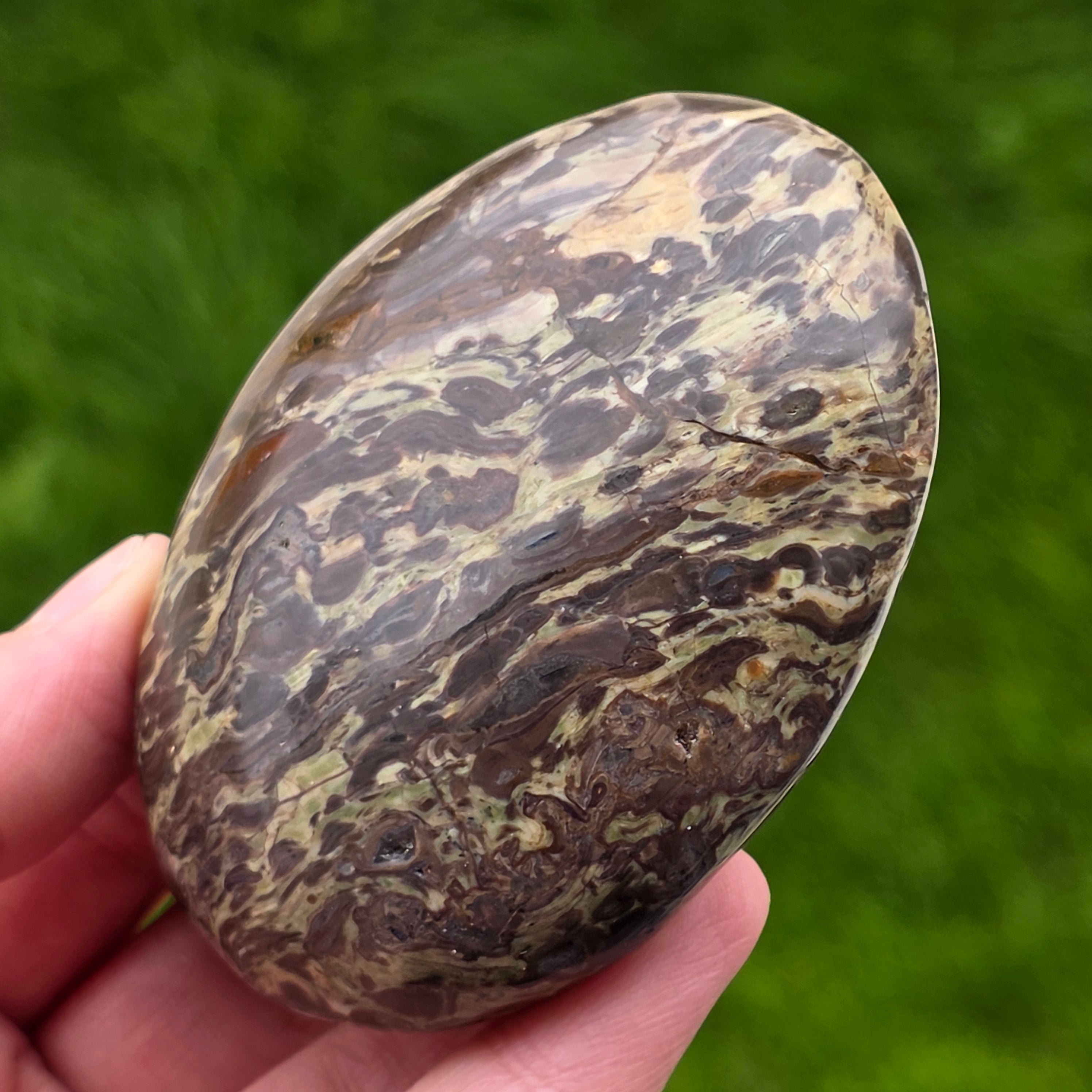 Această piatră șlefuită cu grijă încape perfect în palmă, purtând în ea energia tăcută a munților și forța unei lumi modelate de foc. Riolitul de munte cu nuanțe calde de maro, accente de verde mineral și irizații de portocaliu vulcanic ne amintește de pădurile dense, pământul umed și cerul în flăcări de la apus.