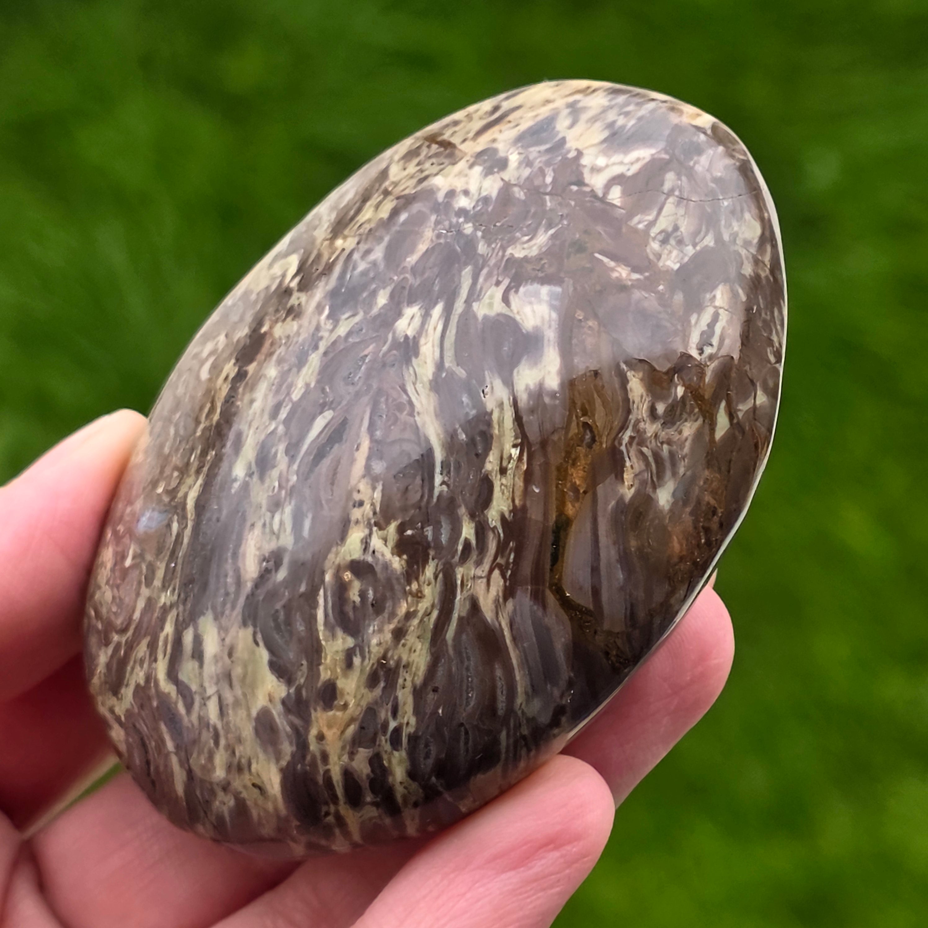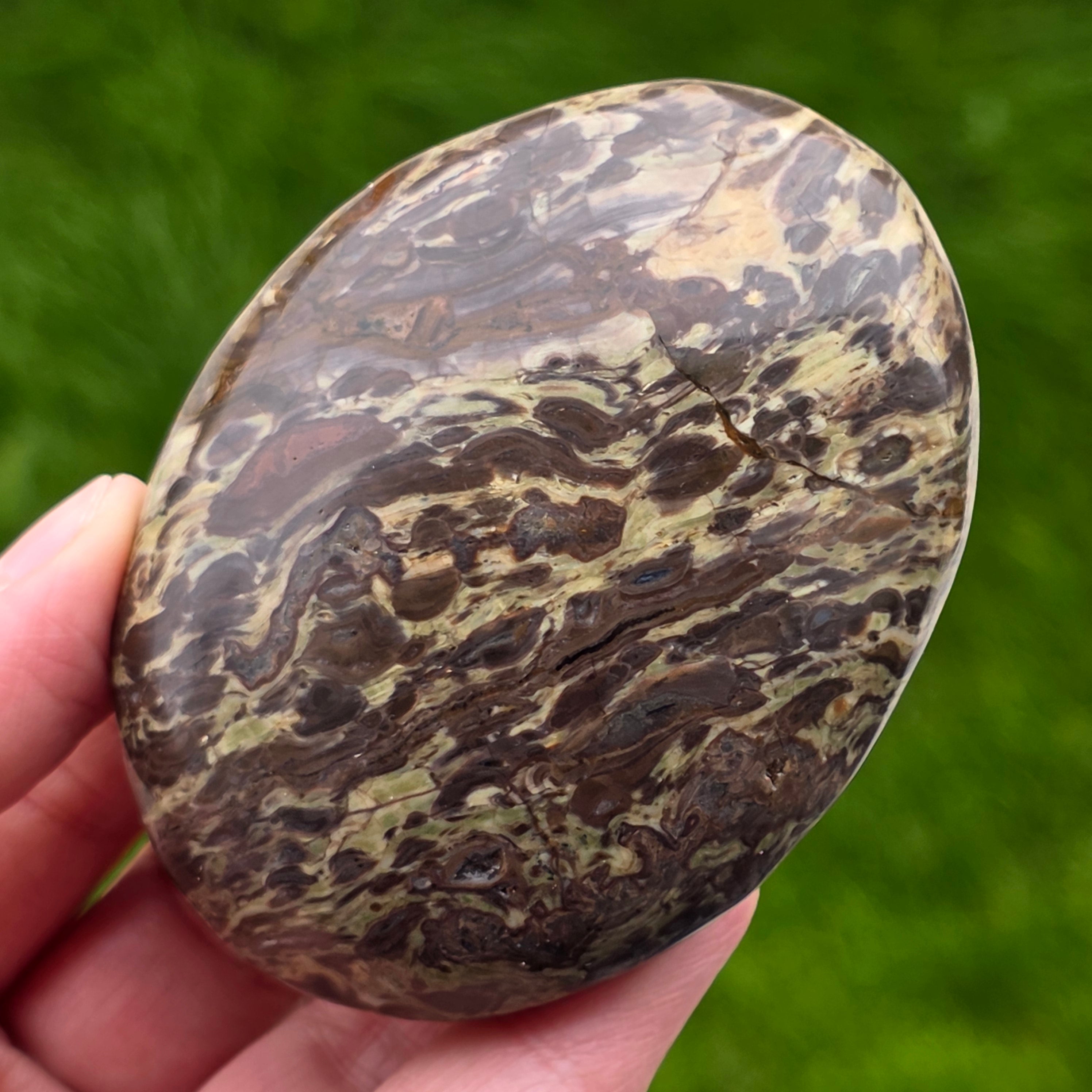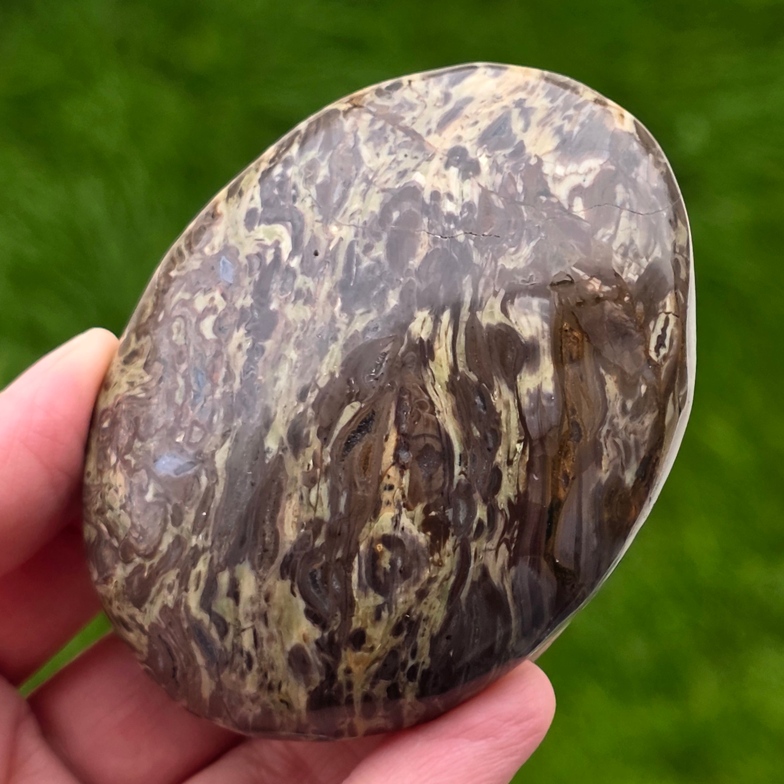 Această piatră șlefuită cu grijă încape perfect în palmă, purtând în ea energia tăcută a munților și forța unei lumi modelate de foc. Riolitul de munte cu nuanțe calde de maro, accente de verde mineral și irizații de portocaliu vulcanic ne amintește de pădurile dense, pământul umed și cerul în flăcări de la apus.