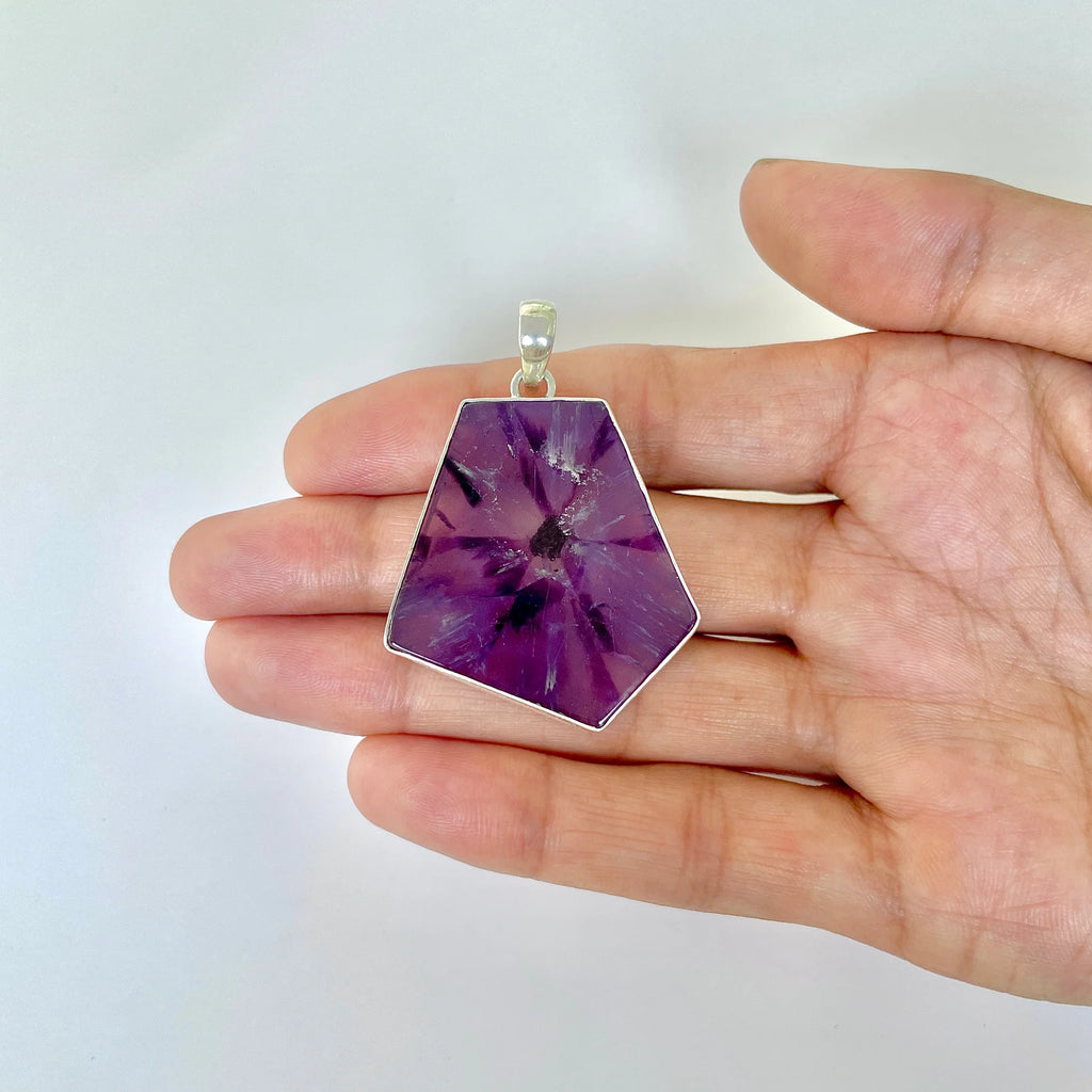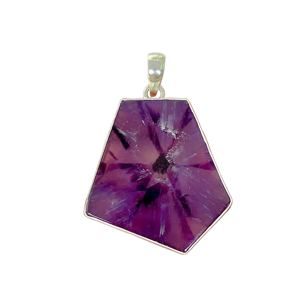 Acest pandantiv din argint 925 cu ametist star este o piesă unicat, ce dezvăluie frumusețea ascunsă în inima cristalelor. Secțiunea naturală de ametist arată un efect optic fascinant, sub formă de stea minerală ce se deschide din centru în nuanțe profunde de violet, cu accente albe și umbre întunecate. Este ca și cum universul ar fi fost surprins într-o singură piatră.