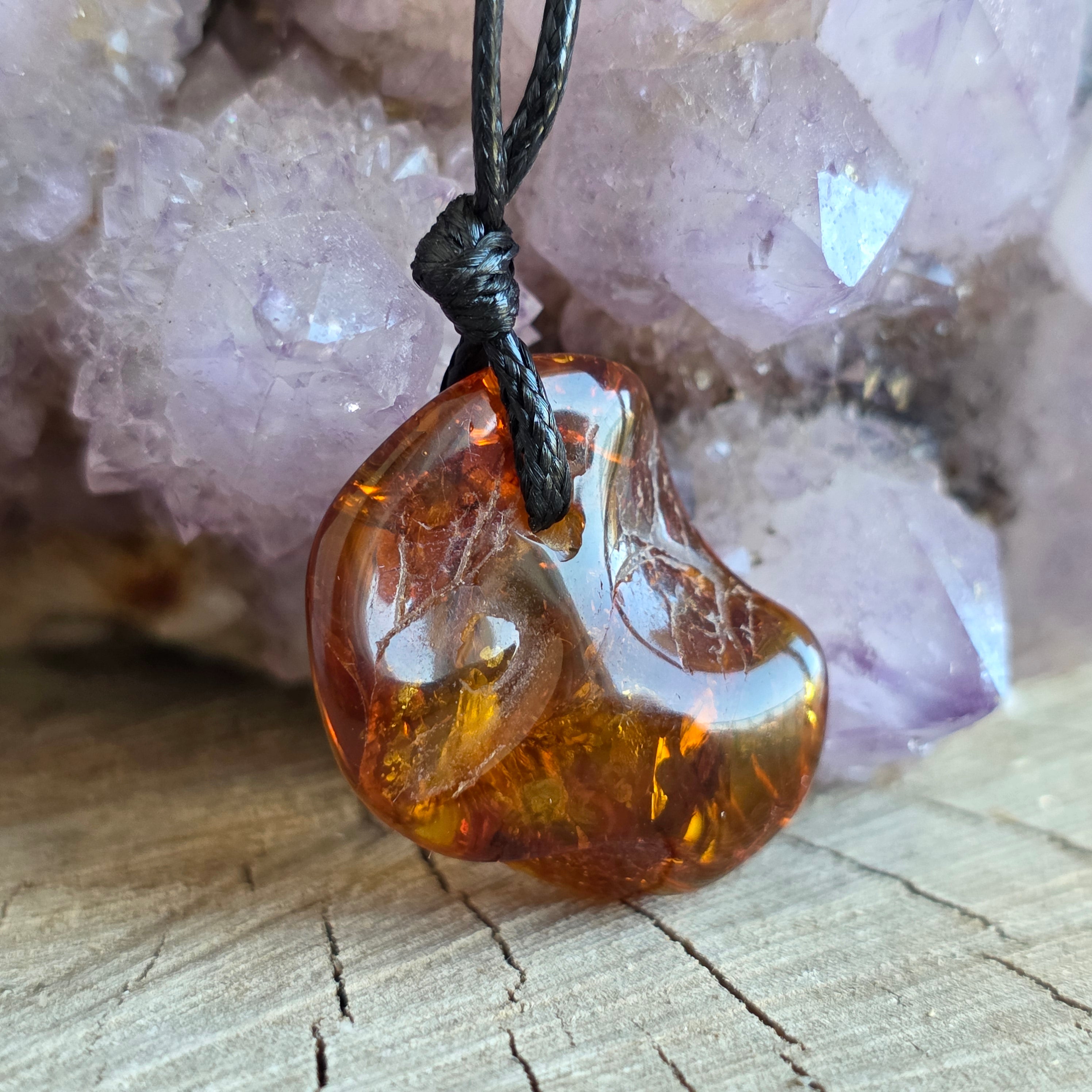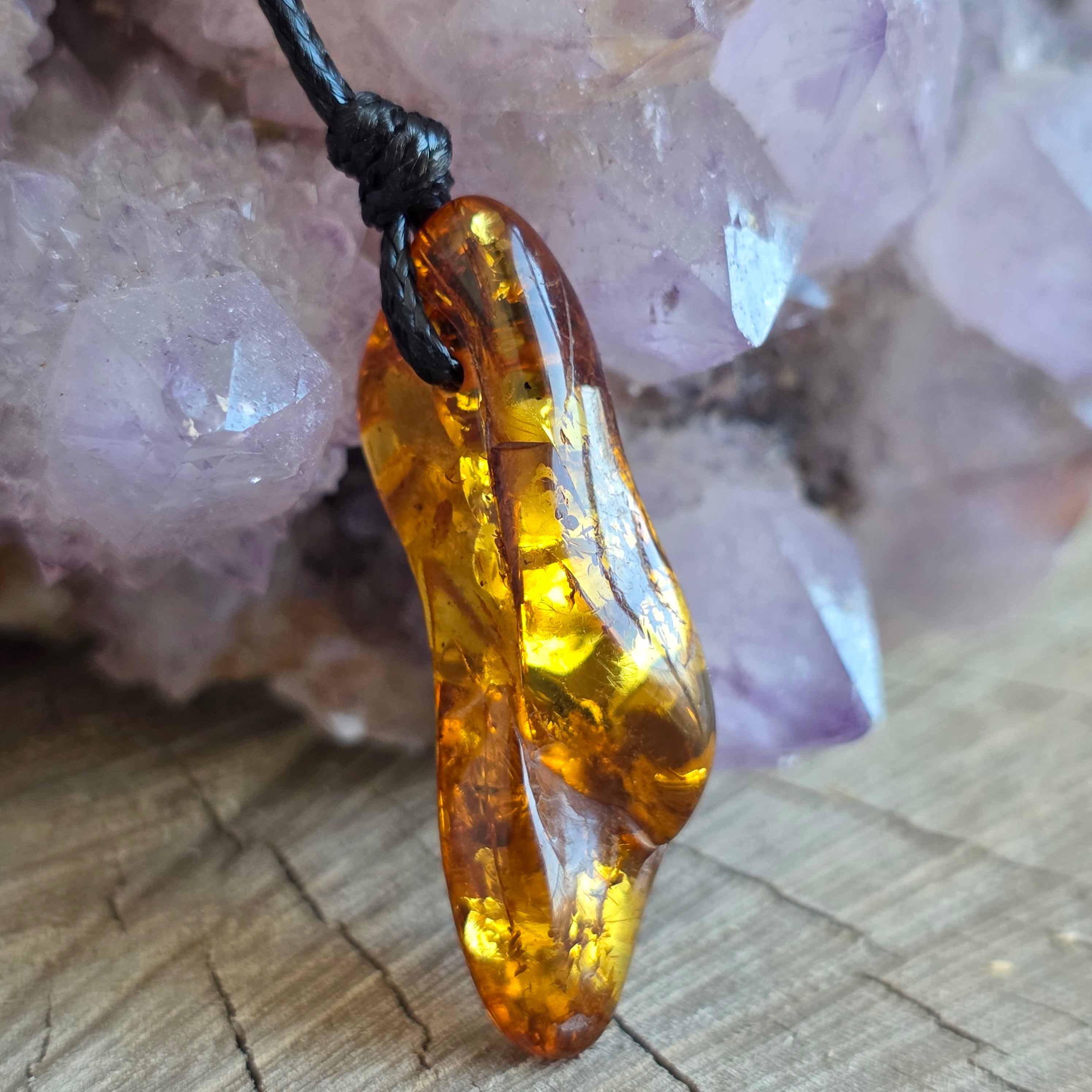 Poartă acest pandantiv din chihlimbar natural ca pe o rază de soare prinsă în bijuterie — o amintire vie a luminii care nu se stinge niciodată, indiferent de trecerea timpului.