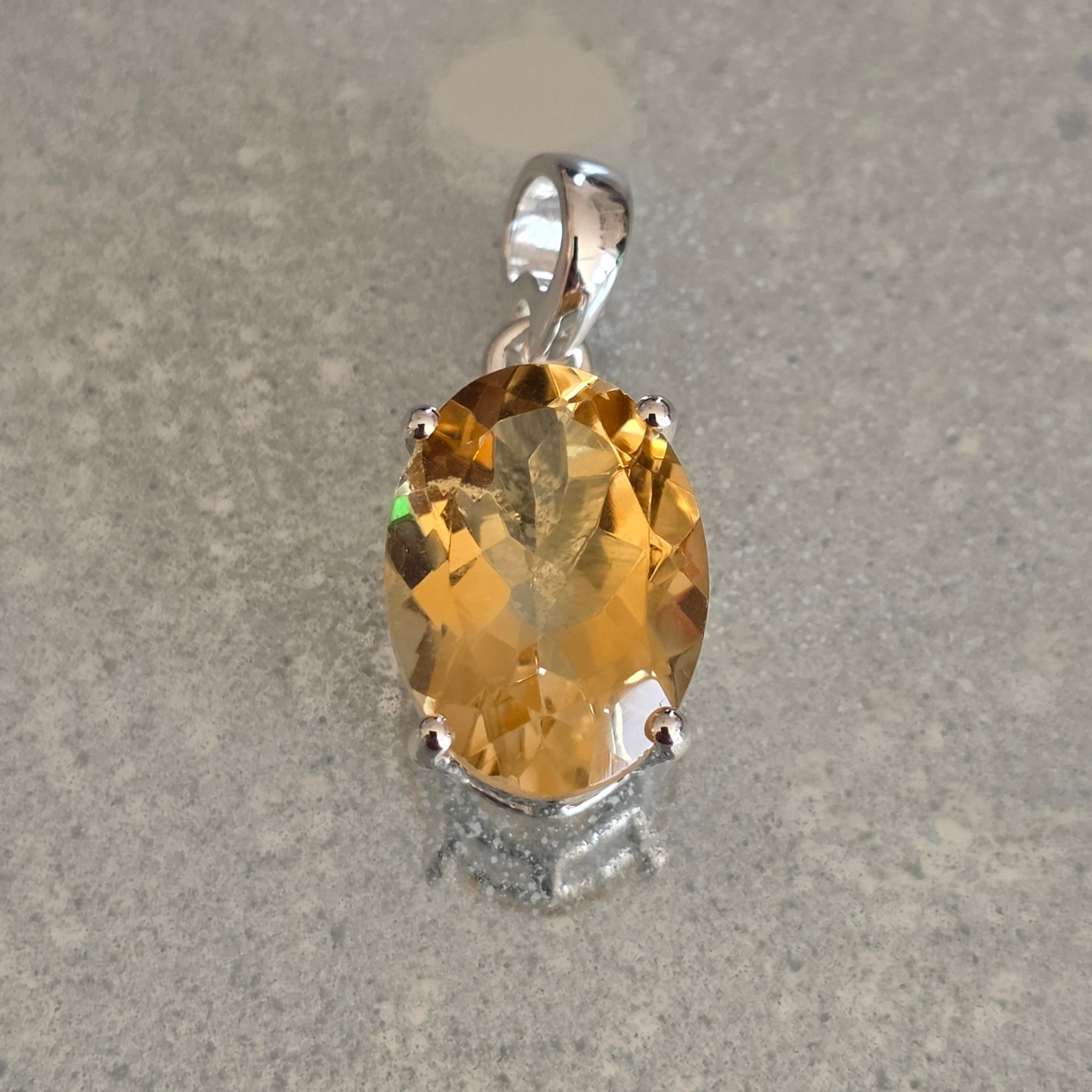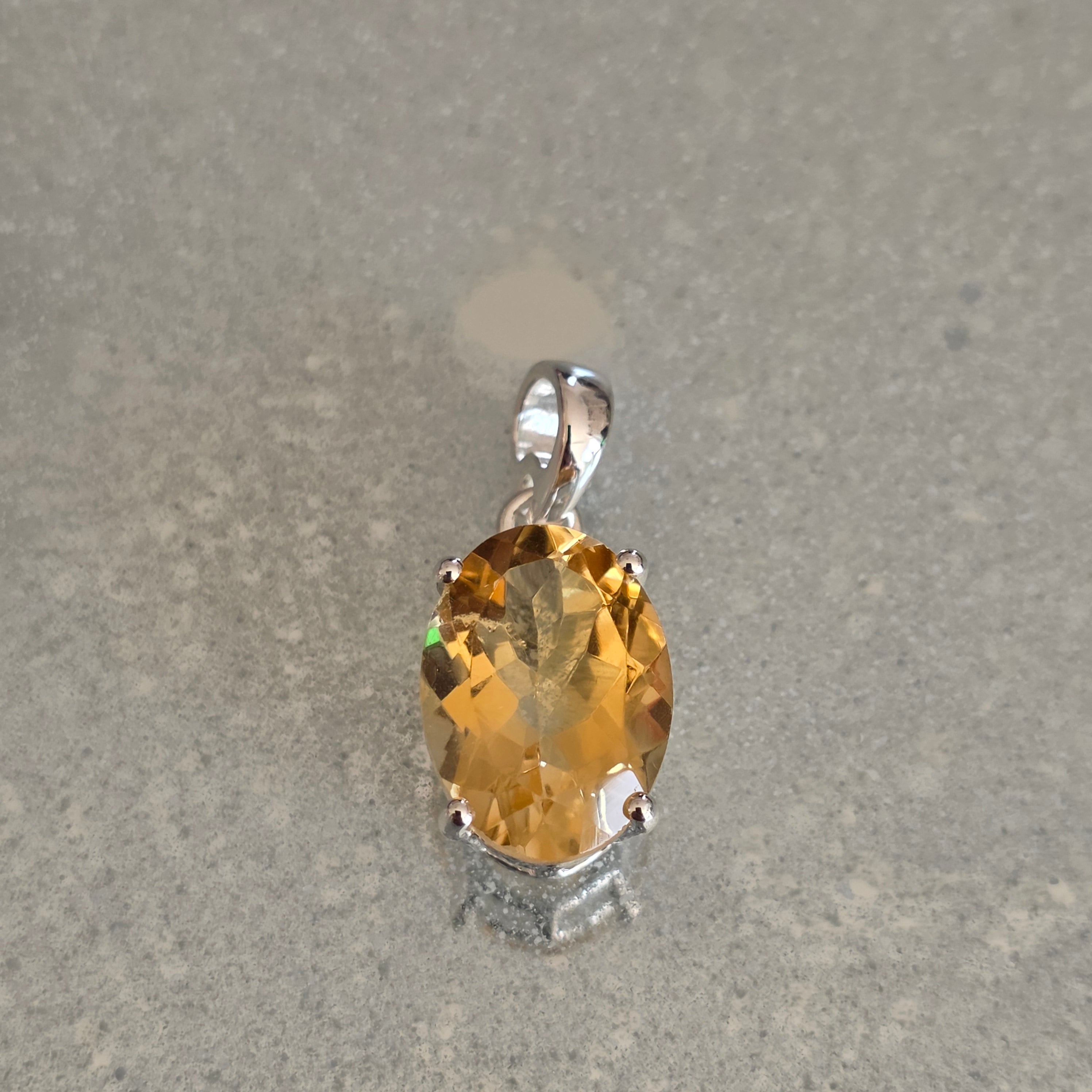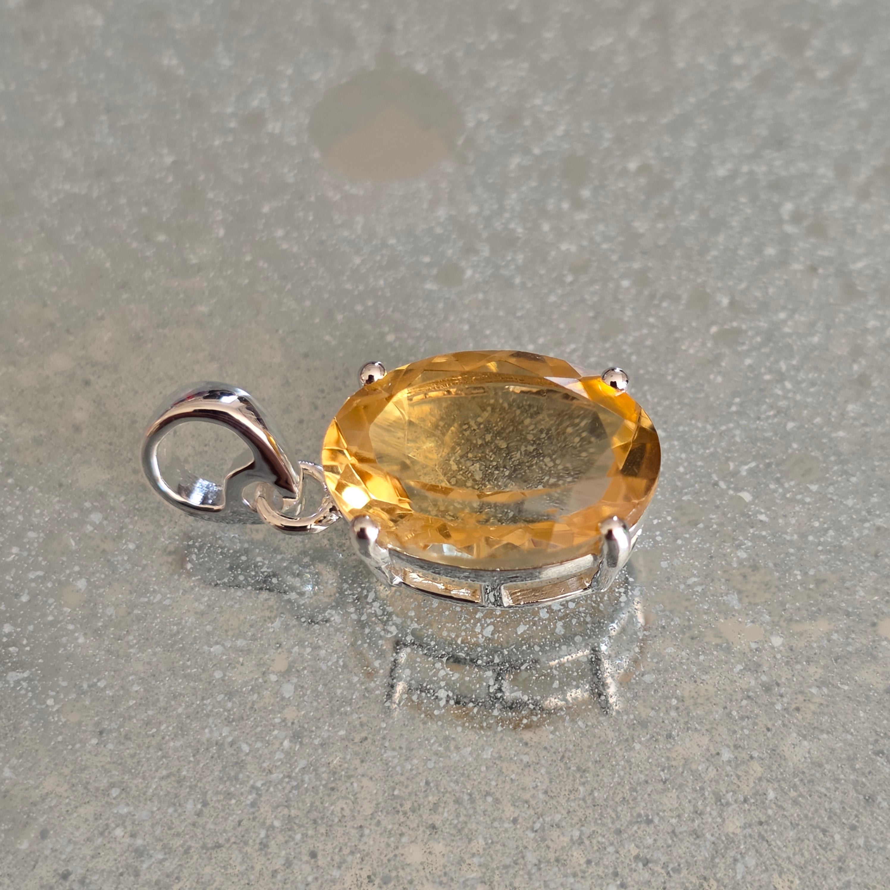 Un pandantiv cu o prezență elegantă și luminoasă, în care citrinul de dimensiune generoasă devine punctul central al întregii compoziții. Forma ovală evidențiază profunzimea și claritatea pietrei, permițând luminii să îi pună în valoare fiecare fațetă.