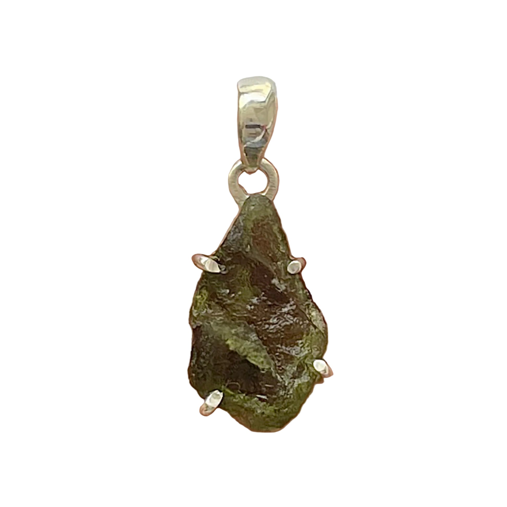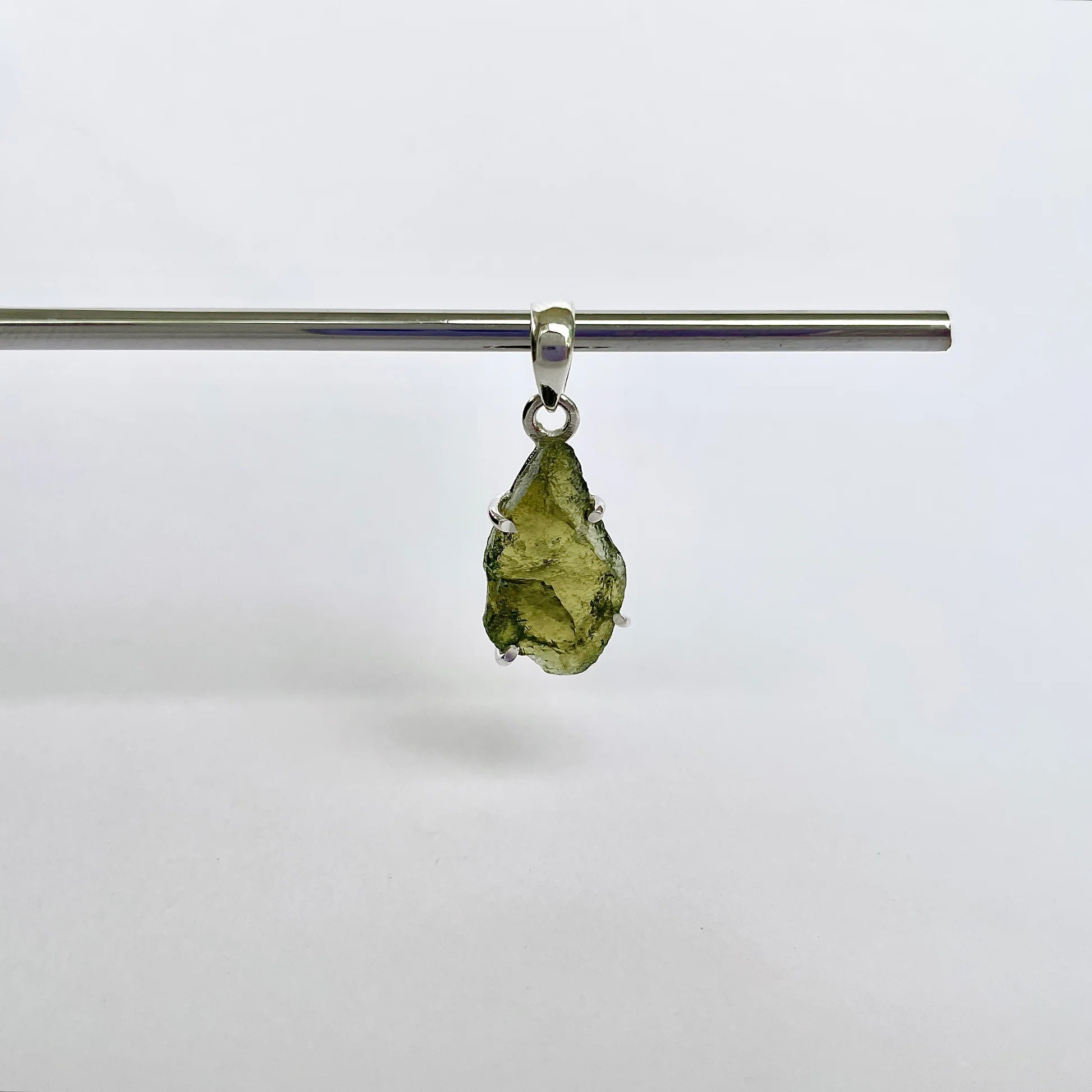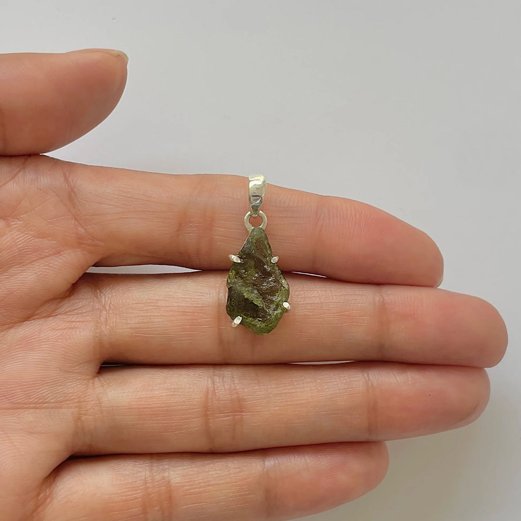 Un pandantiv rar și autentic, cu moldavit brut, montat minimalist în argint 925 pentru a evidenția forma sa naturală.