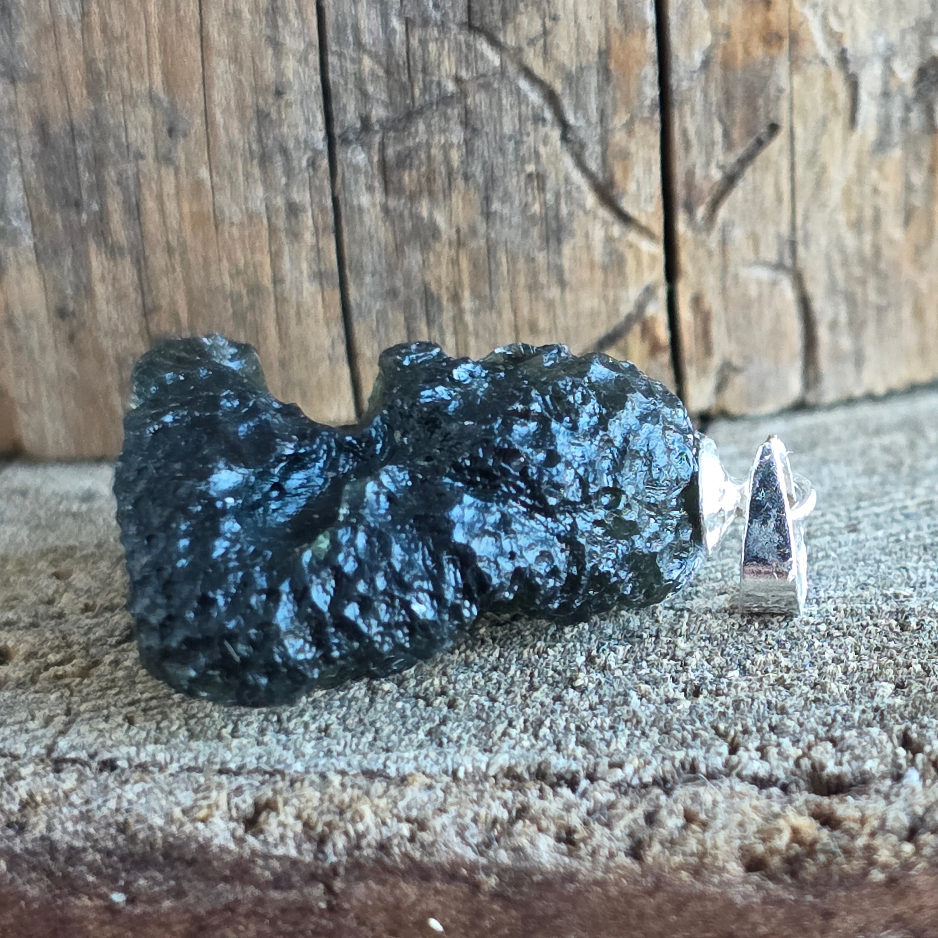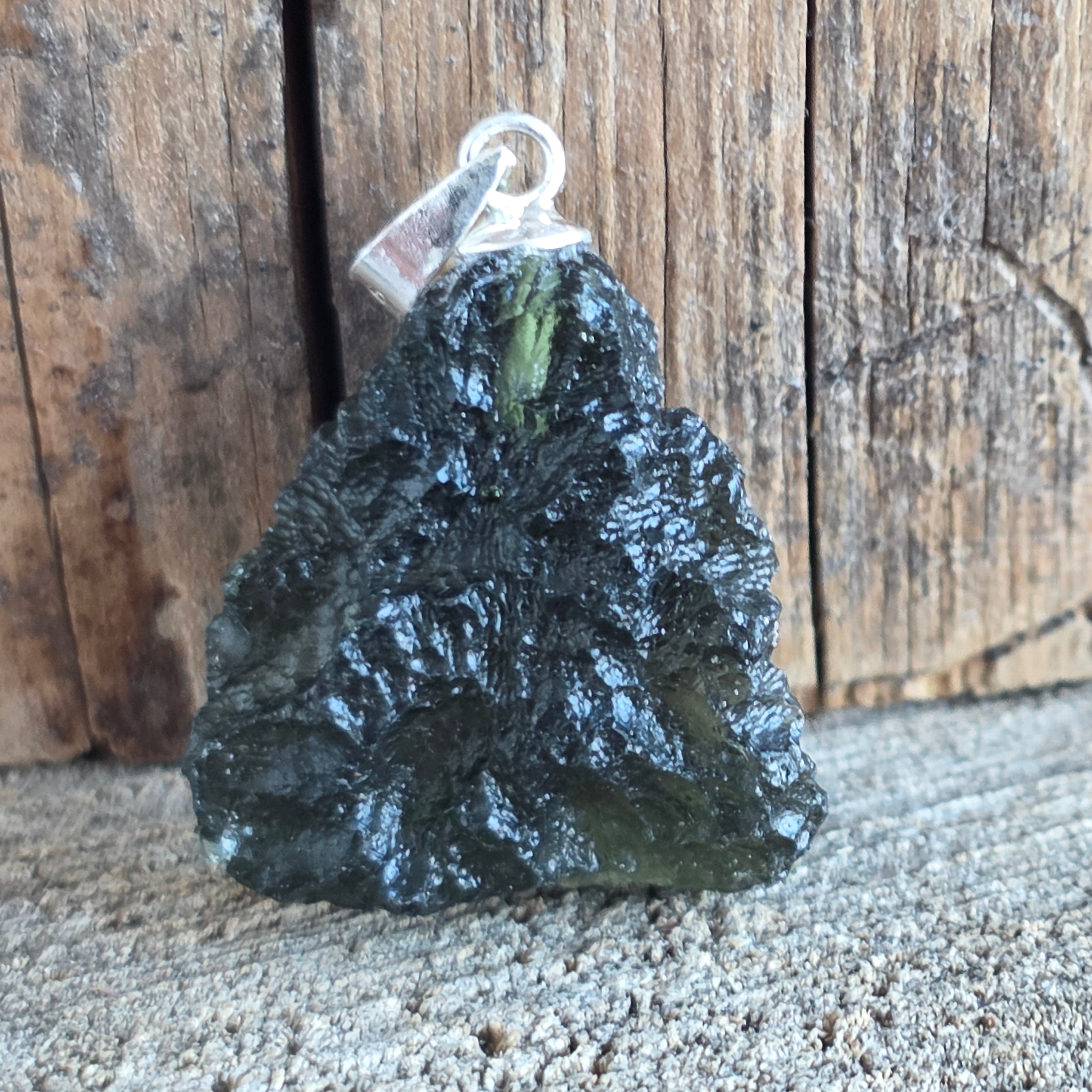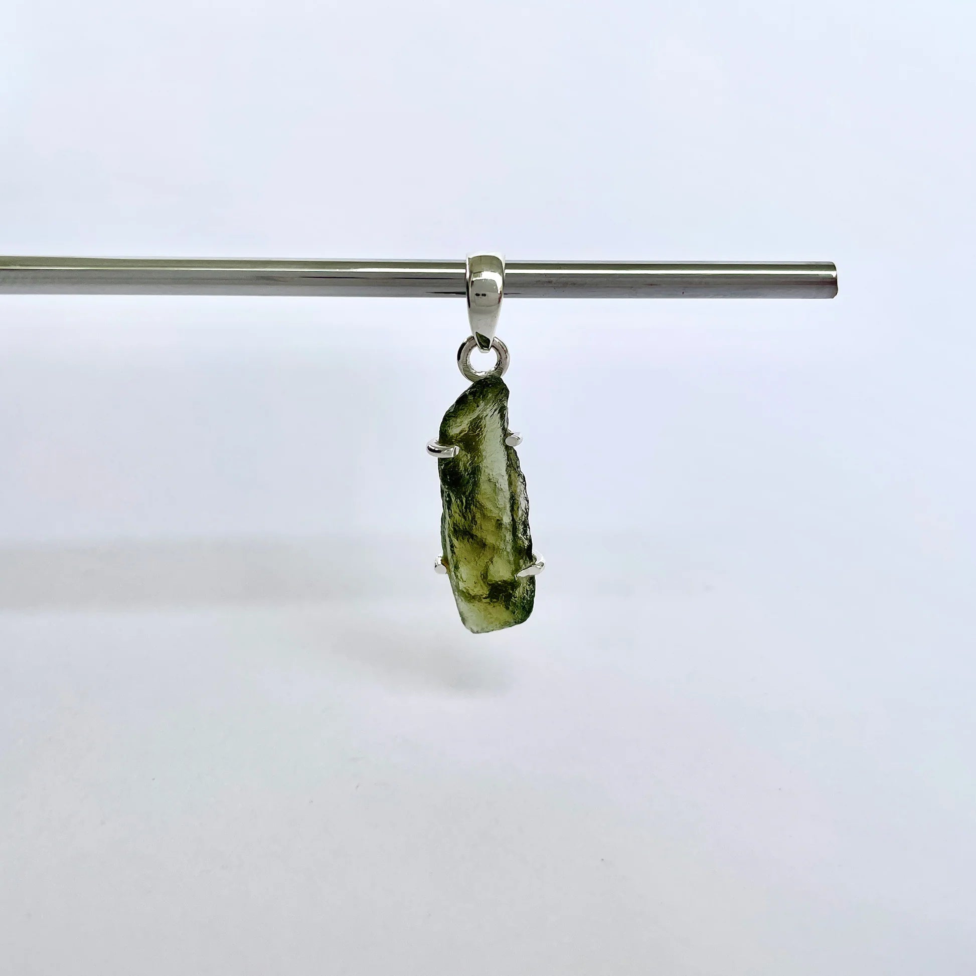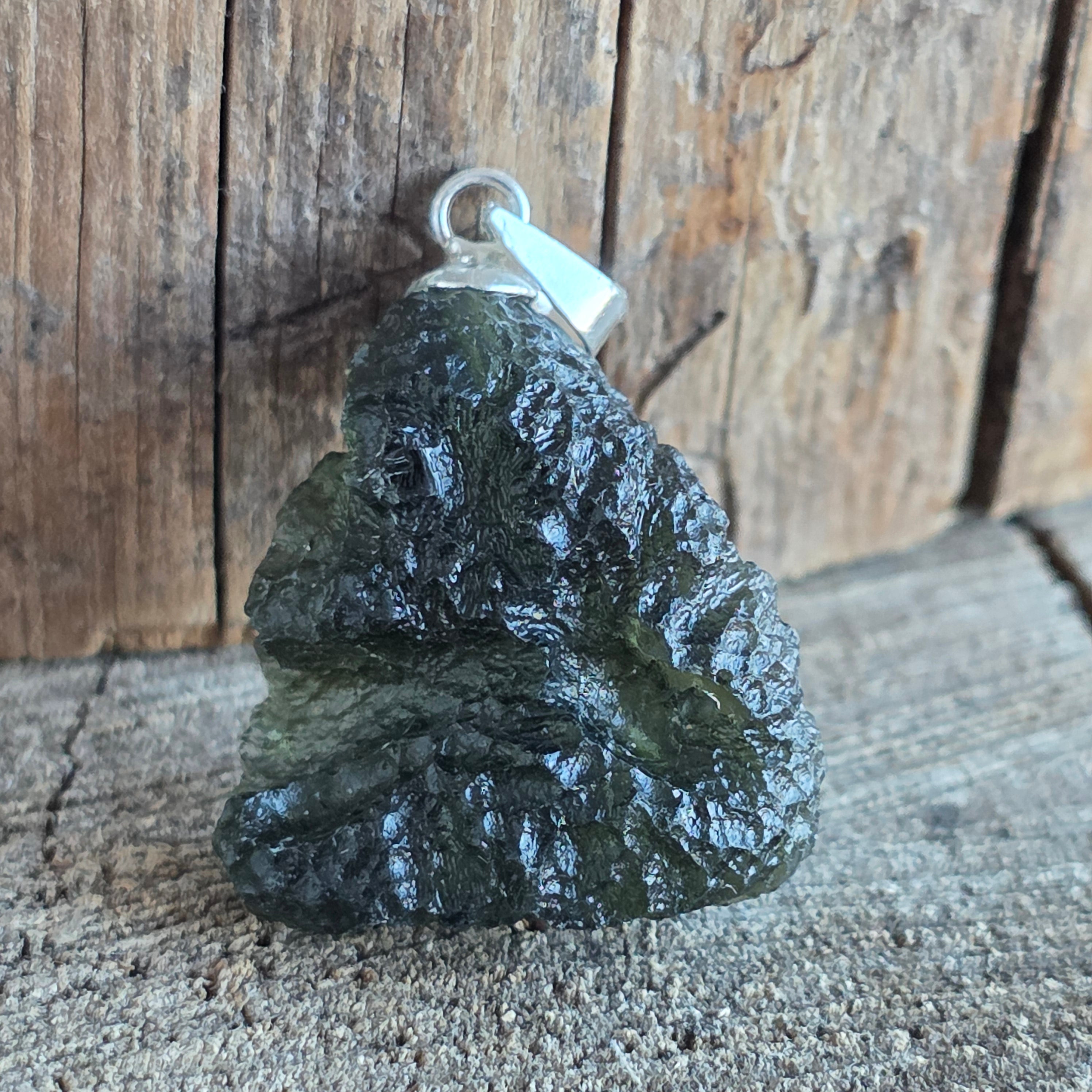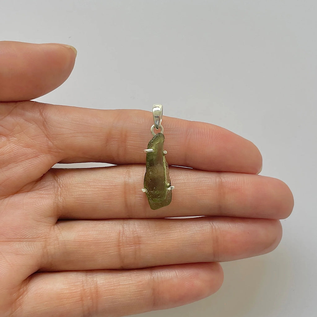 Un pandantiv rar și autentic, cu moldavit brut, montat minimalist în argint 925 pentru a evidenția forma sa naturală.