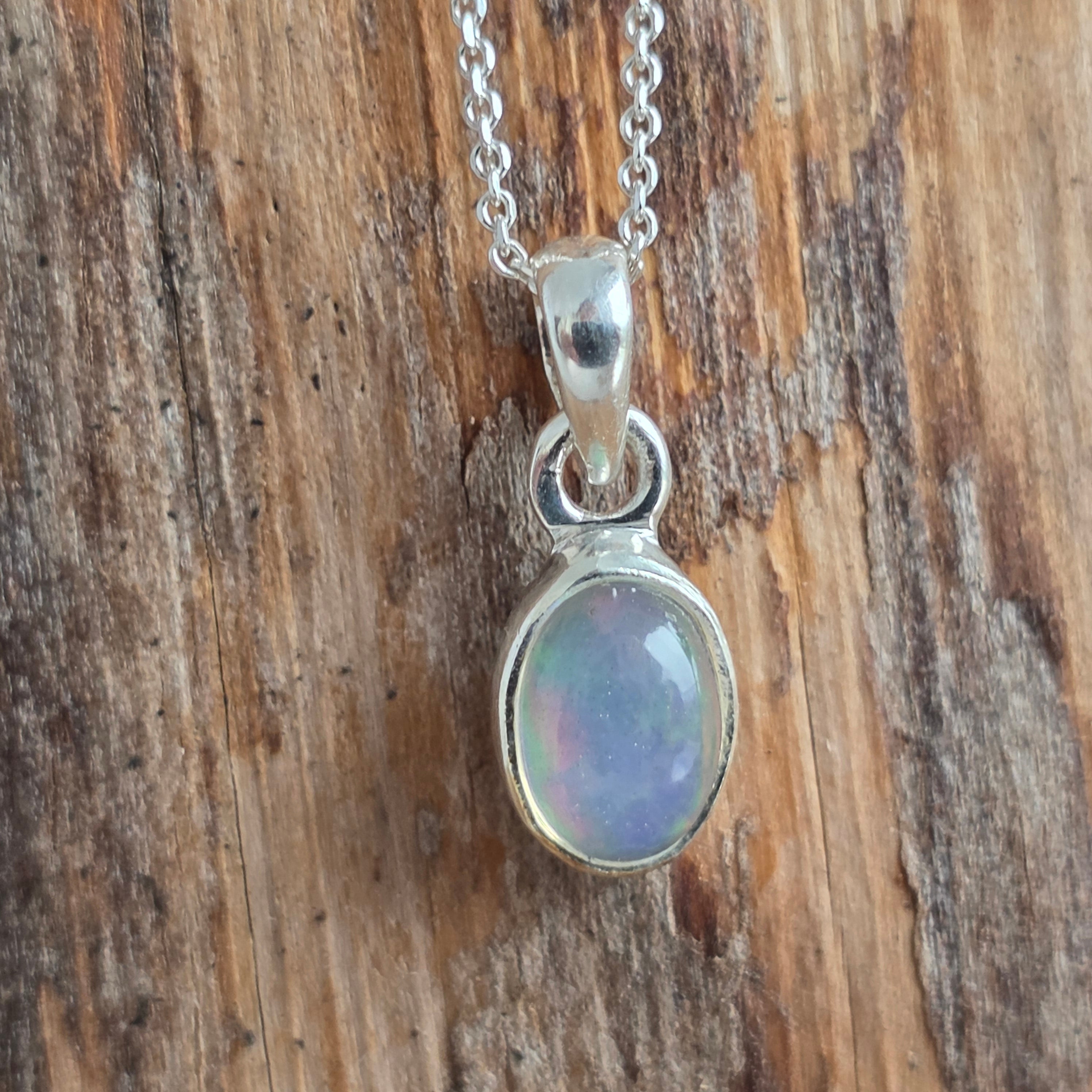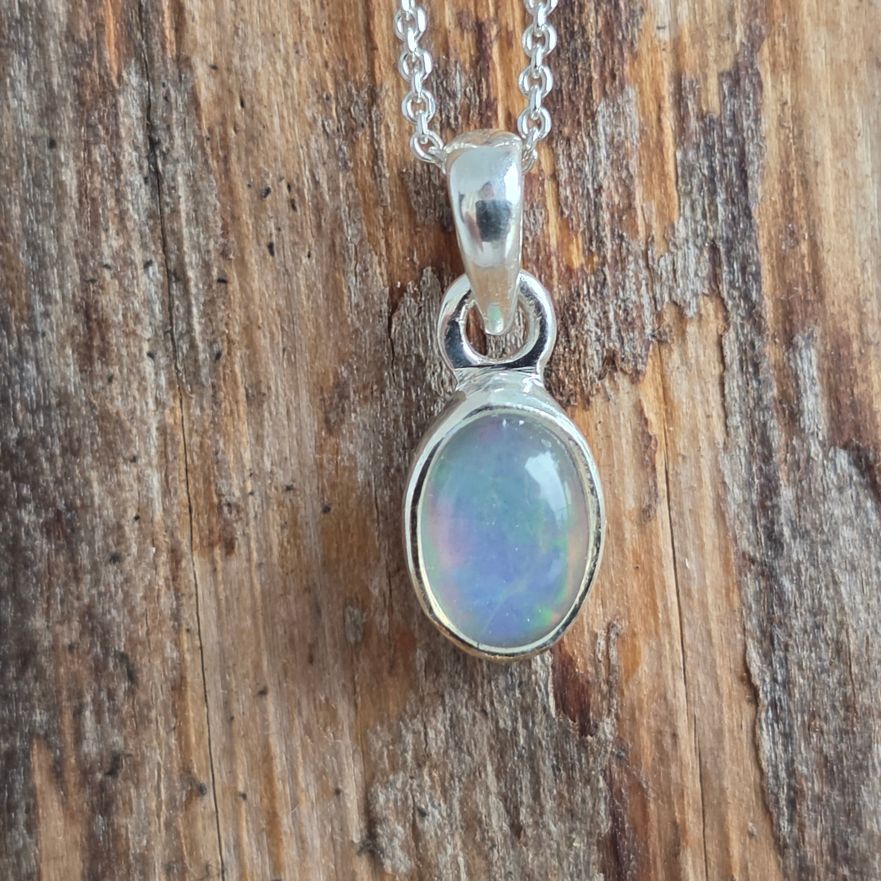 Acest pandantiv oval din argint 925 este încrustat cu un opal natural australian, piatra cu reflexii unice de culori opalescente ce dansează la lumină, evocând misterul oceanului și strălucirea cerului.