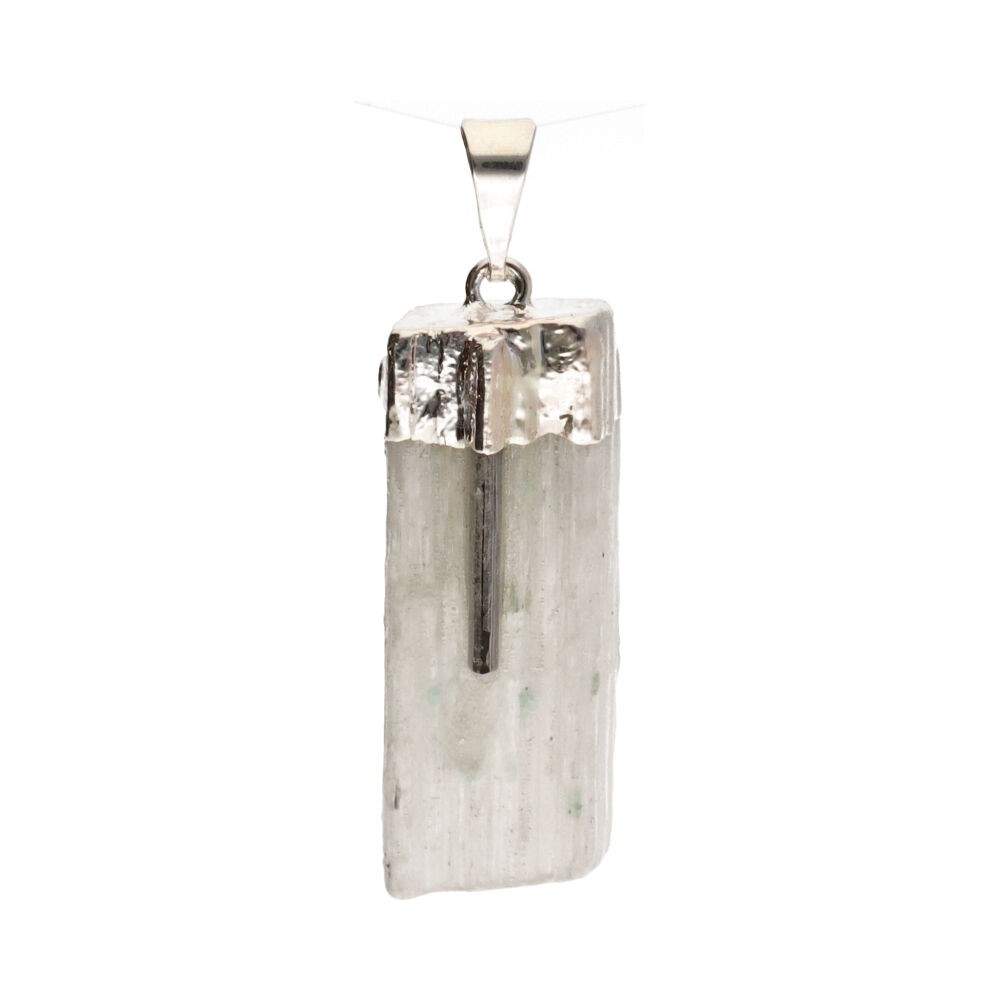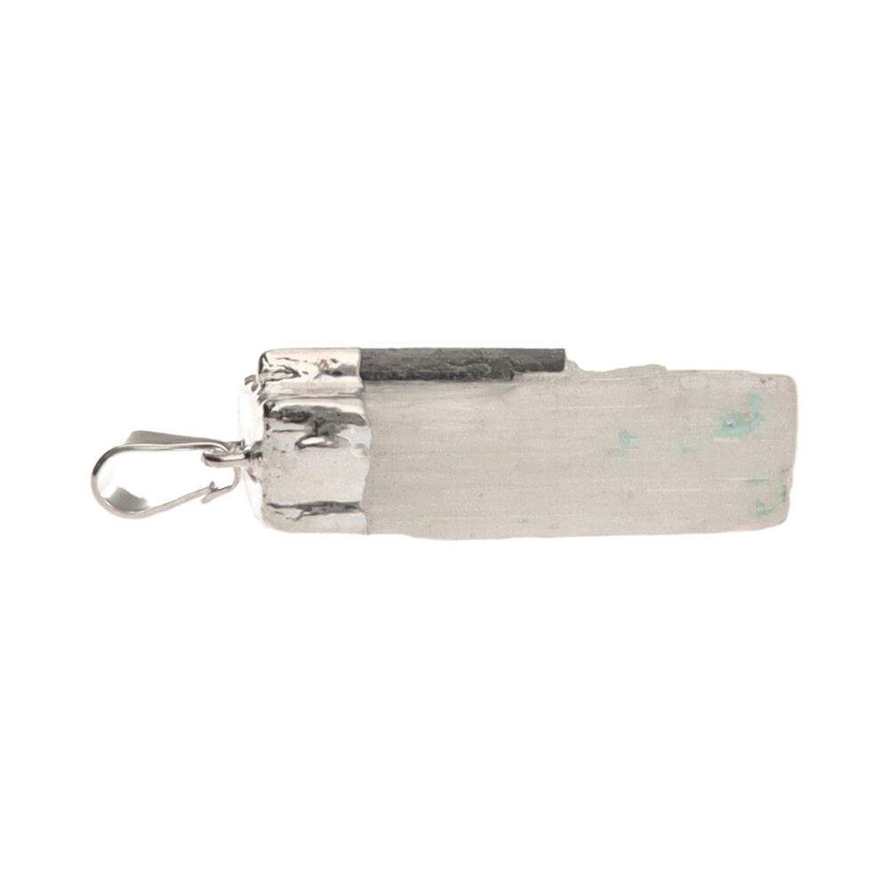 Pandantivul din selenit cu turmalină, suflat cu argint, îmbină lumina pură a selenitului cu energia protectoare a turmalinei negre, amplificate de strălucirea argintului.