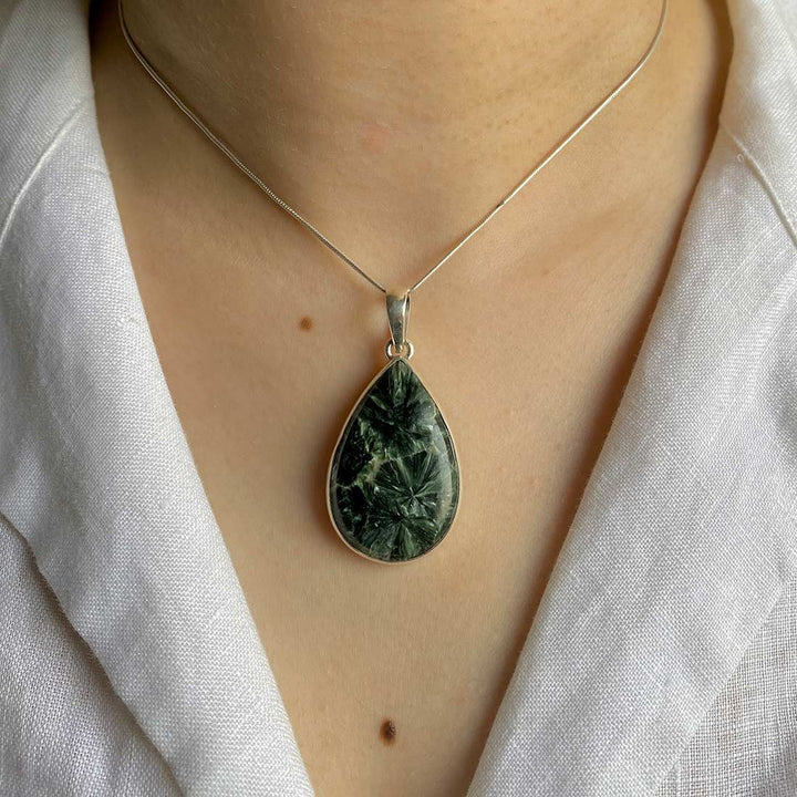 Serafinitul se remarcă prin nuanțele sale subtile de verde, îmbinate armonios cu striuri argintii sau albe, care seamănă cu aripile unui înger. Această combinație de culori și modele naturale creează un aspect delicat și fermecător în bijuterii. Serafinitul este adesea asociat cu energiile angelice și spirituale, fiind considerat o piatră a luminii și a iubirii divine.