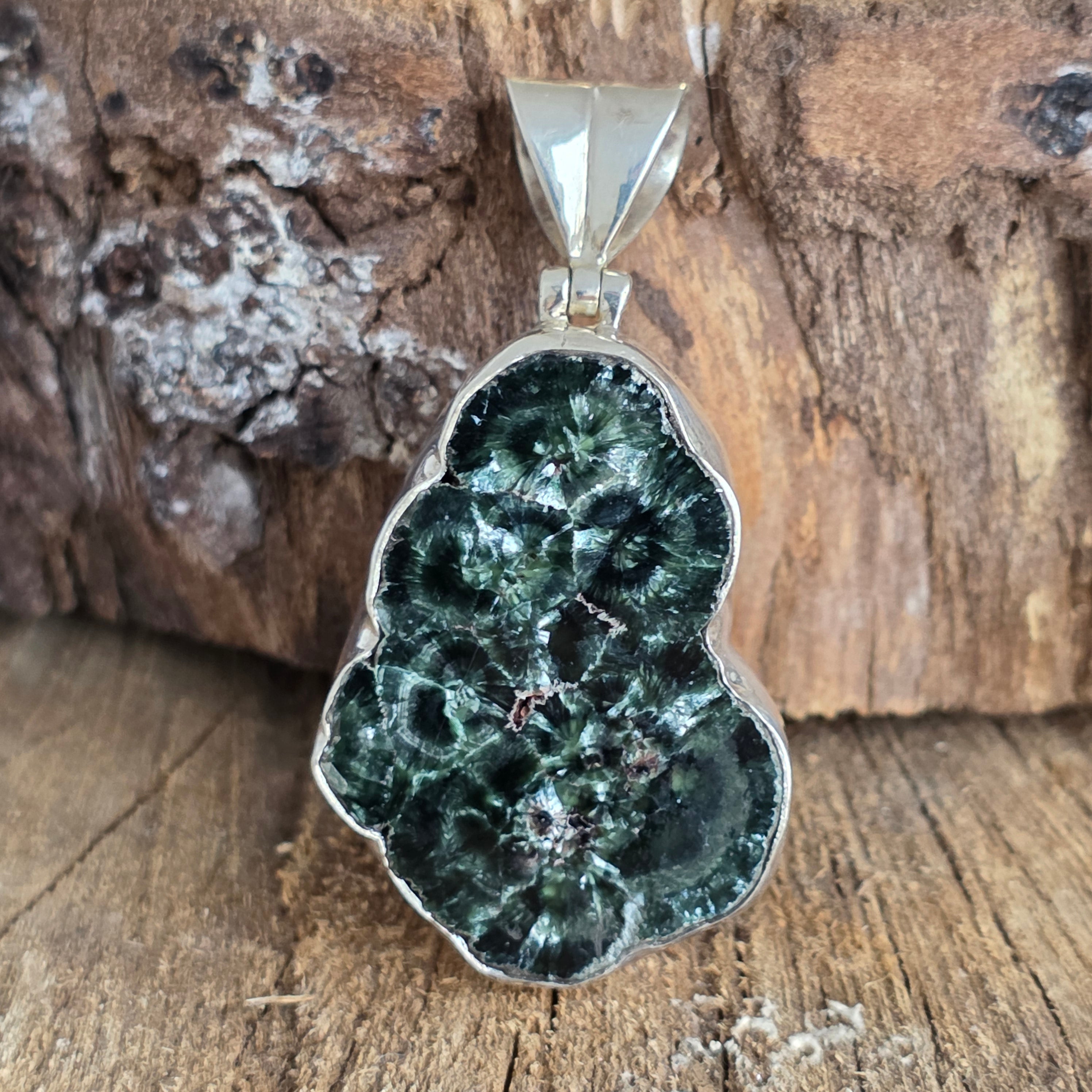 Acest pandantiv cu serafinit natural în argint 925 este o bijuterie unică, ce reflectă frumusețea angelică a acestei pietre rare. Nuanțele sale verzi adânci, străbătute de reflexe argintii asemănătoare cu penele delicate ale aripilor, îl fac un cristal cu adevărat aparte.