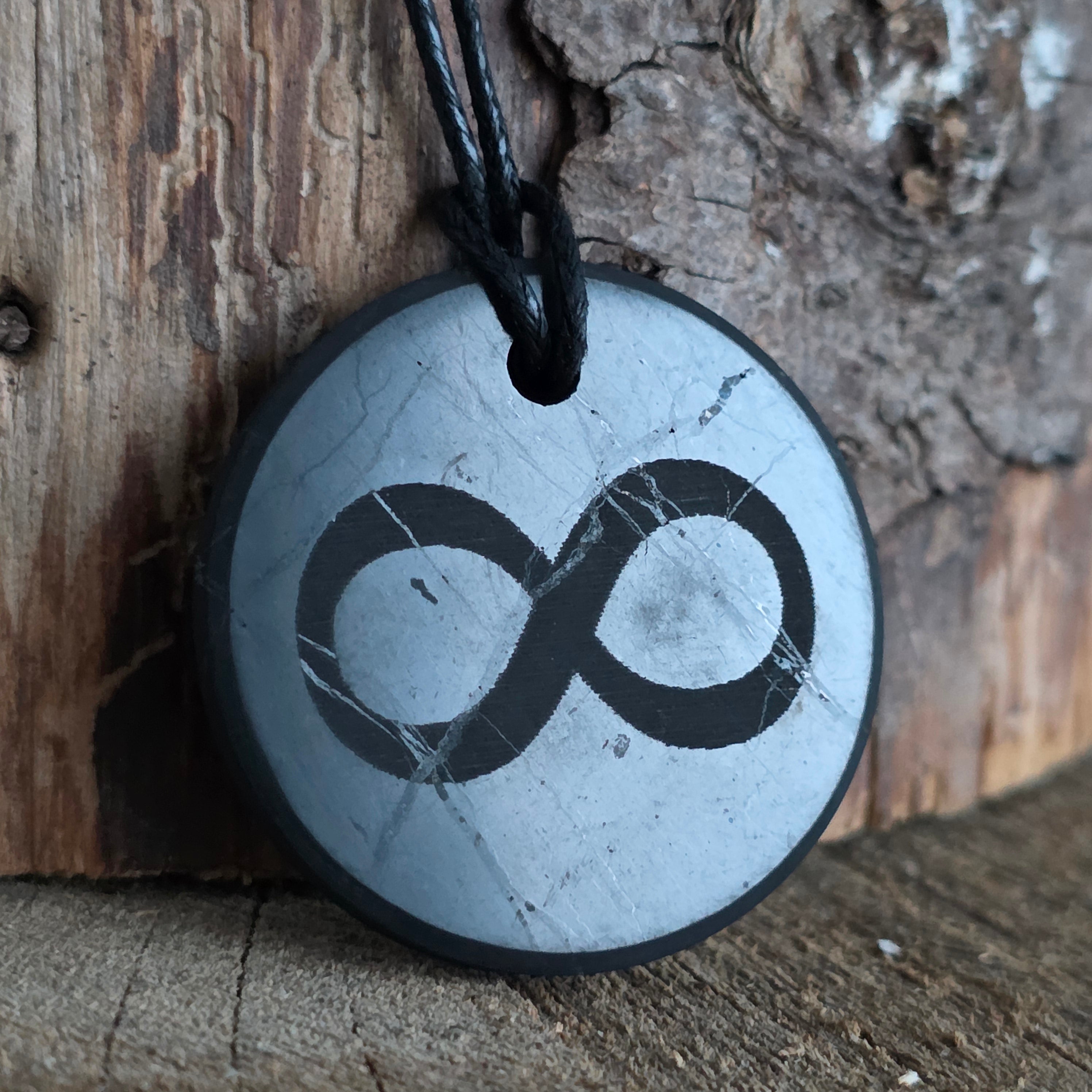 Pandantiv shungit Infinity cu snur negru, dimensiune 3 cm.