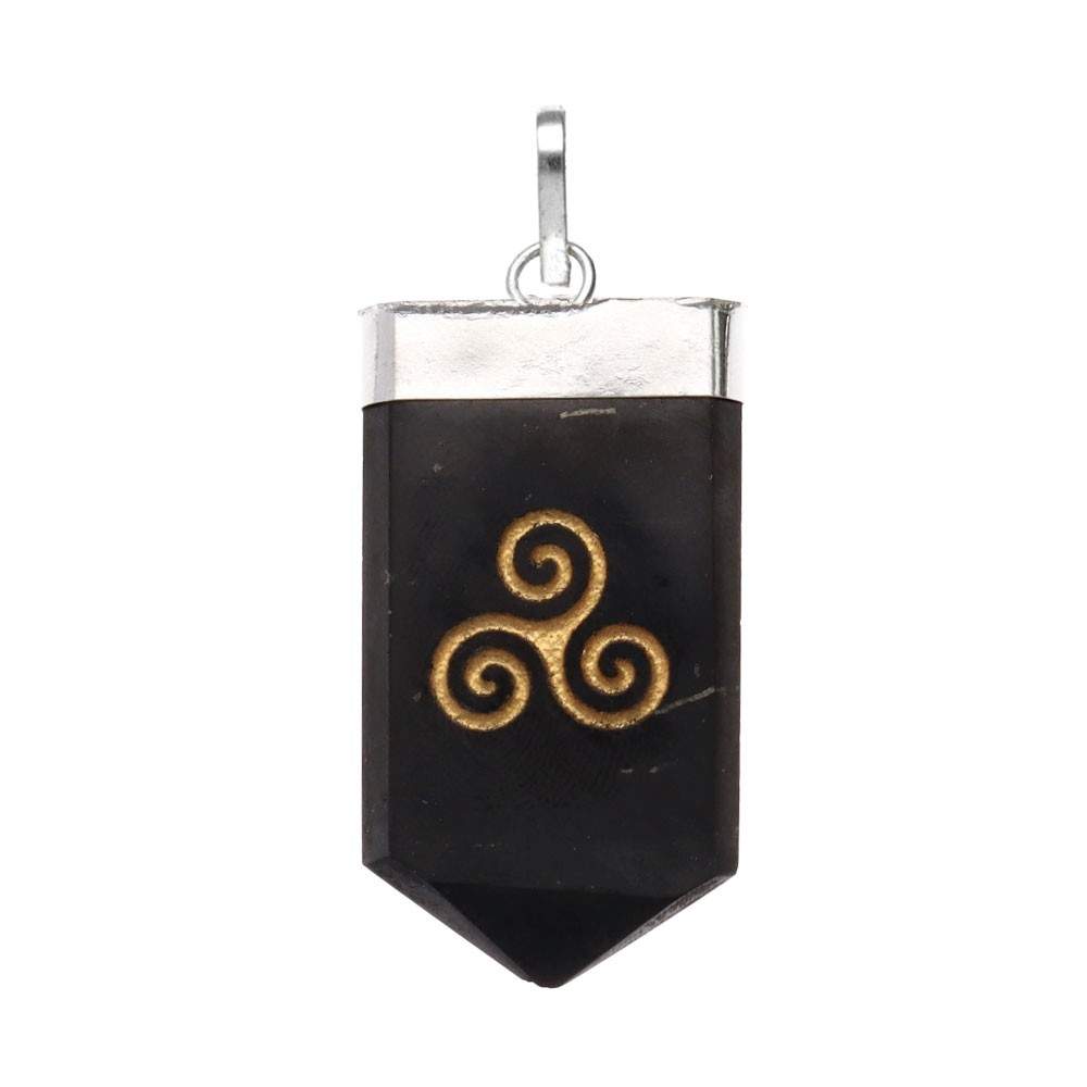 Acest pandantiv cu simbolul Triskel, realizat din șungit natural și montat pe alamă placată cu argint, îmbină puterea străveche a cristalului cu forța simbolică a spiralei celtice. Designul său unic evocă ideea de mișcare, ciclicitate și echilibru între cele trei dimensiuni fundamentale ale existenței.