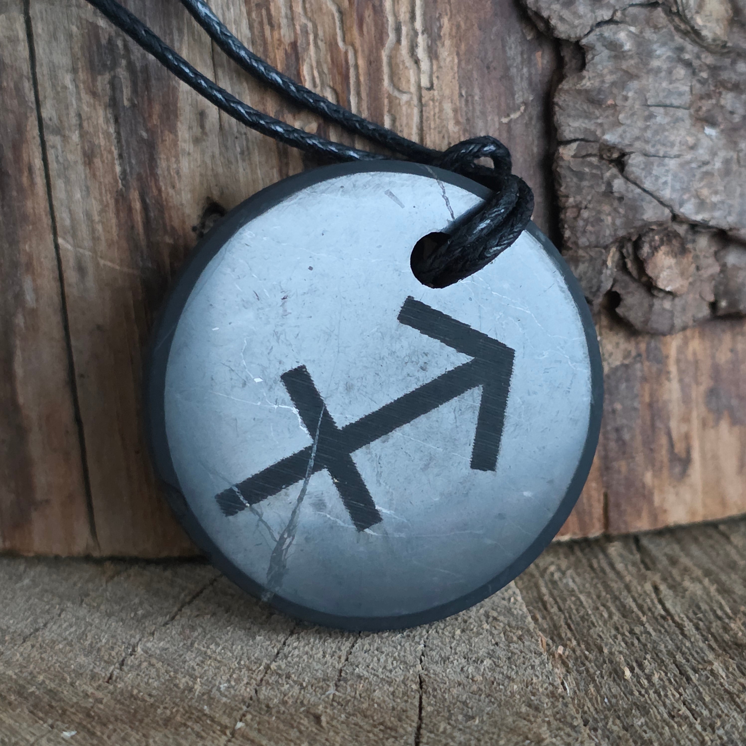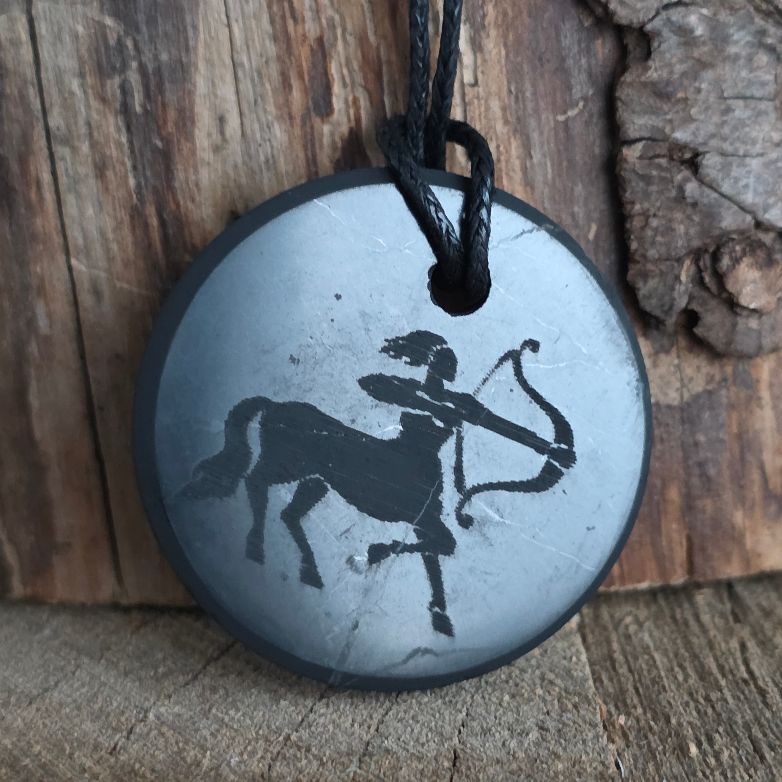 - Formă pandantiv: rotund, gravat cu simbol astrologic Sagetator pe ambele fete