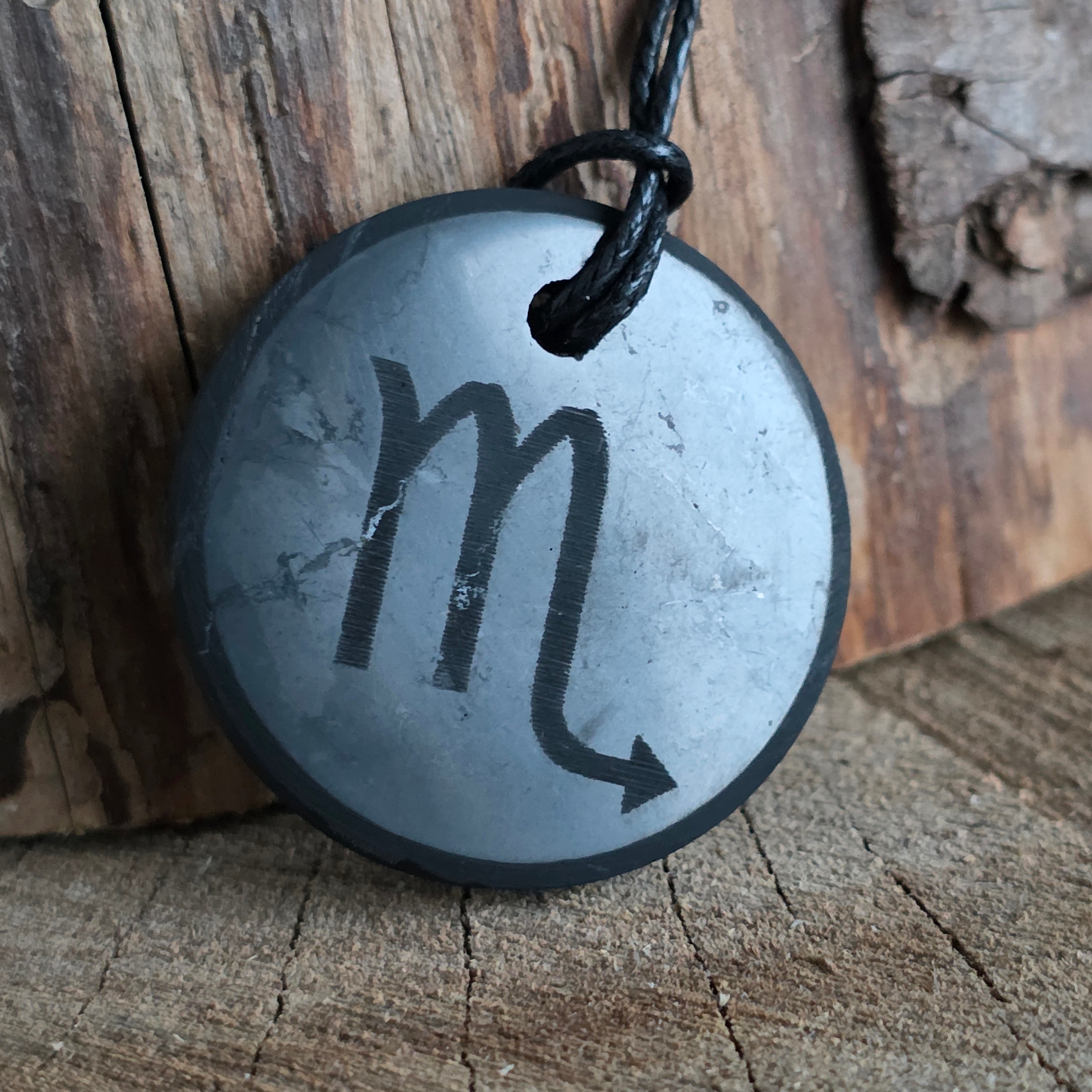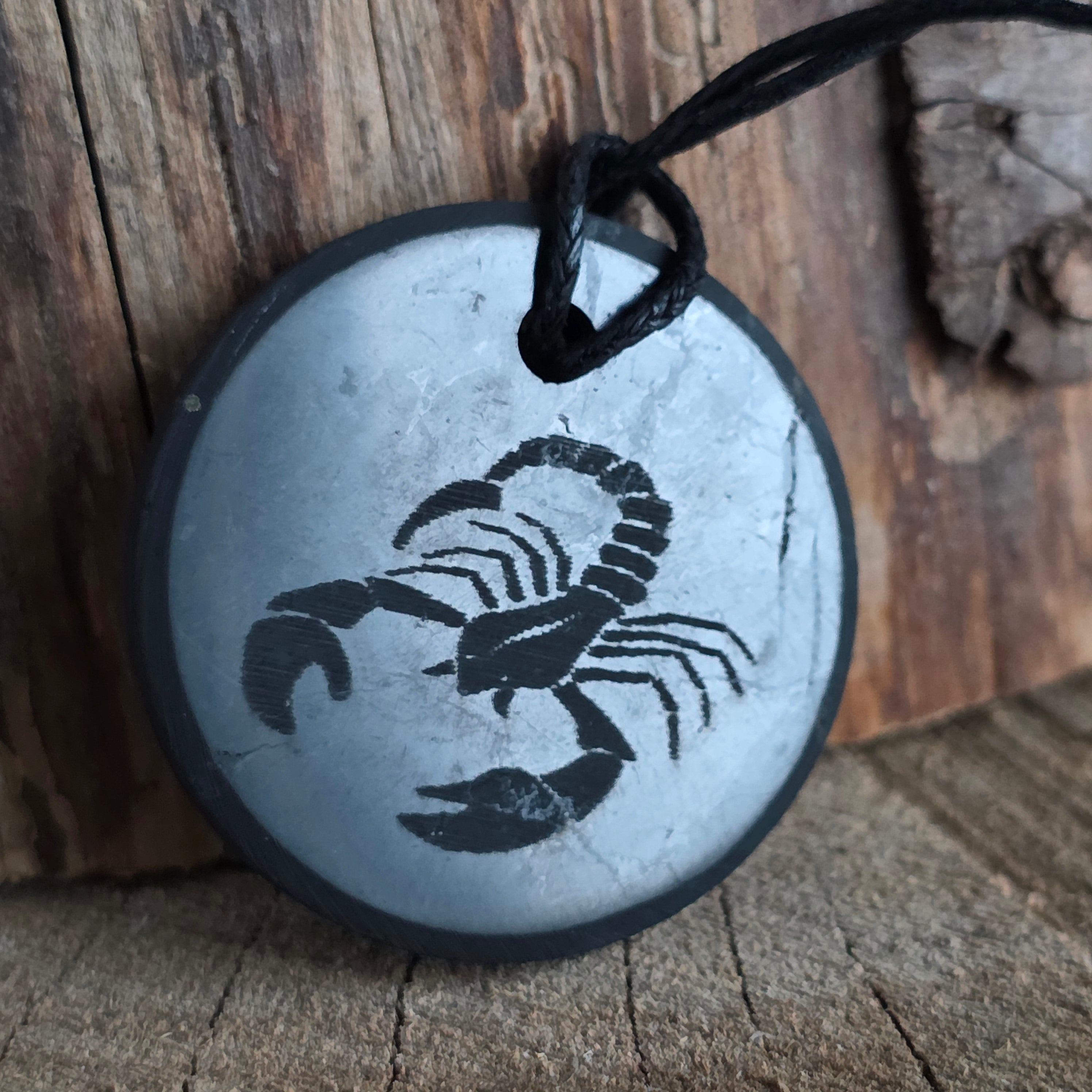 - Formă pandantiv: rotund, gravat cu simbol astrologic Scorpion pe ambele fete