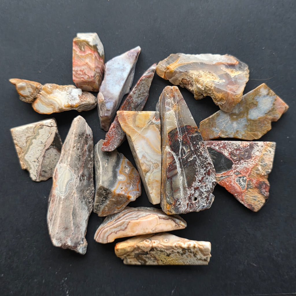 Agatul Crazy din Mexic este una dintre cele mai vibrante și spectaculoase varietăți de agat, celebru pentru liniile sale ondulate și jocurile nebunești de culori ce par desenate de o mână liberă, fără reguli. În această felie naturală, mică dar extrem de expresivă, se dezvăluie întreaga poveste a pietrei: straturi pământii, nuanțe calde de caramel, roșu aprins, portocaliu, gri și crem, amestecate în modele spiralate care par să pulseze cu viață.