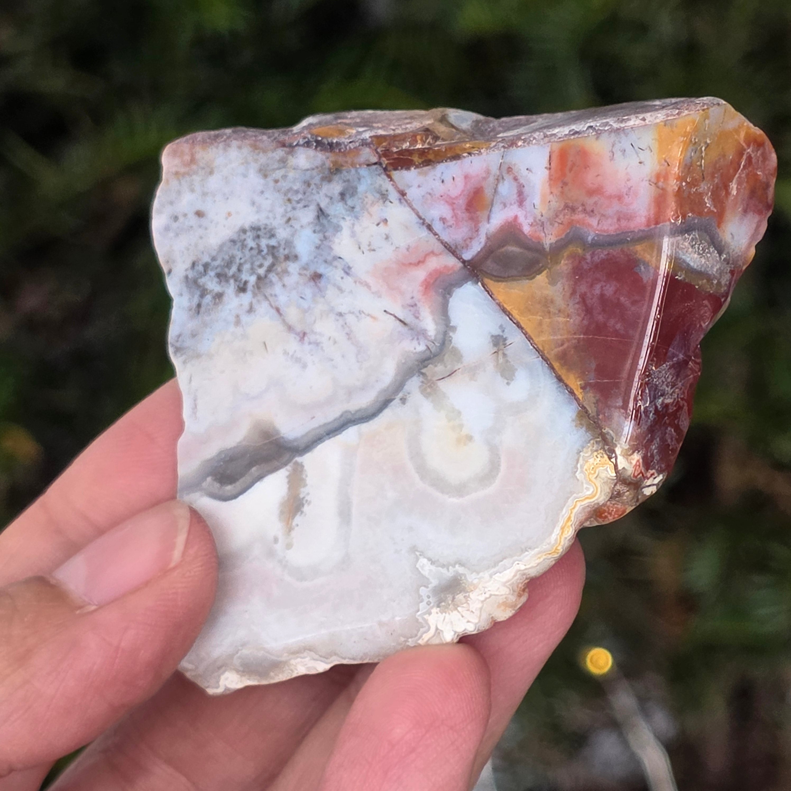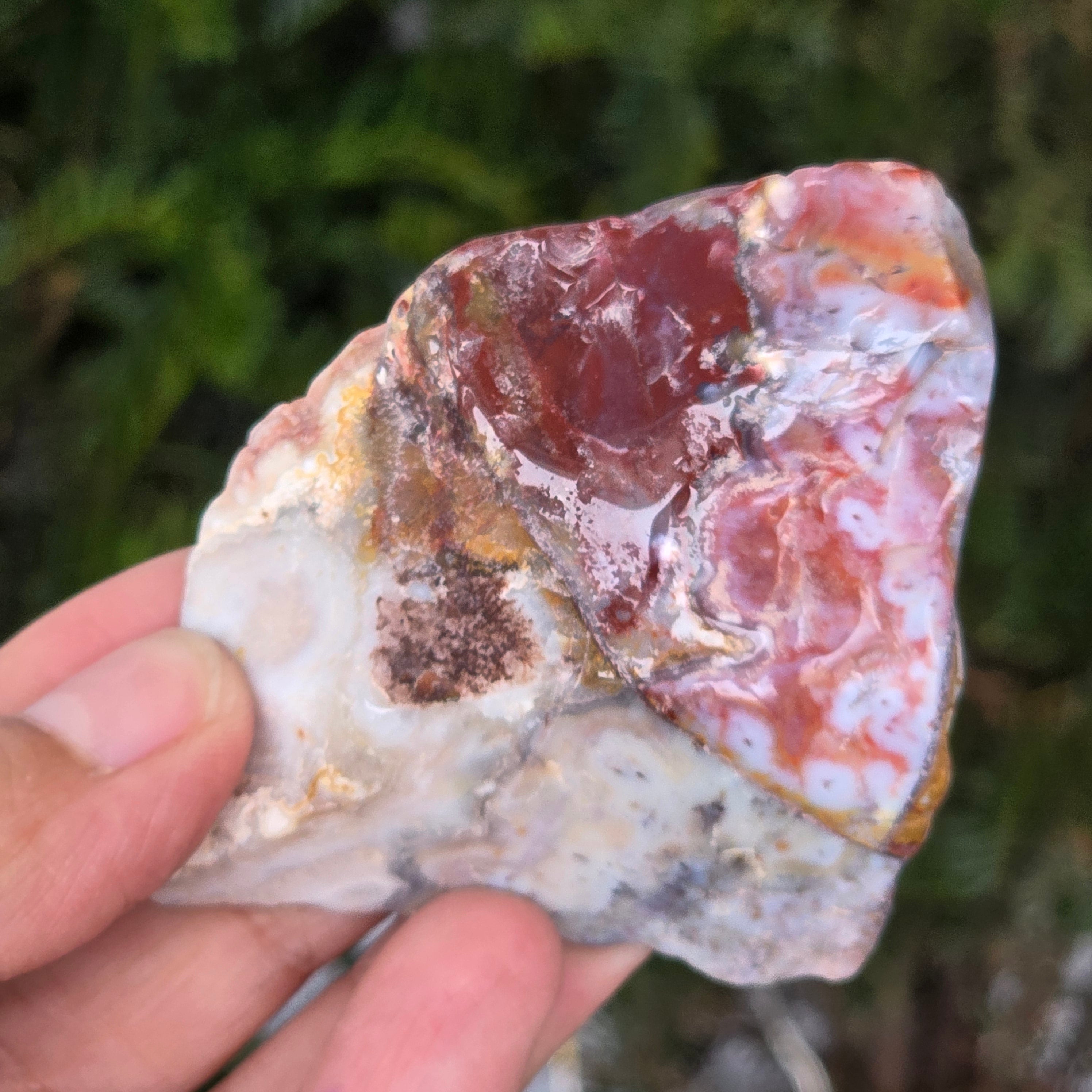 Agatul Crazy din Mexic este una dintre cele mai vibrante și spectaculoase varietăți de agat, celebru pentru liniile sale ondulate și jocurile nebunești de culori ce par desenate de o mână liberă, fără reguli. În această felie naturală, mică dar extrem de expresivă, se dezvăluie întreaga poveste a pietrei: straturi pământii, nuanțe calde de caramel, roșu aprins, portocaliu, gri și crem, amestecate în modele spiralate care par să pulseze cu viață.
