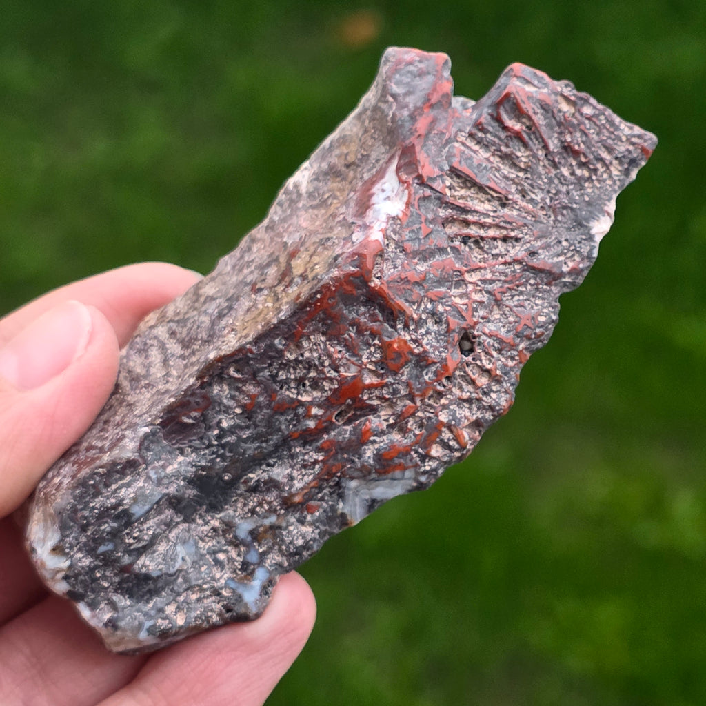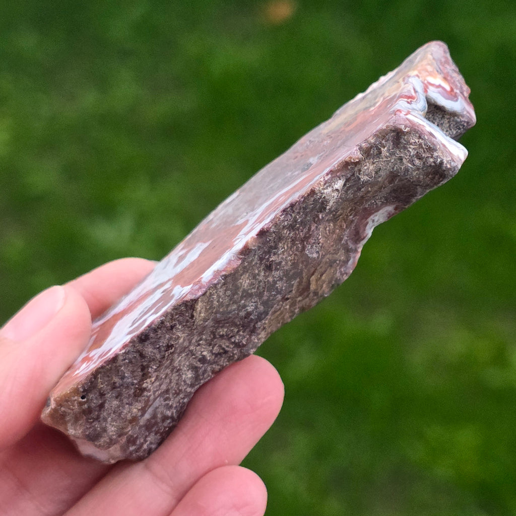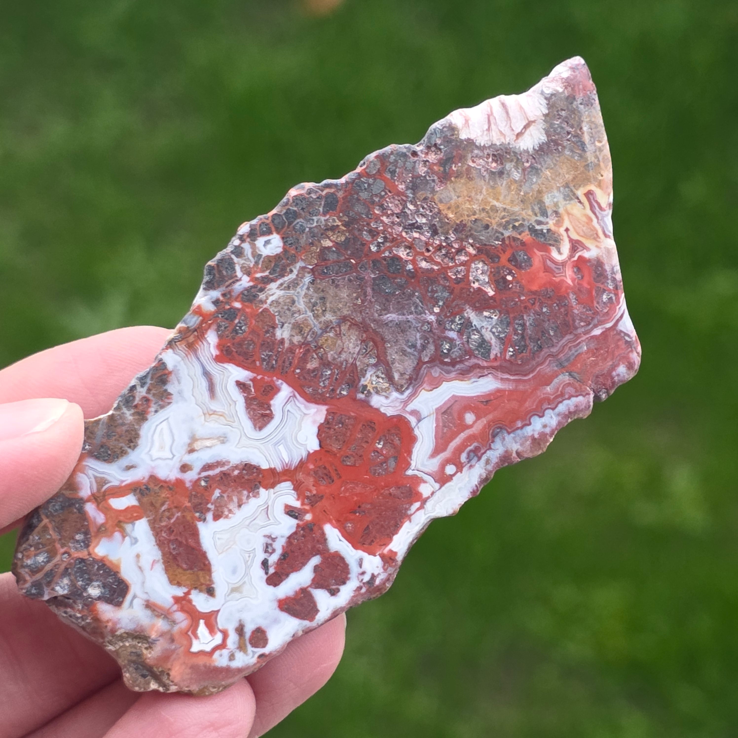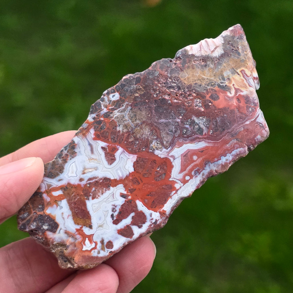 Agatul Crazy din Mexic este una dintre cele mai vibrante și spectaculoase varietăți de agat, celebru pentru liniile sale ondulate și jocurile nebunești de culori ce par desenate de o mână liberă, fără reguli. În această felie naturală, mică dar extrem de expresivă, se dezvăluie întreaga poveste a pietrei: straturi pământii, nuanțe calde de caramel, roșu aprins, portocaliu, gri și crem, amestecate în modele spiralate care par să pulseze cu viață.