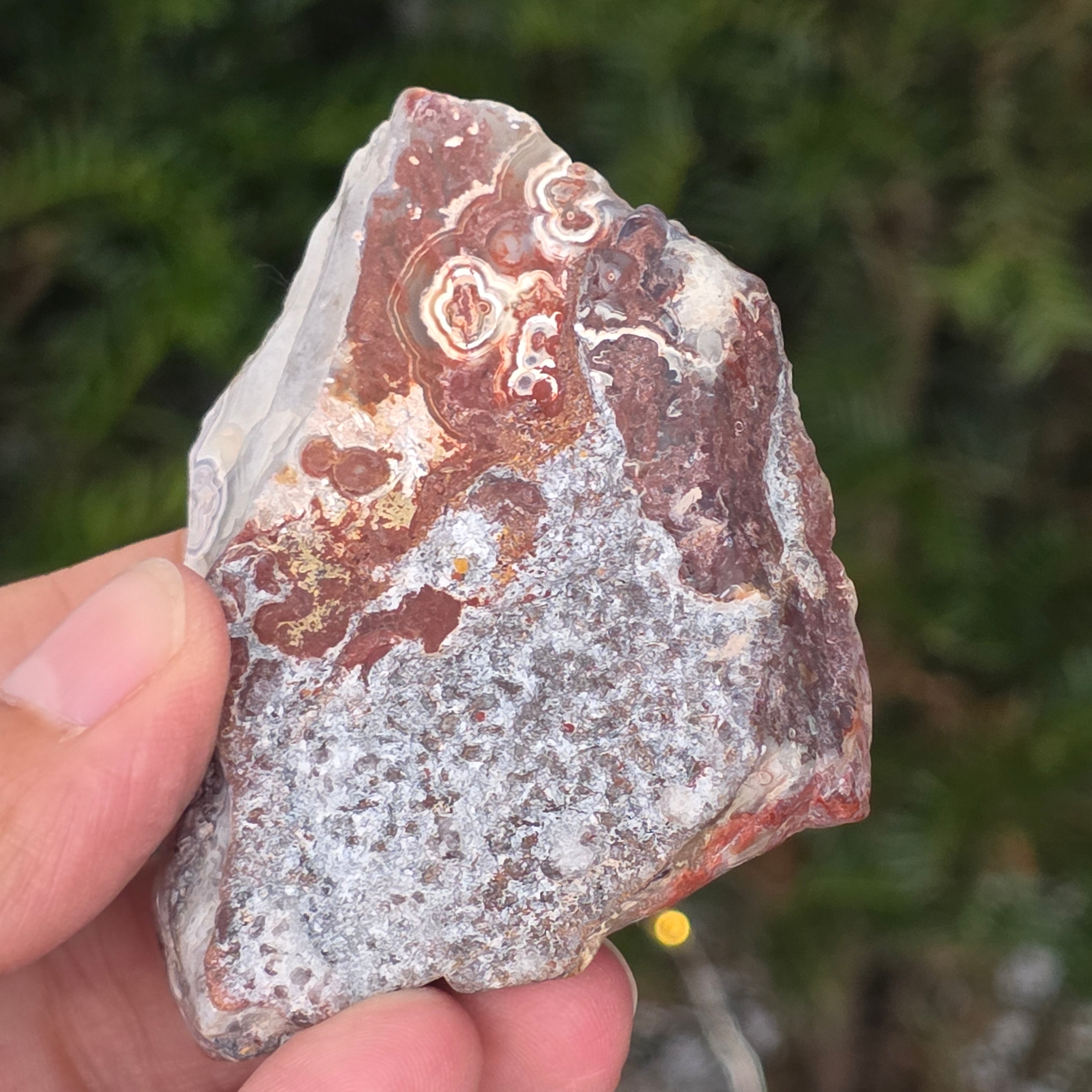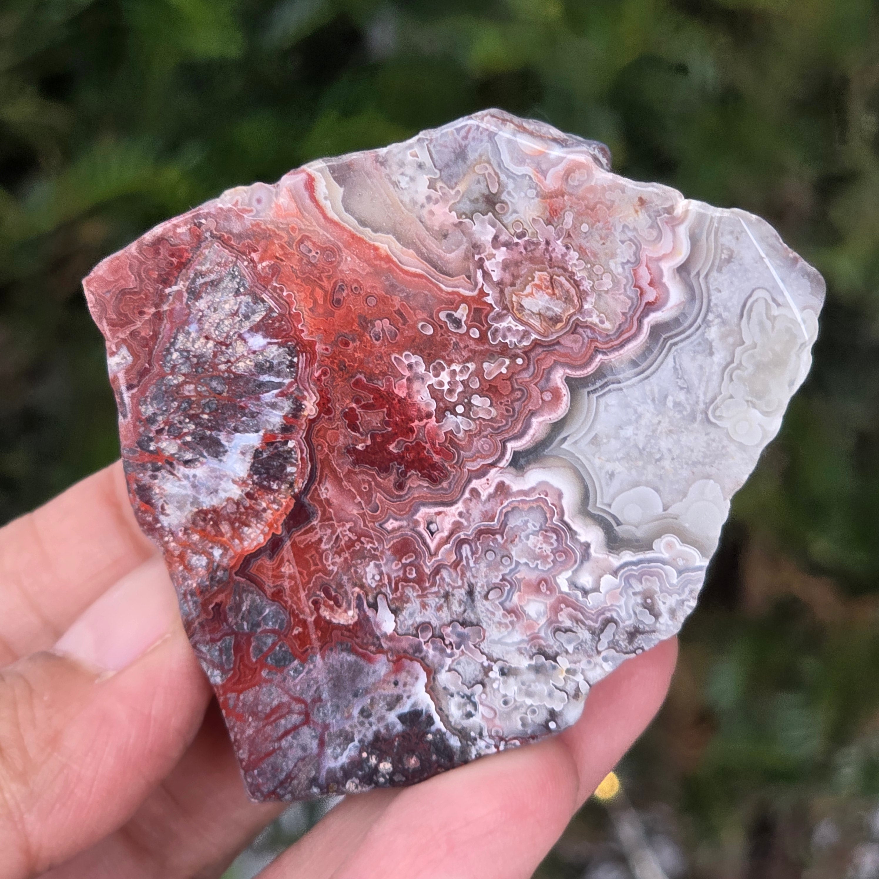 Agatul Crazy din Mexic este una dintre cele mai vibrante și spectaculoase varietăți de agat, celebru pentru liniile sale ondulate și jocurile nebunești de culori ce par desenate de o mână liberă, fără reguli. În această felie naturală, mică dar extrem de expresivă, se dezvăluie întreaga poveste a pietrei: straturi pământii, nuanțe calde de caramel, roșu aprins, portocaliu, gri și crem, amestecate în modele spiralate care par să pulseze cu viață.