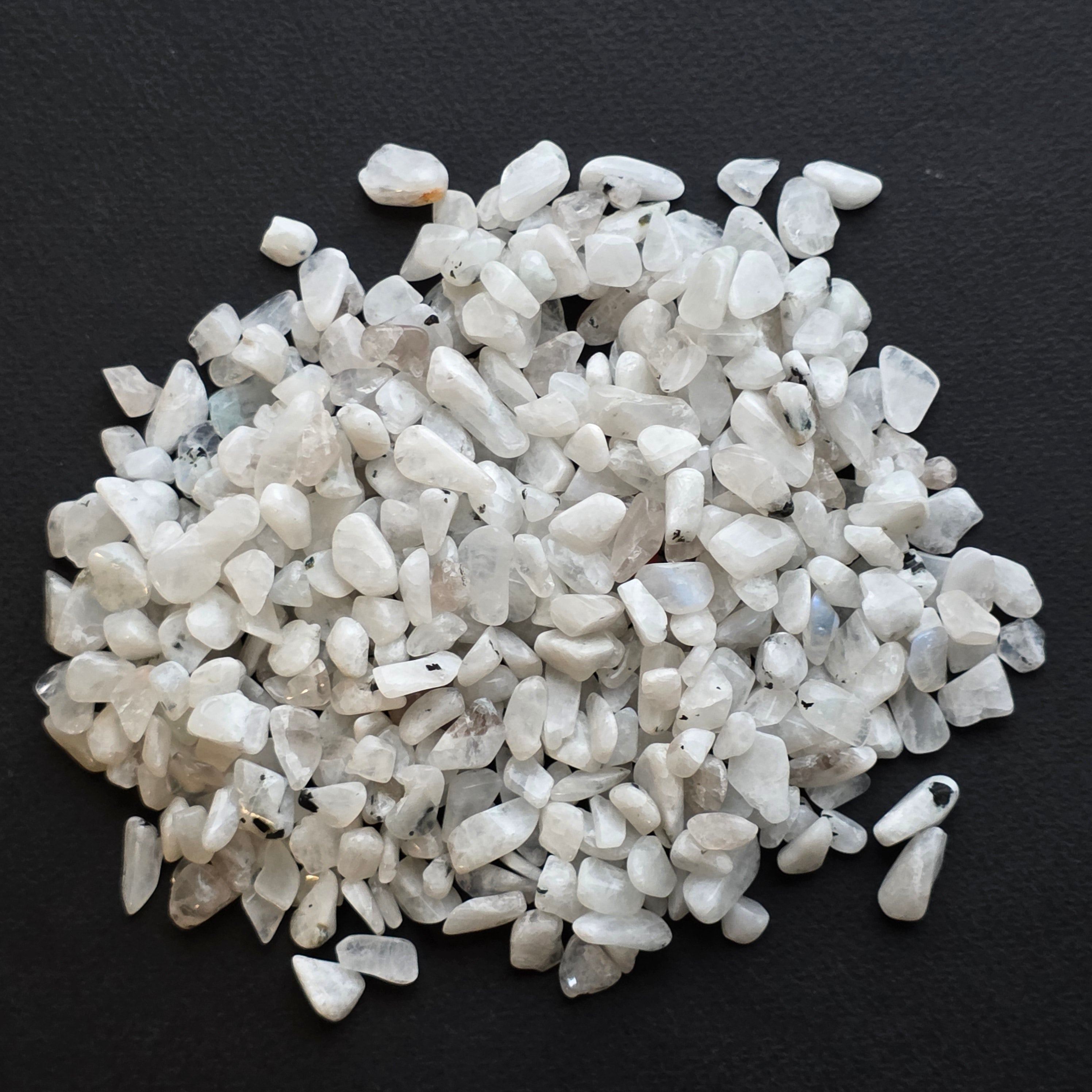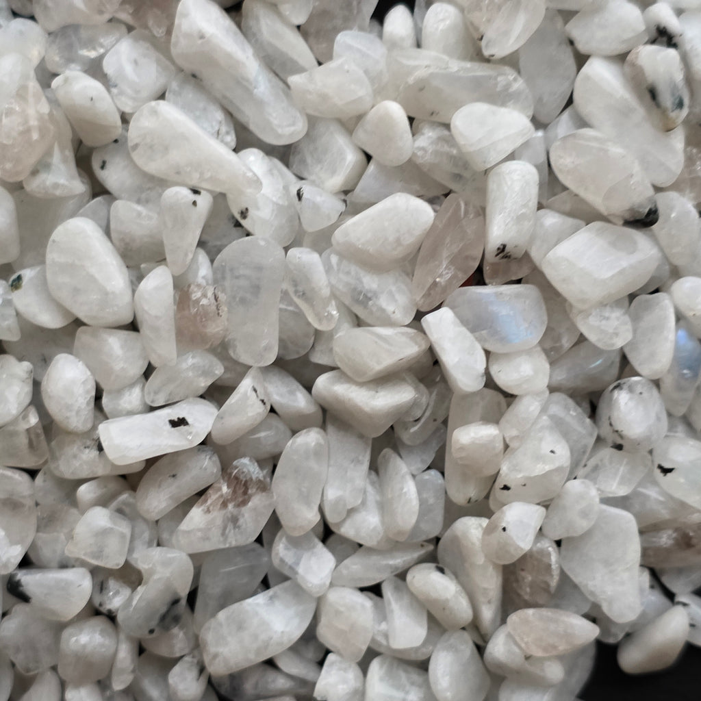 Piatra Lunii albă este renumită pentru reflexele ei discrete, diafane, ce par să ascundă o lumină interioară subtilă. În forma de chipsuri, aceste fragmente mici și fine păstrează farmecul natural al pietrei, cu tonuri albe, lăptoase și translucide, uneori cu irizații delicate care amintesc de luciul lunii pe cerul senin.