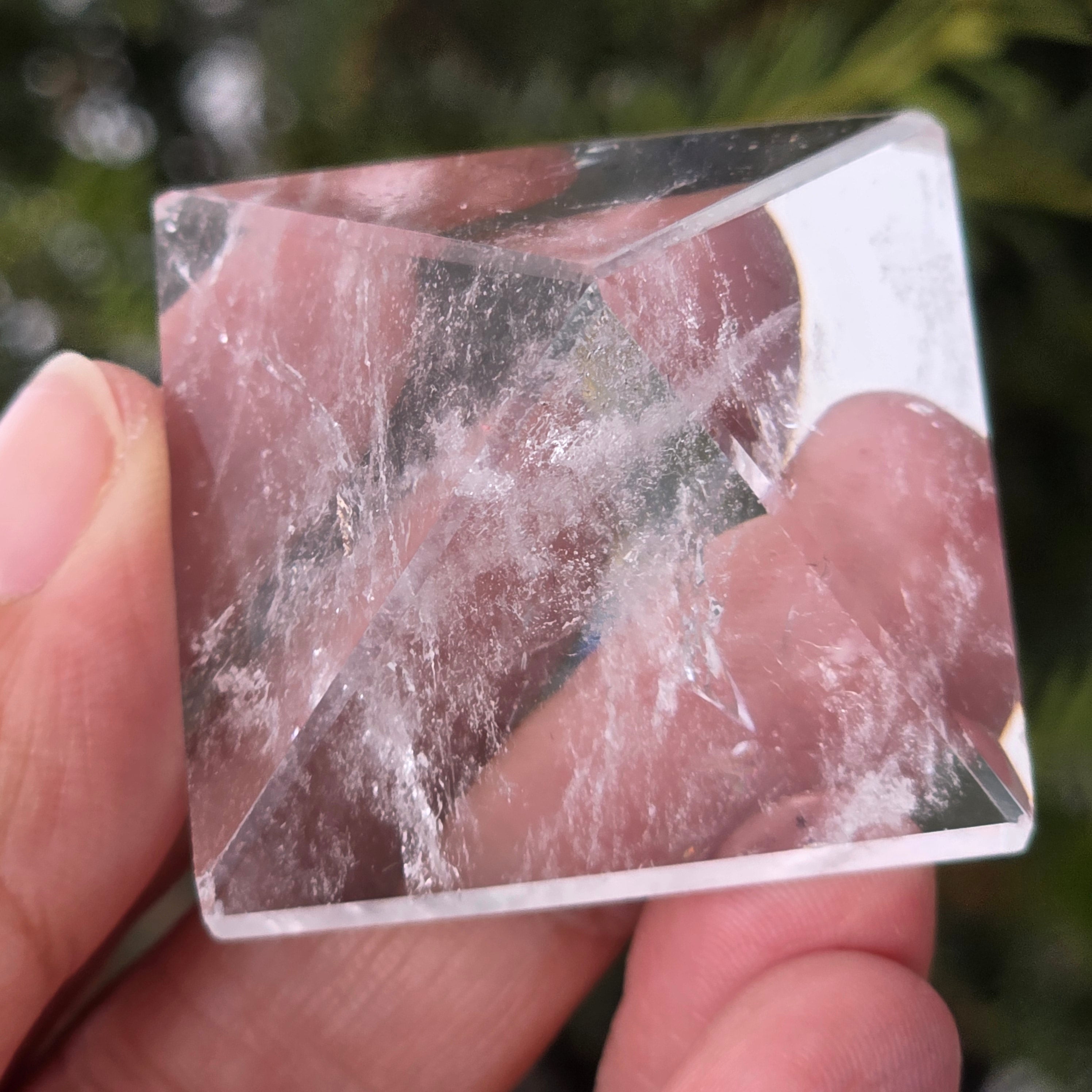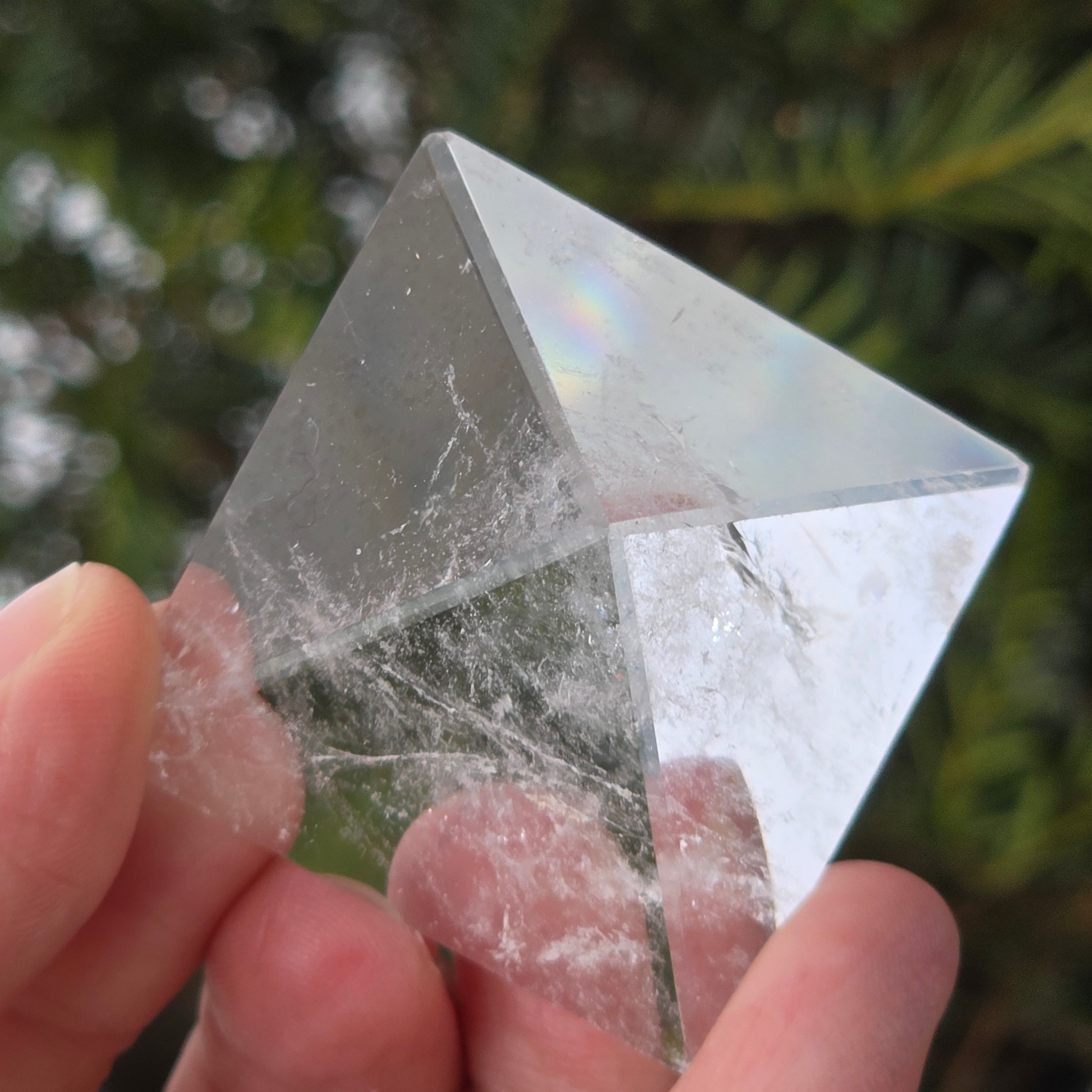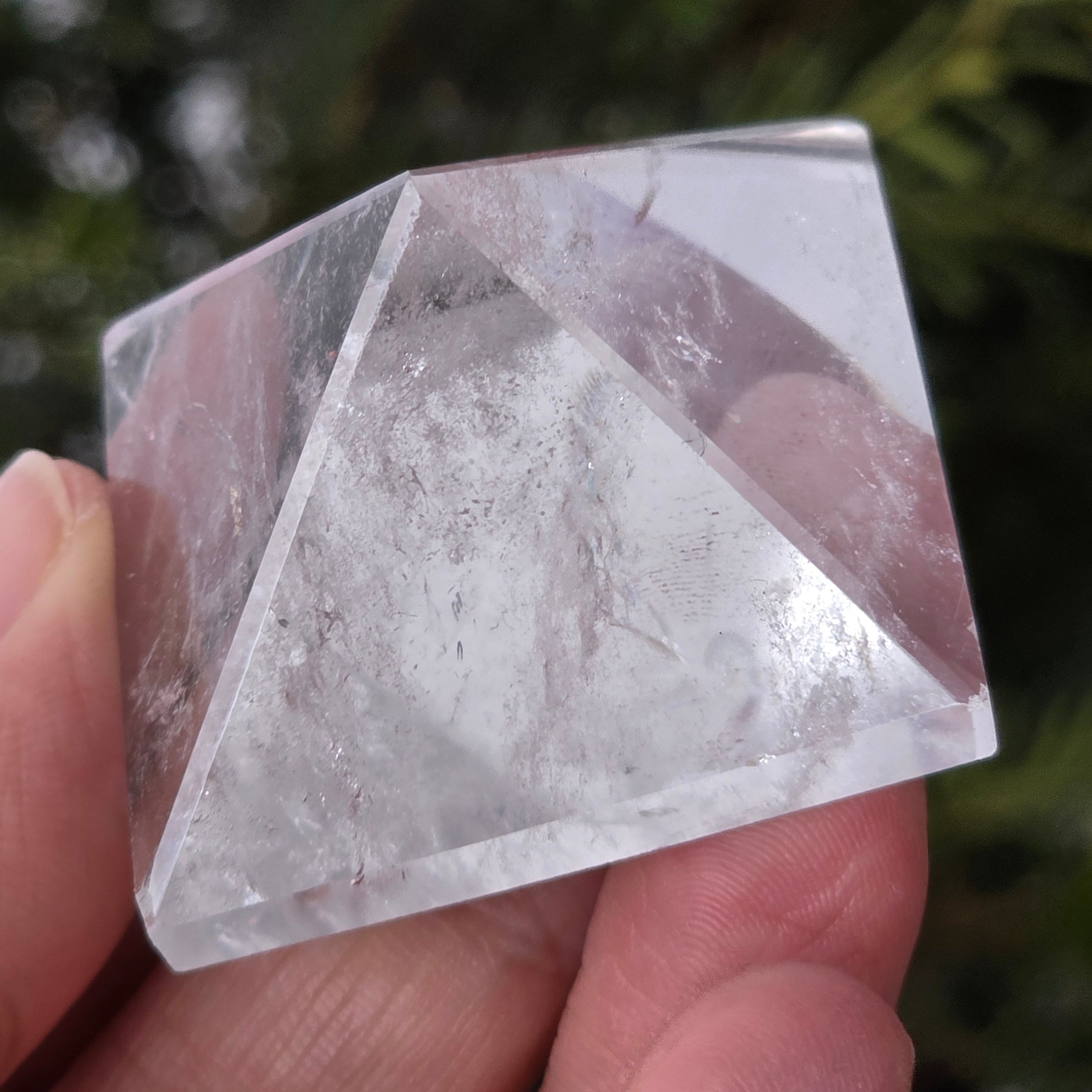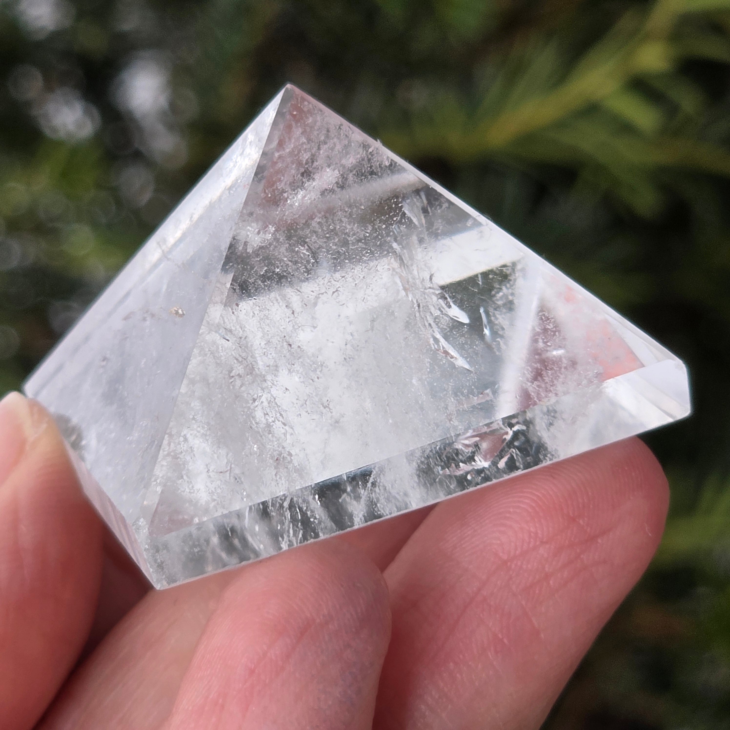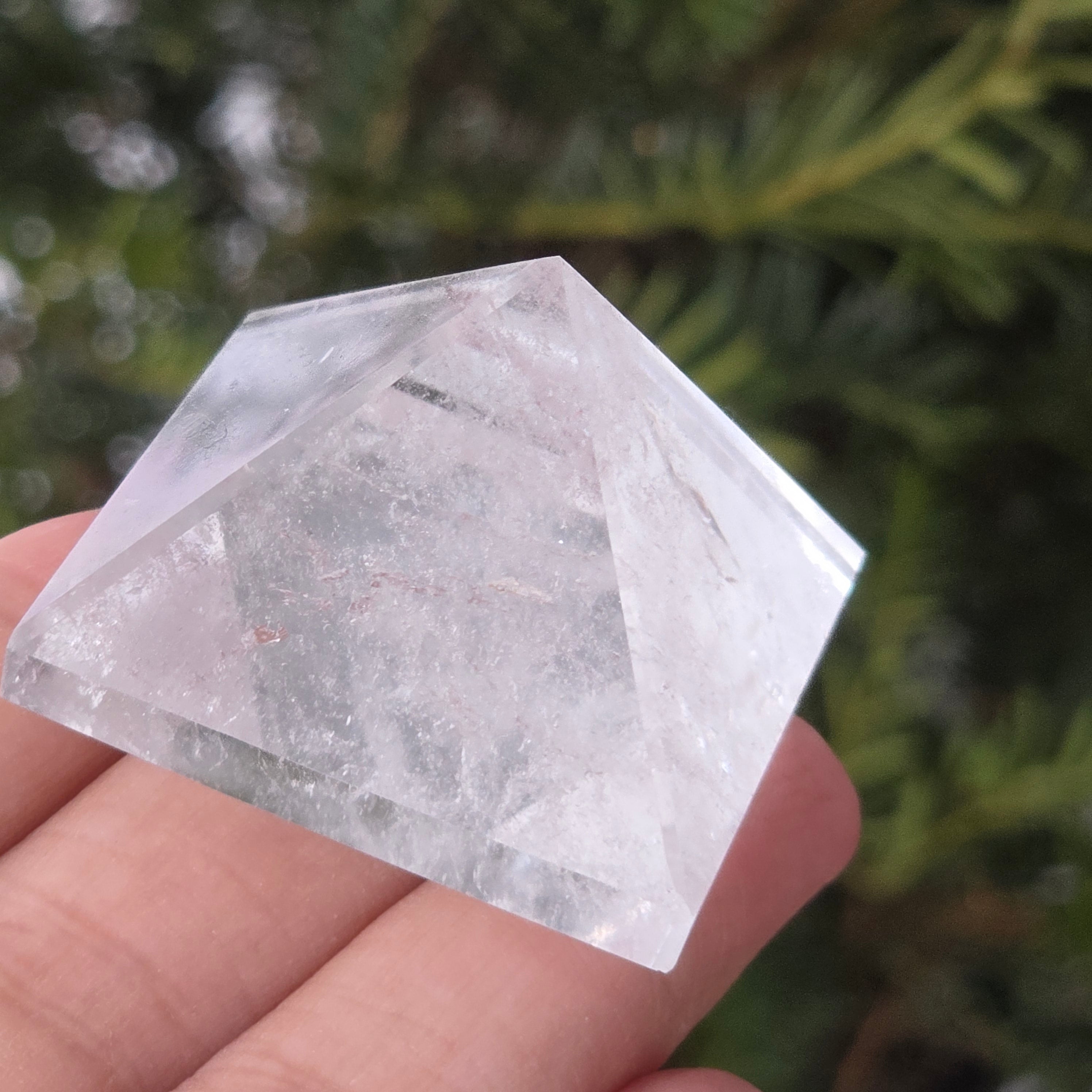 Piramida din cuarț incolor este asociată cu claritatea, amplificarea intenției și echilibrul energetic, forma sa concentrând și direcționând energia într-un mod ordonat. Este folosită adesea ca simbol al minții limpezi și al armoniei dintre gând, emoție și acțiune.