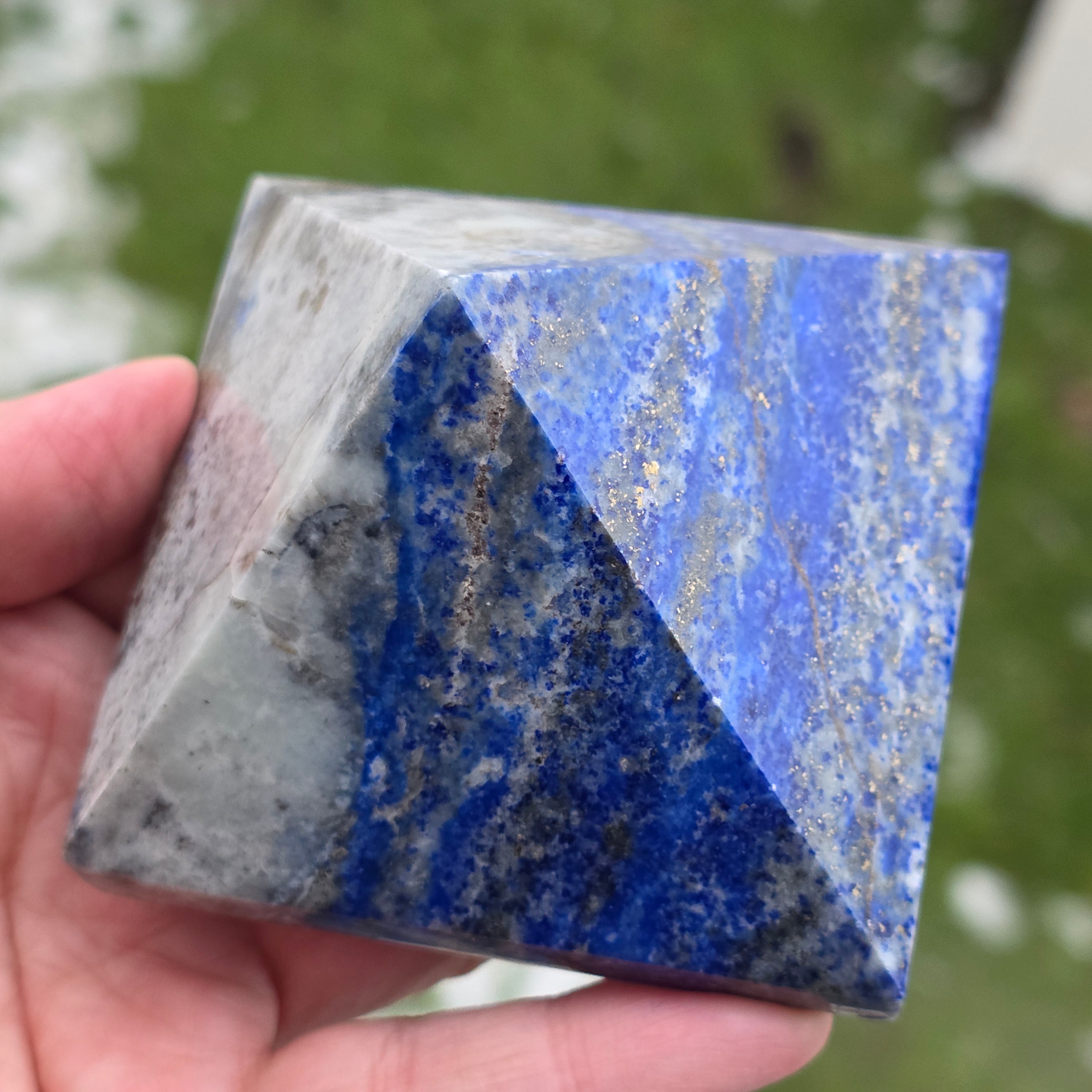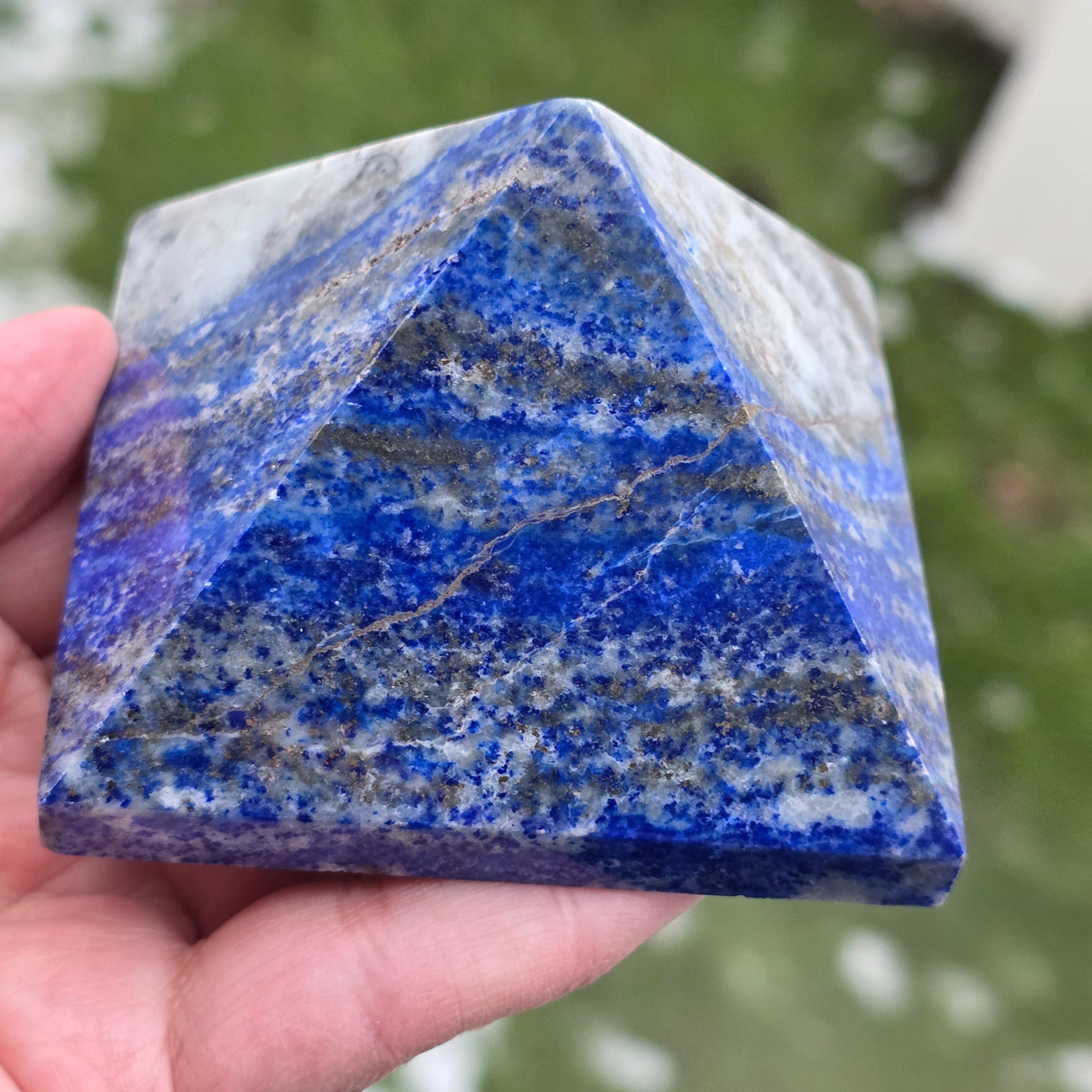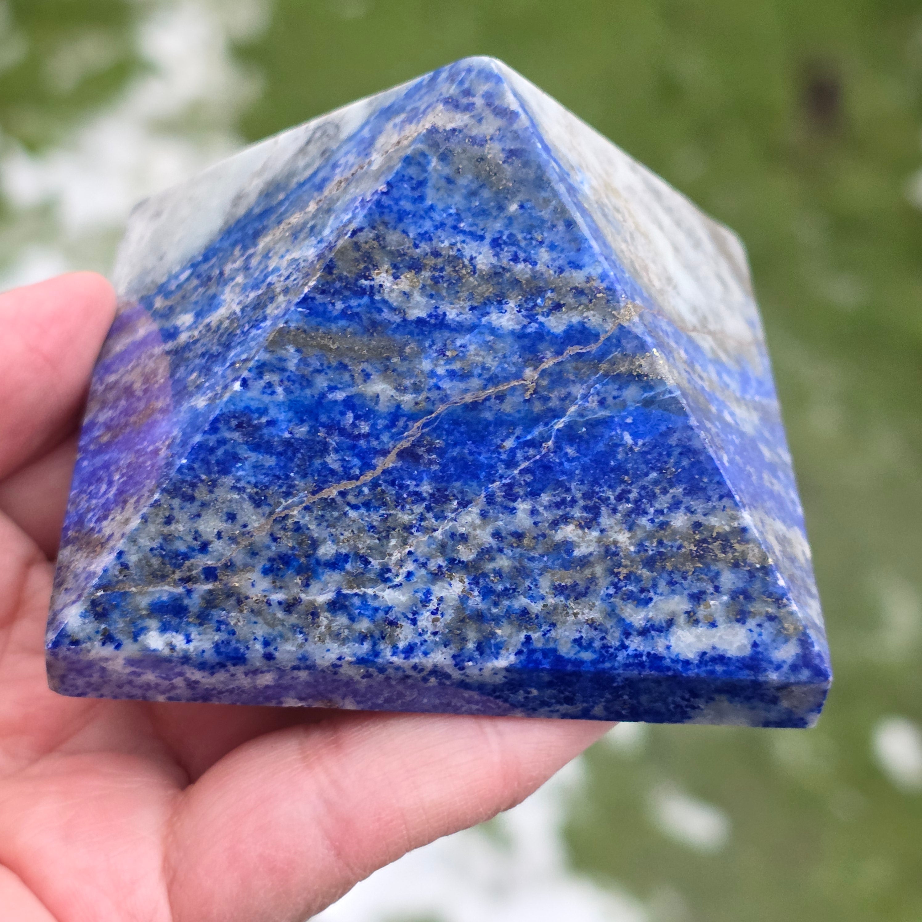 Această piramidă din lapis lazuli natural impresionează prin albastrul său profund, punctat de incluziuni aurii de pirita, și prin prezența sa elegantă. Este o piesă potrivită pentru spații de meditație, birou sau zone dedicate clarității mentale și introspecției. Lapis lazuli este asociat tradițional cu înțelepciunea, adevărul interior și exprimarea autentică, fiind ales adesea pentru susținerea concentrării și a comunicării clare. Forma de piramidă ajută la focalizarea și stabilizarea energiei, transformând această piesă într-un punct de echilibru și inspirație.