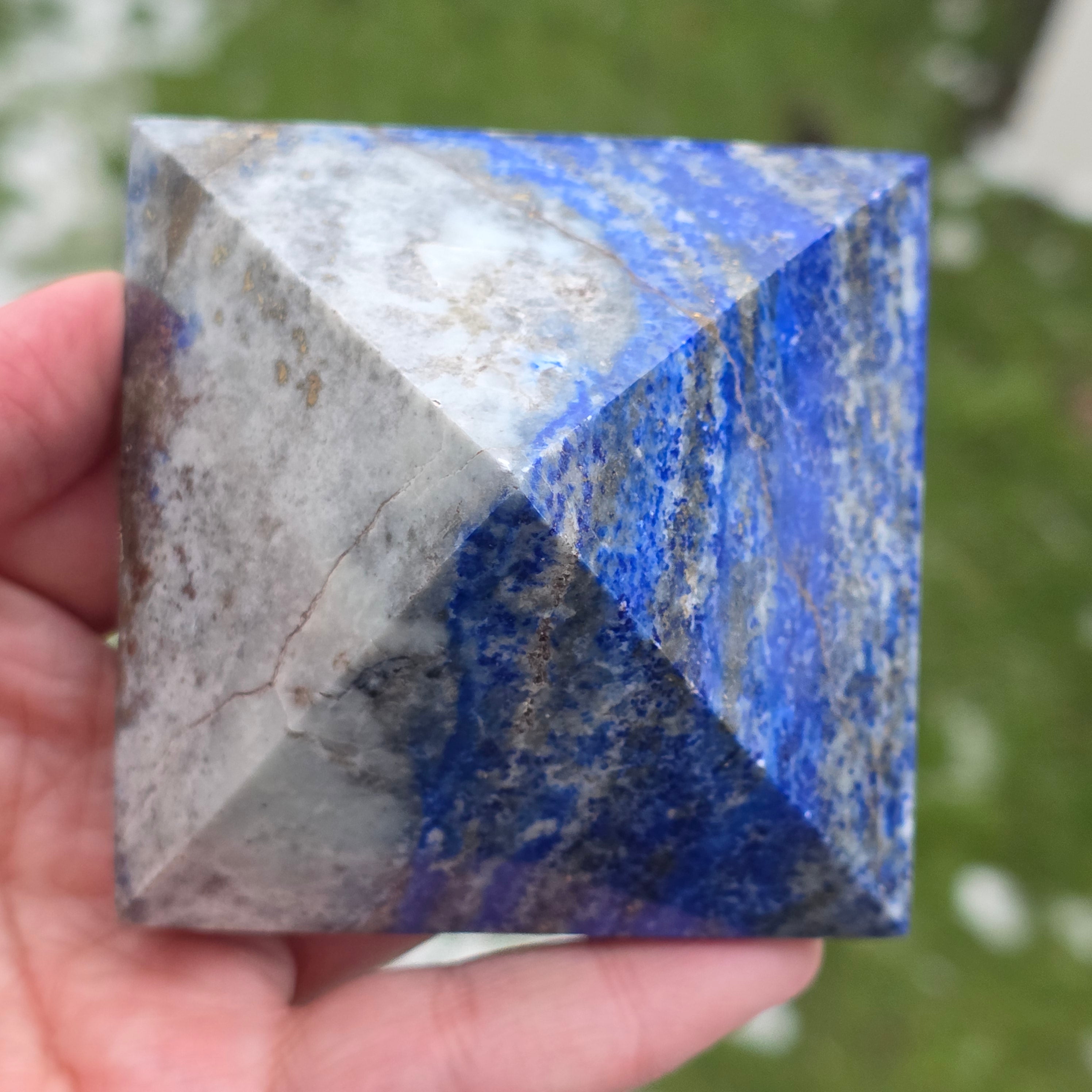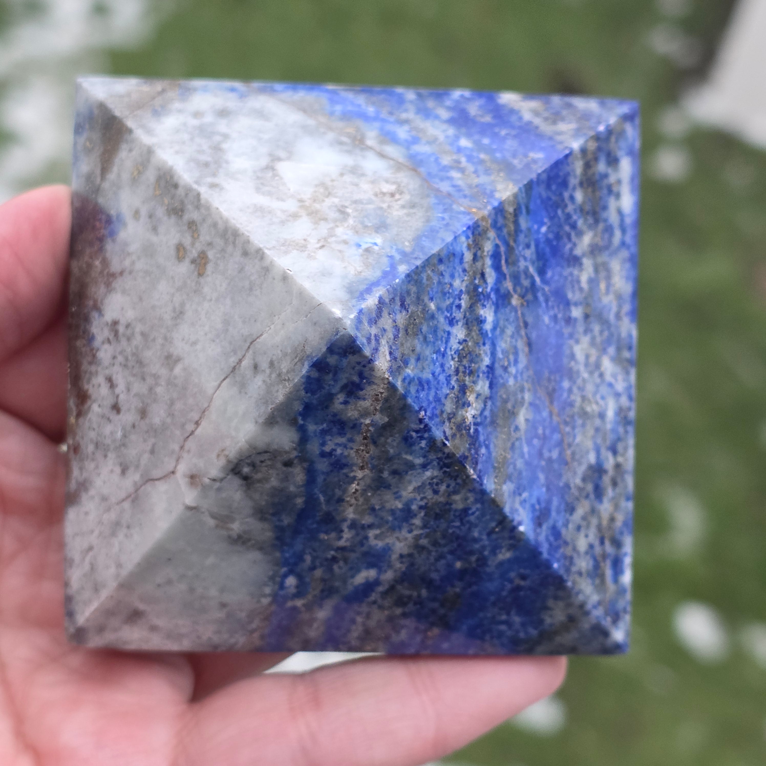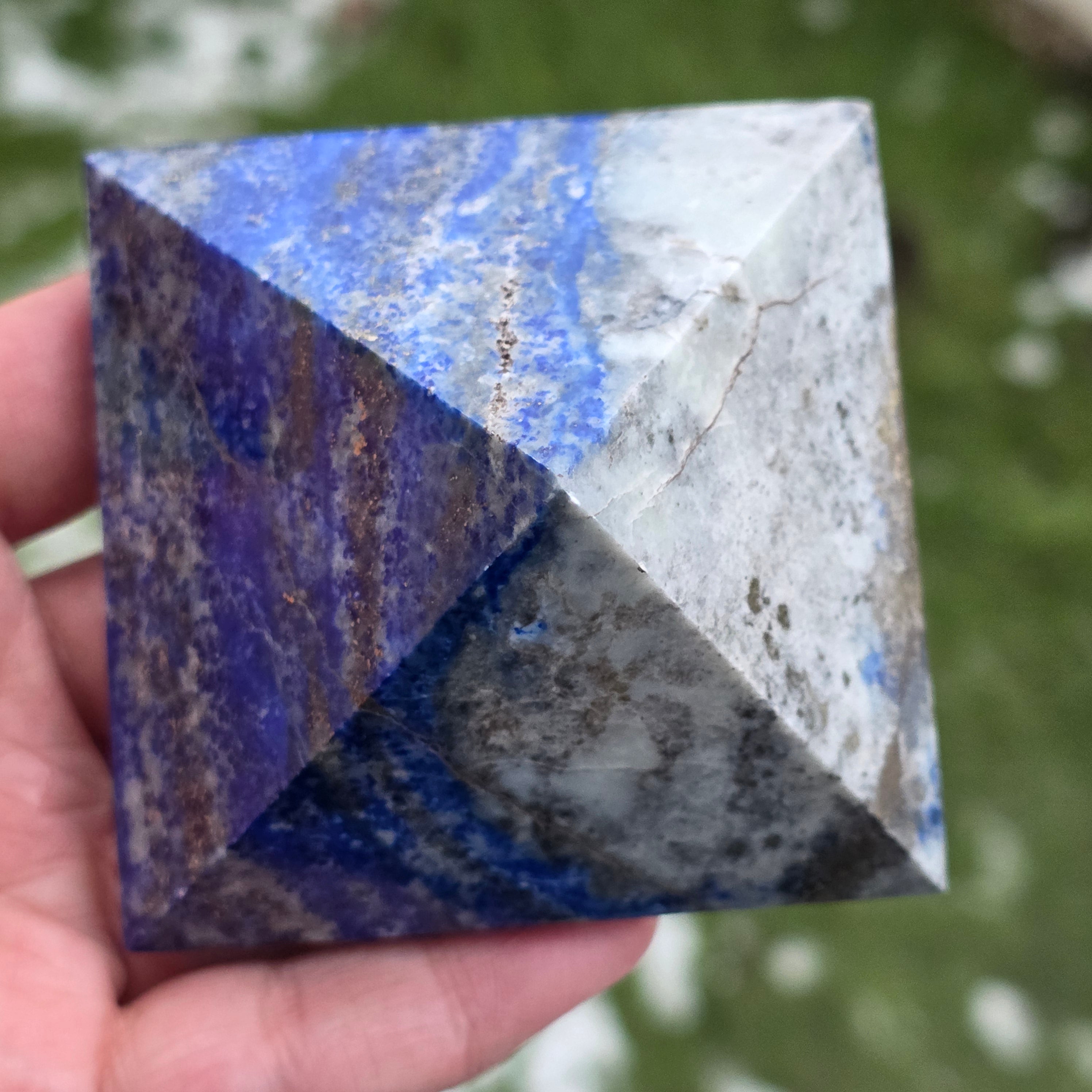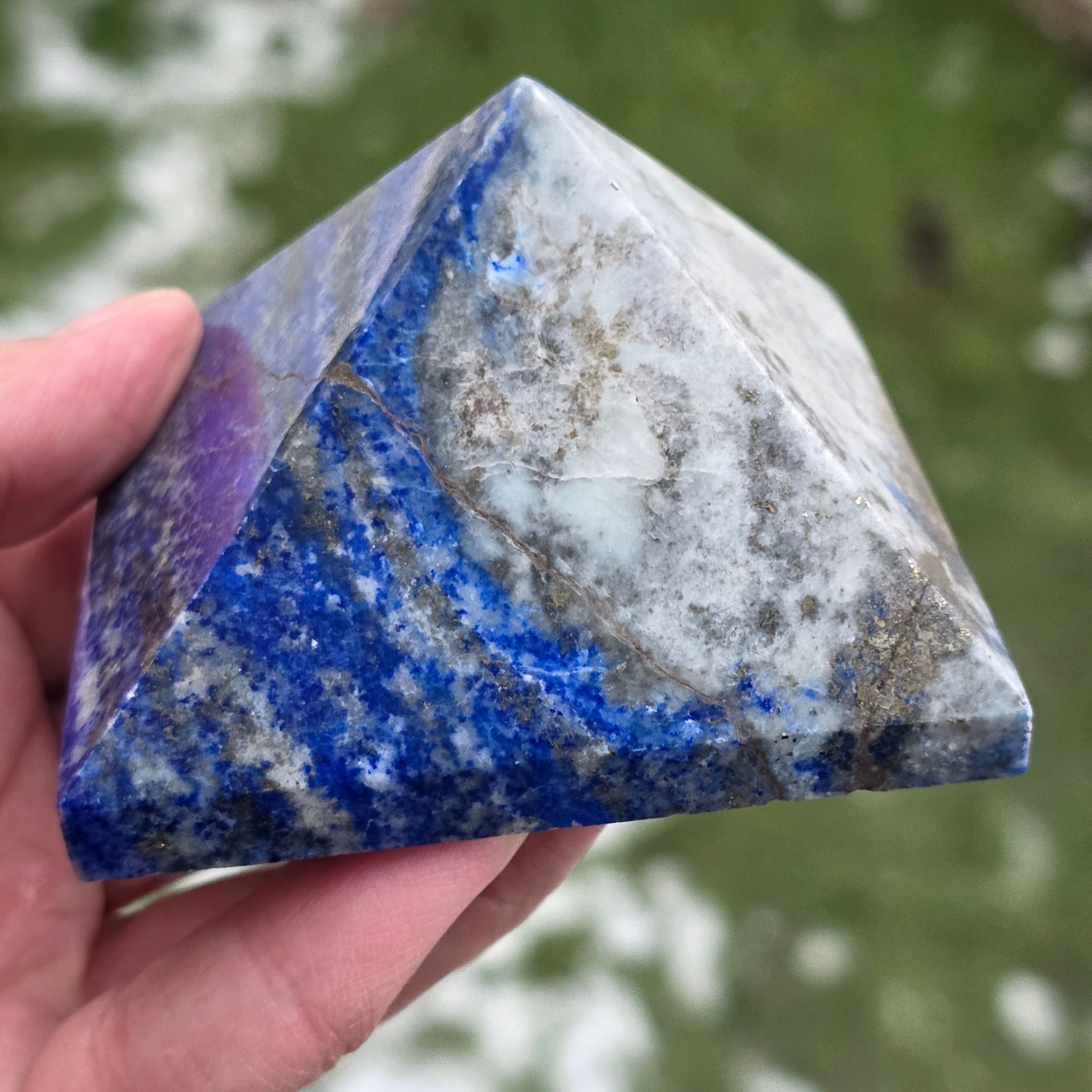 Această piramidă din lapis lazuli natural impresionează prin albastrul său profund, punctat de incluziuni aurii de pirita, și prin prezența sa elegantă. Este o piesă potrivită pentru spații de meditație, birou sau zone dedicate clarității mentale și introspecției. Lapis lazuli este asociat tradițional cu înțelepciunea, adevărul interior și exprimarea autentică, fiind ales adesea pentru susținerea concentrării și a comunicării clare. Forma de piramidă ajută la focalizarea și stabilizarea energiei, transformând această piesă într-un punct de echilibru și inspirație.