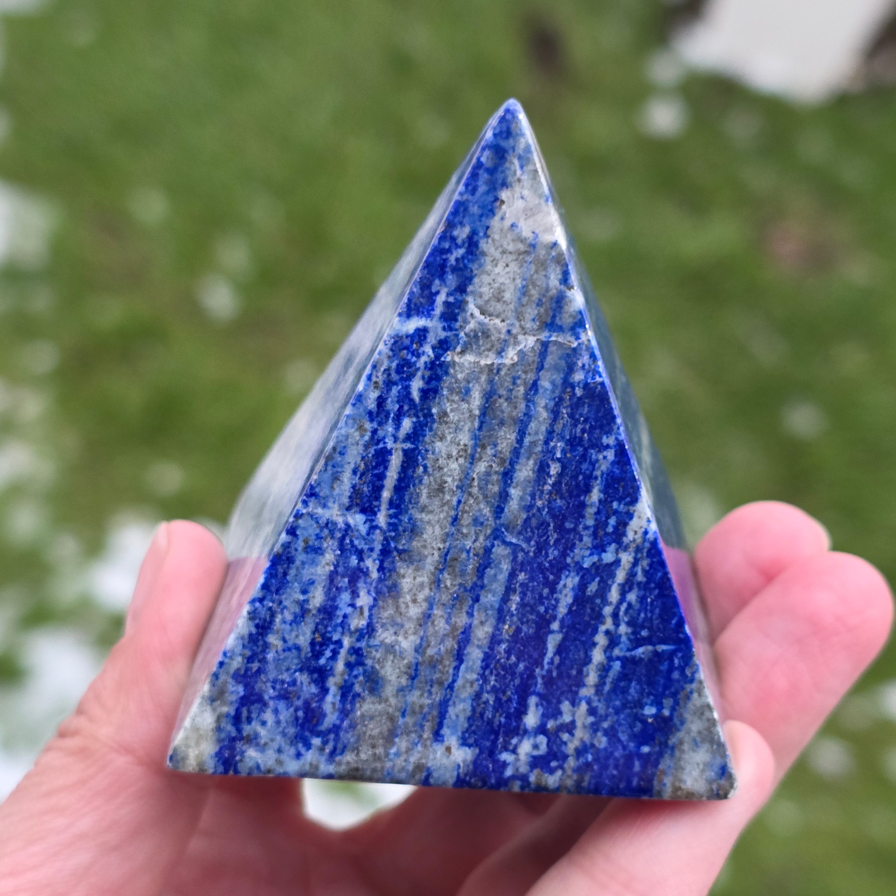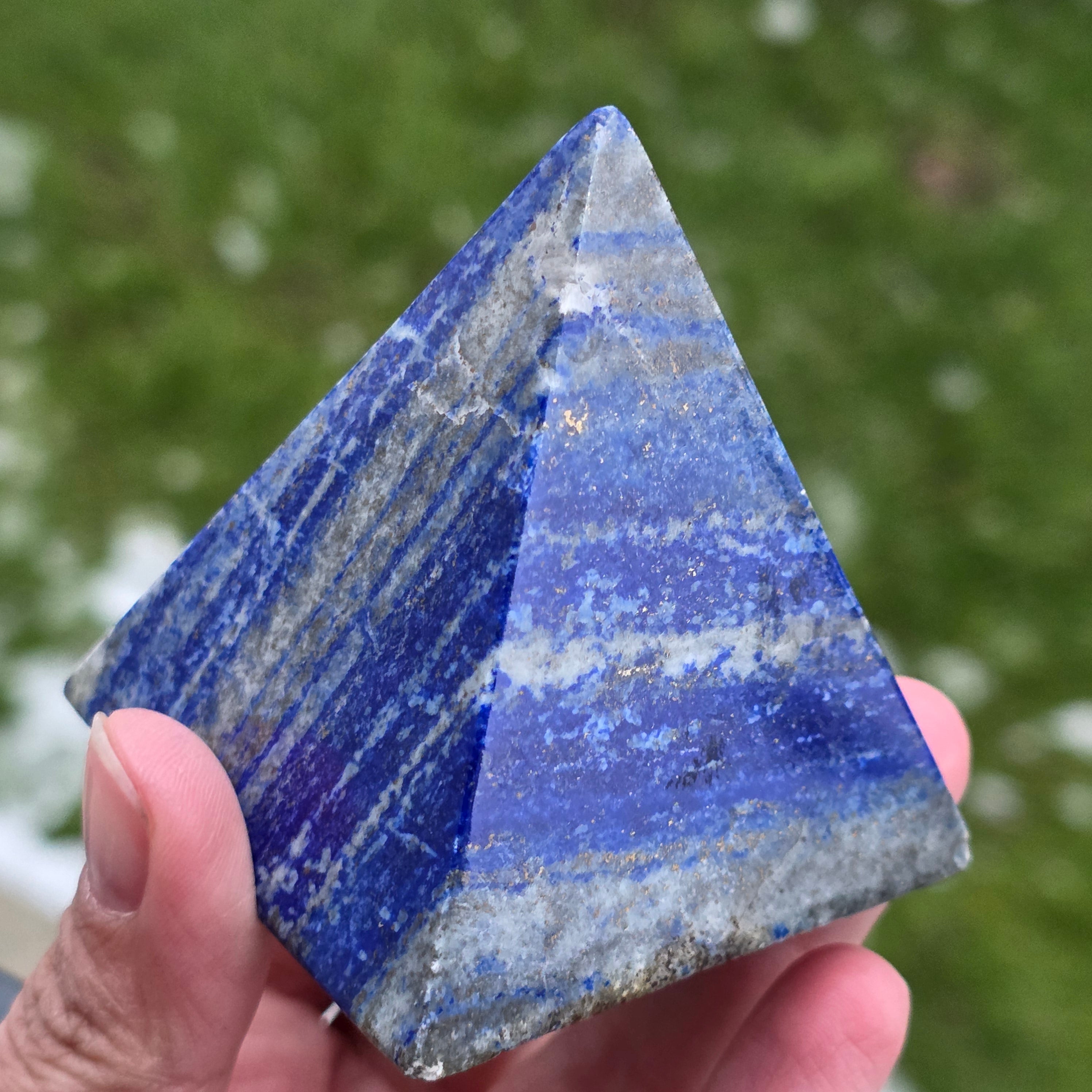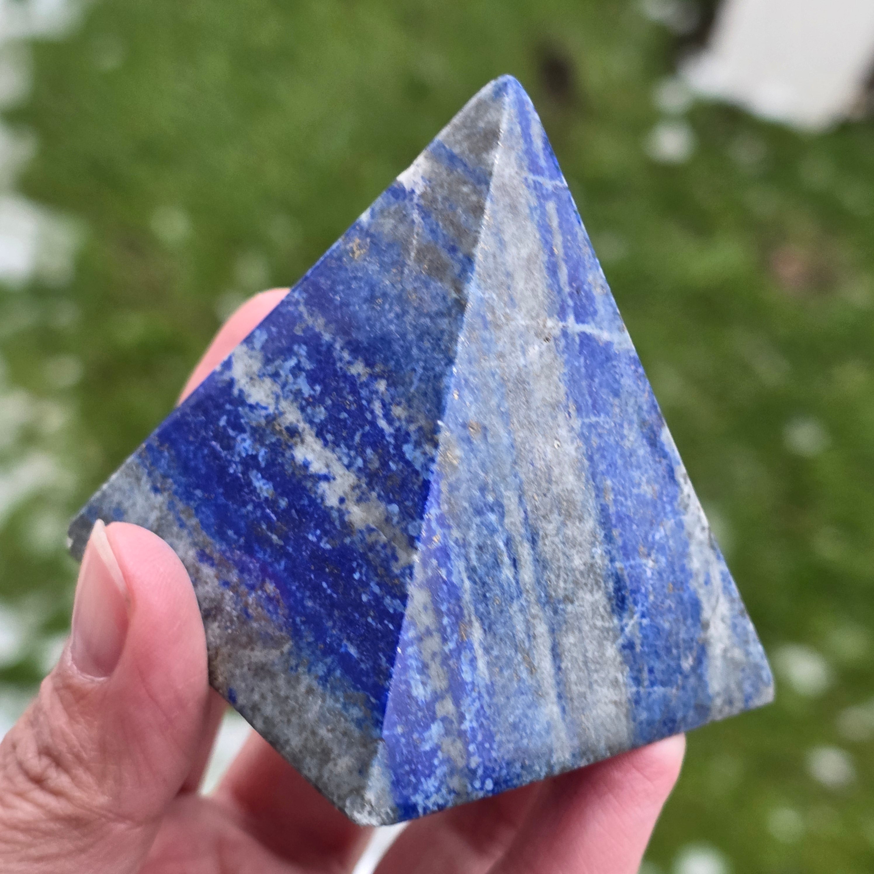 Această piramidă din lapis lazuli natural impresionează prin albastrul său profund, punctat de incluziuni aurii de pirita, și prin prezența sa elegantă. Este o piesă potrivită pentru spații de meditație, birou sau zone dedicate clarității mentale și introspecției. Lapis lazuli este asociat tradițional cu înțelepciunea, adevărul interior și exprimarea autentică, fiind ales adesea pentru susținerea concentrării și a comunicării clare. Forma de piramidă ajută la focalizarea și stabilizarea energiei, transformând această piesă într-un punct de echilibru și inspirație.