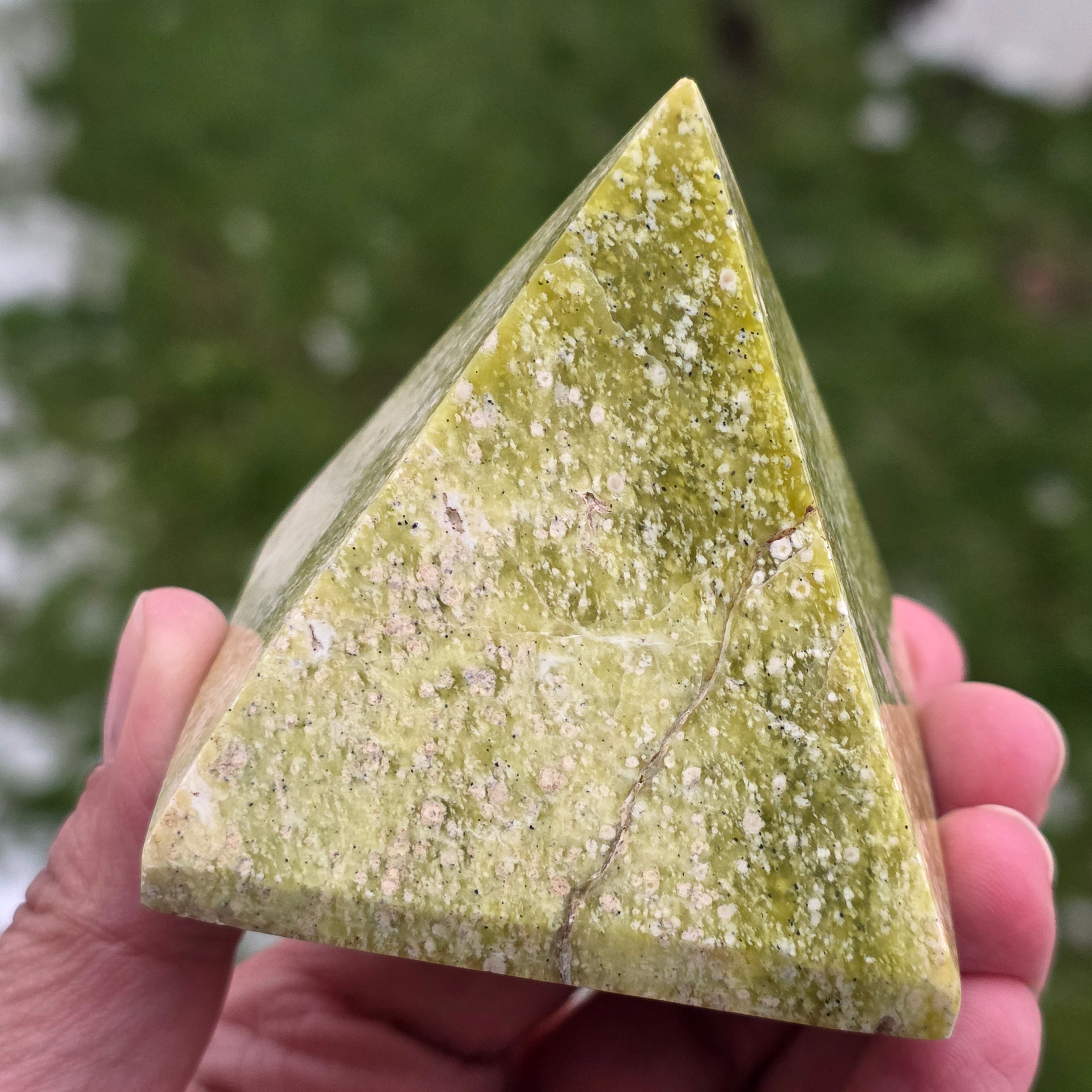 Această piramidă din serpentin galben natural este o piesă luminoasă și echilibrantă, potrivită pentru spații de meditație, birou sau zone dedicate regenerării interioare. Serpentinul galben este asociat cu revitalizarea energiei, claritatea mentală și susținerea proceselor de echilibrare emoțională. Forma de piramidă ajută la concentrarea și stabilizarea energiei, transformând această piesă într-un punct de susținere subtilă pentru focus, armonie și reconectare.