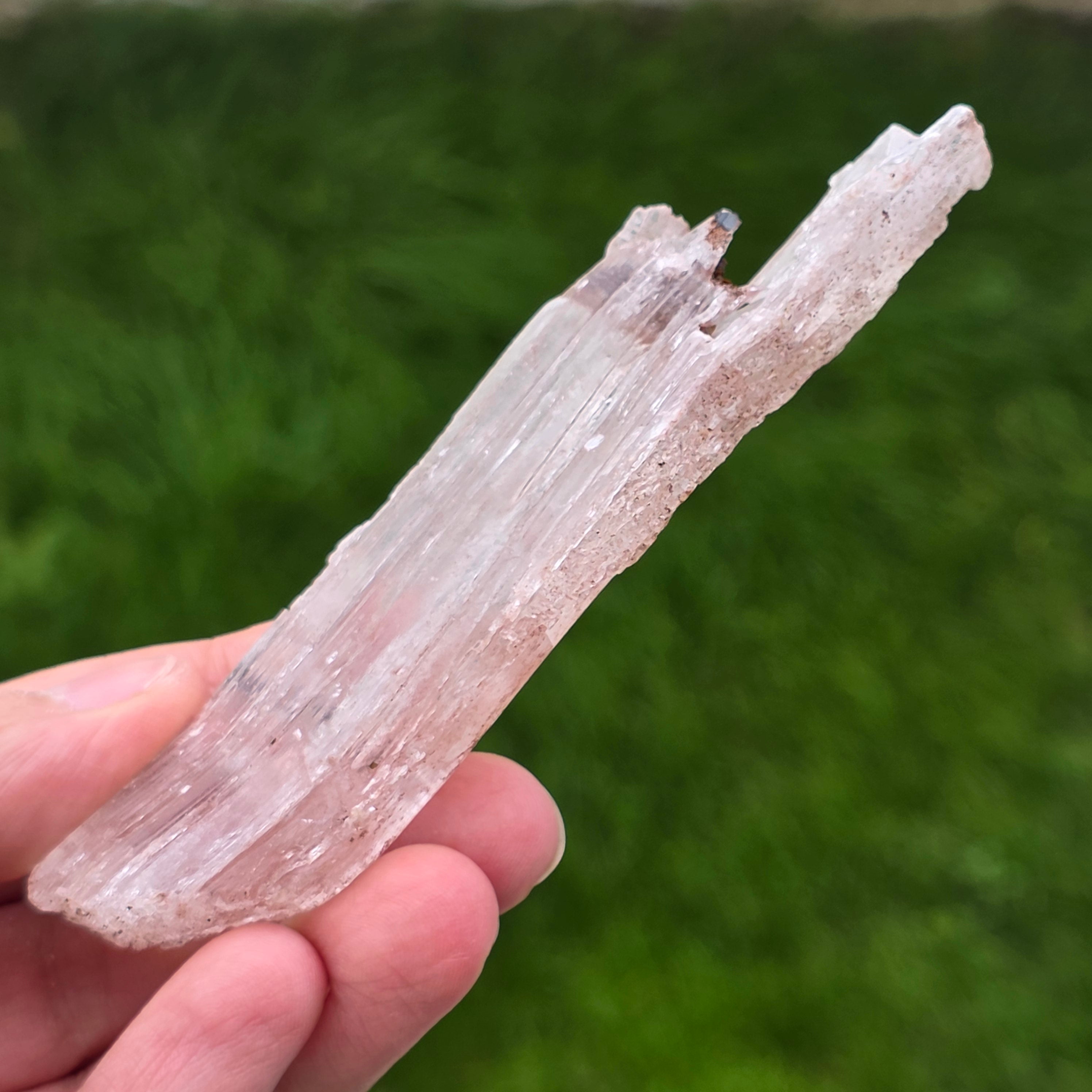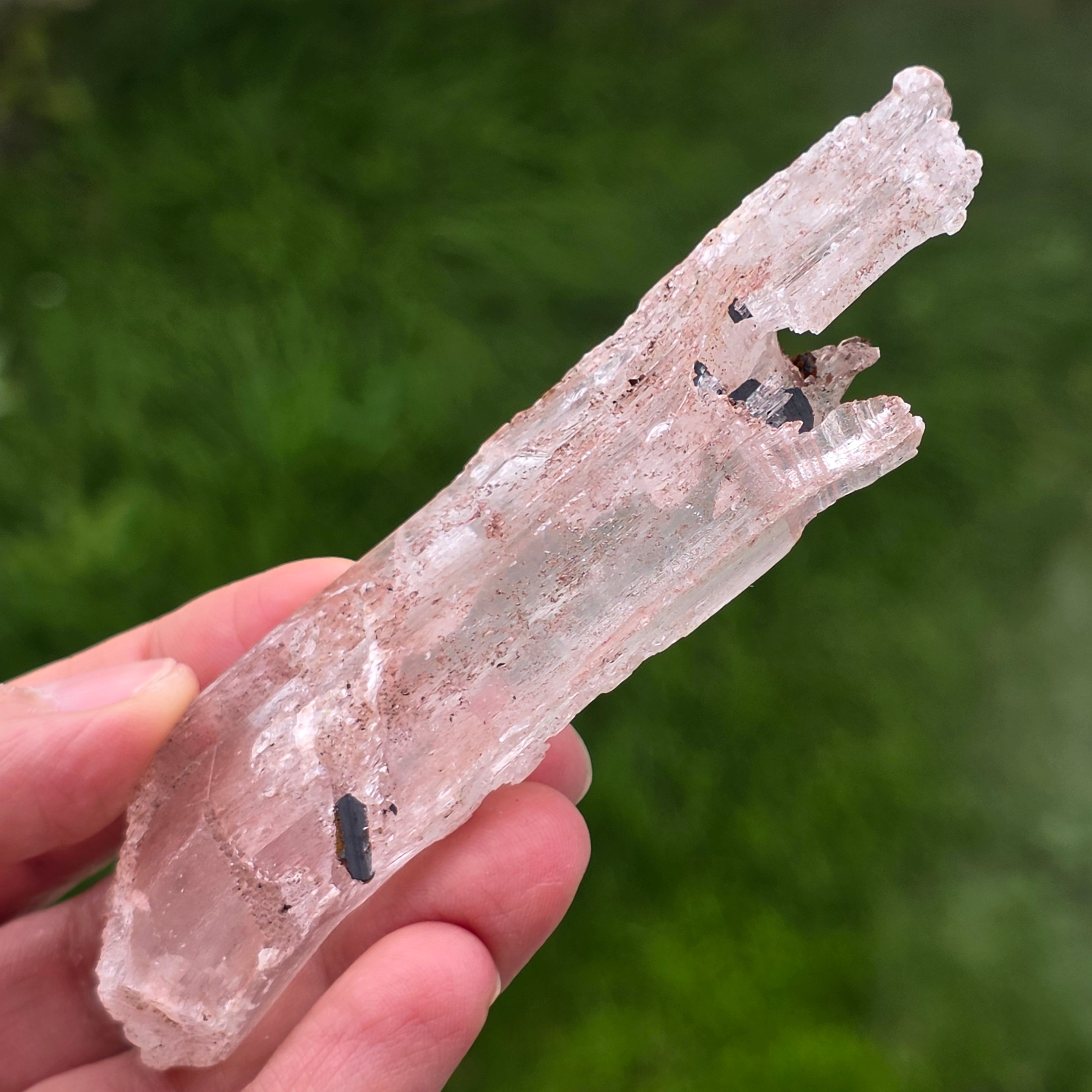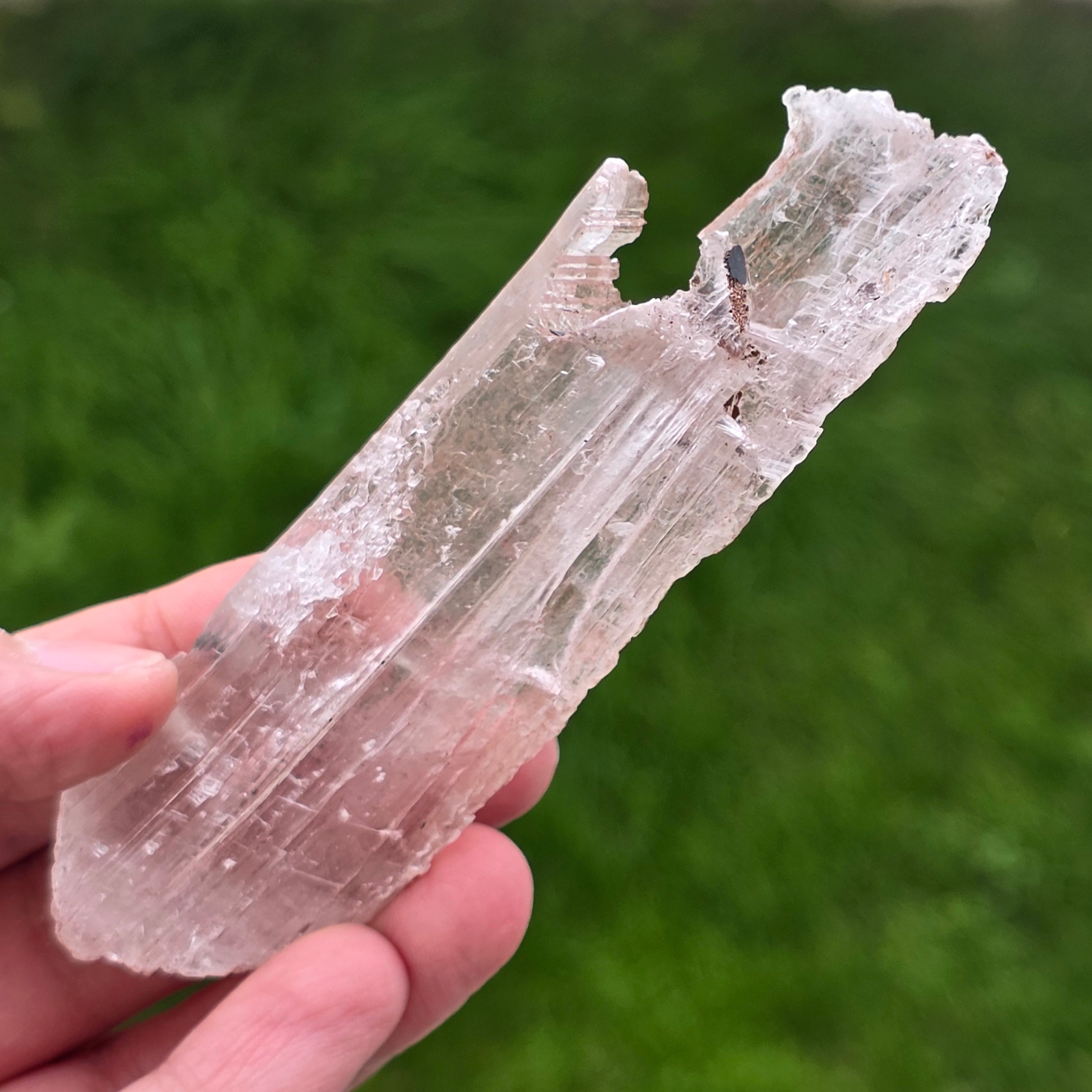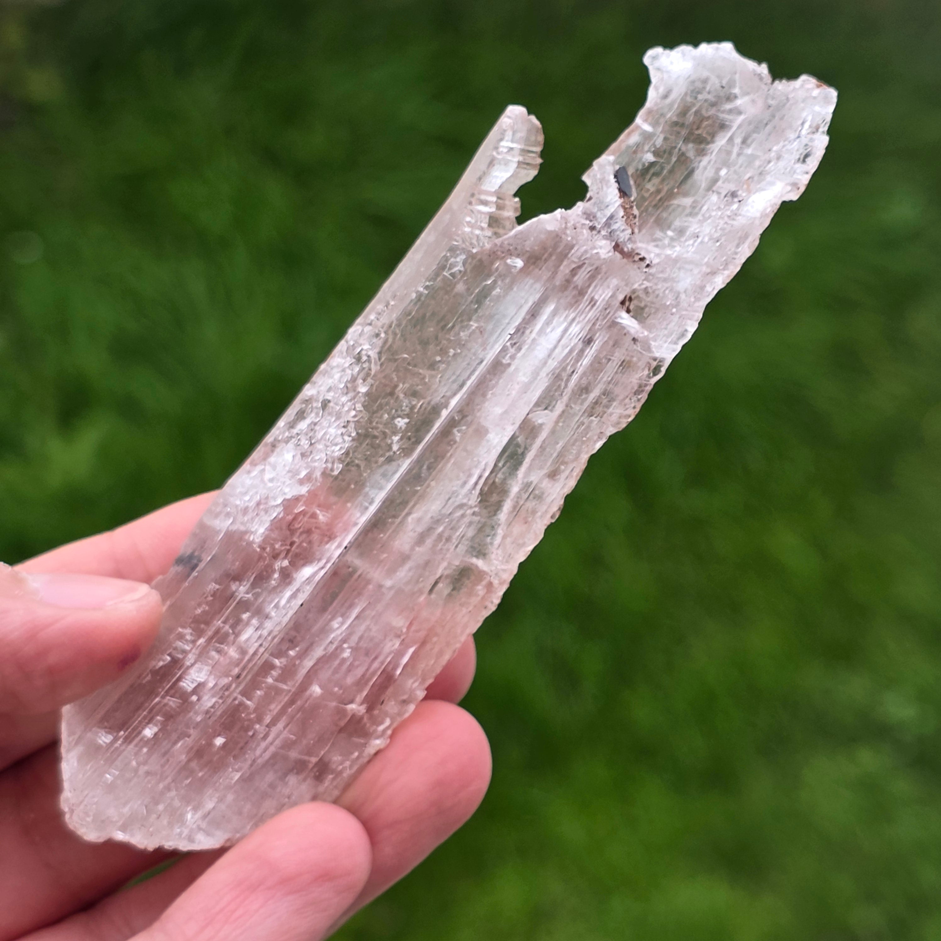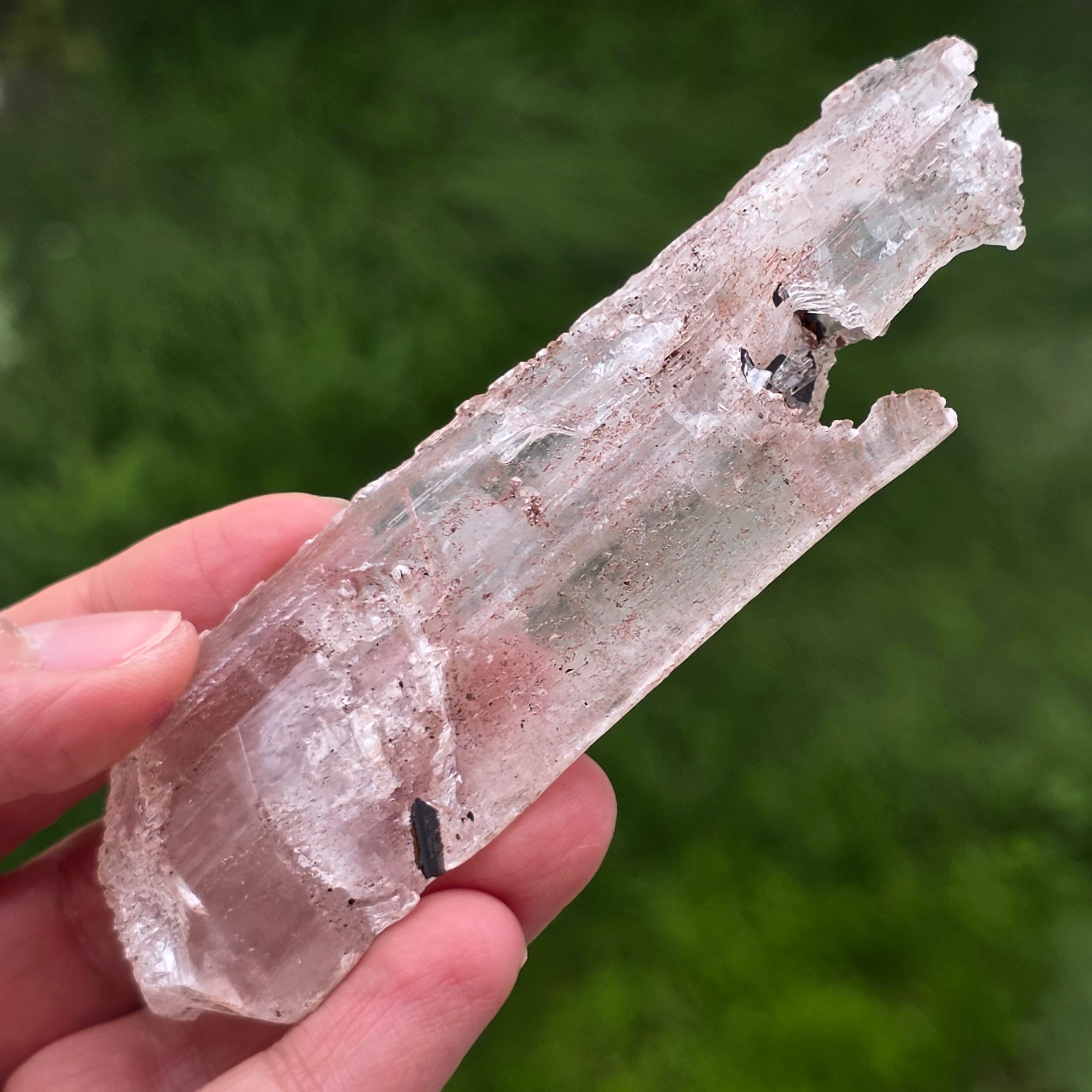 Selenitul apare sub formă de cristale alungite sau plăci translucide, cu luciu mătăsos și textură fină, în timp ce hematitul este prezent sub formă de incluziuni, pelicule sau depuneri naturale, care accentuează structura cristalului și îi conferă profunzime vizuală.