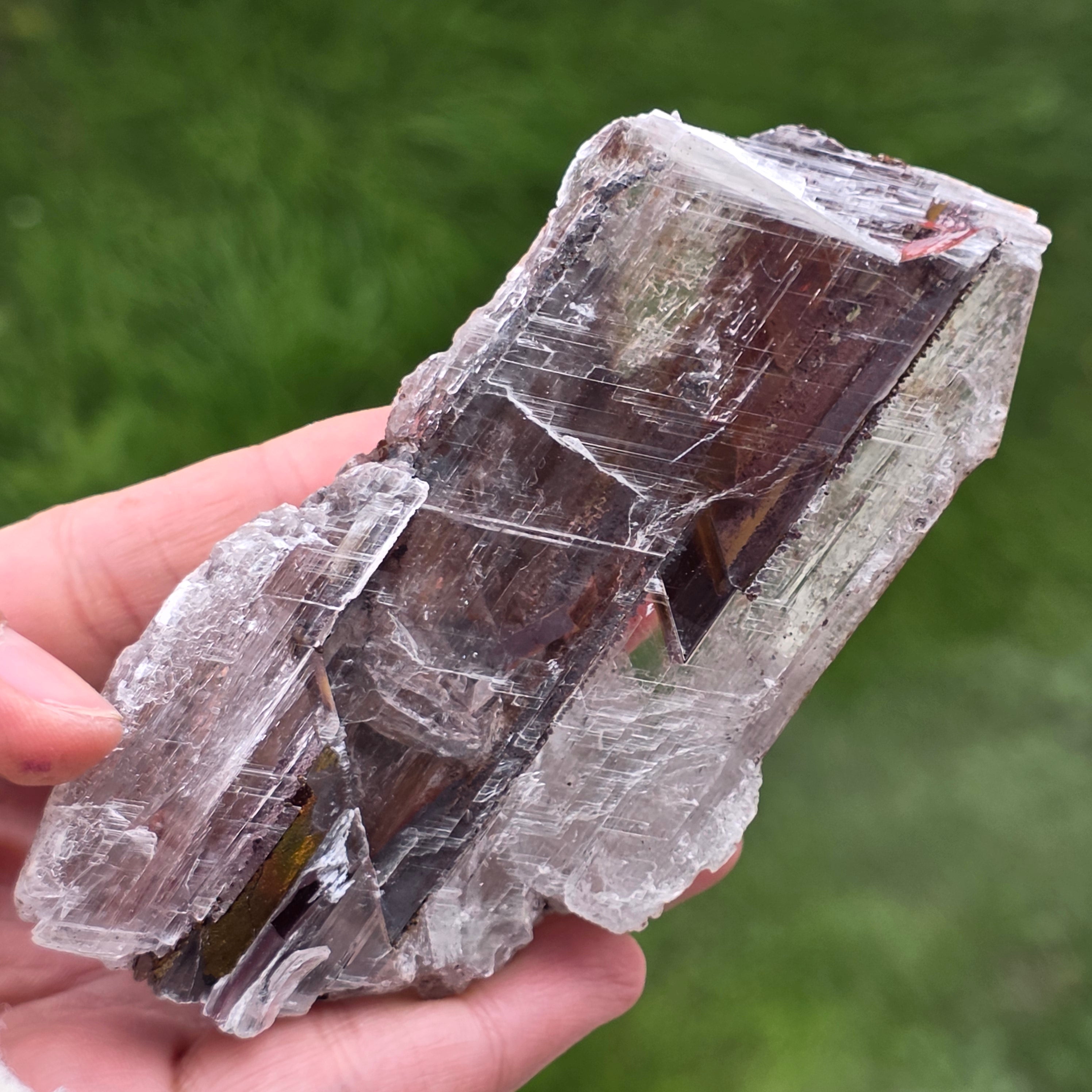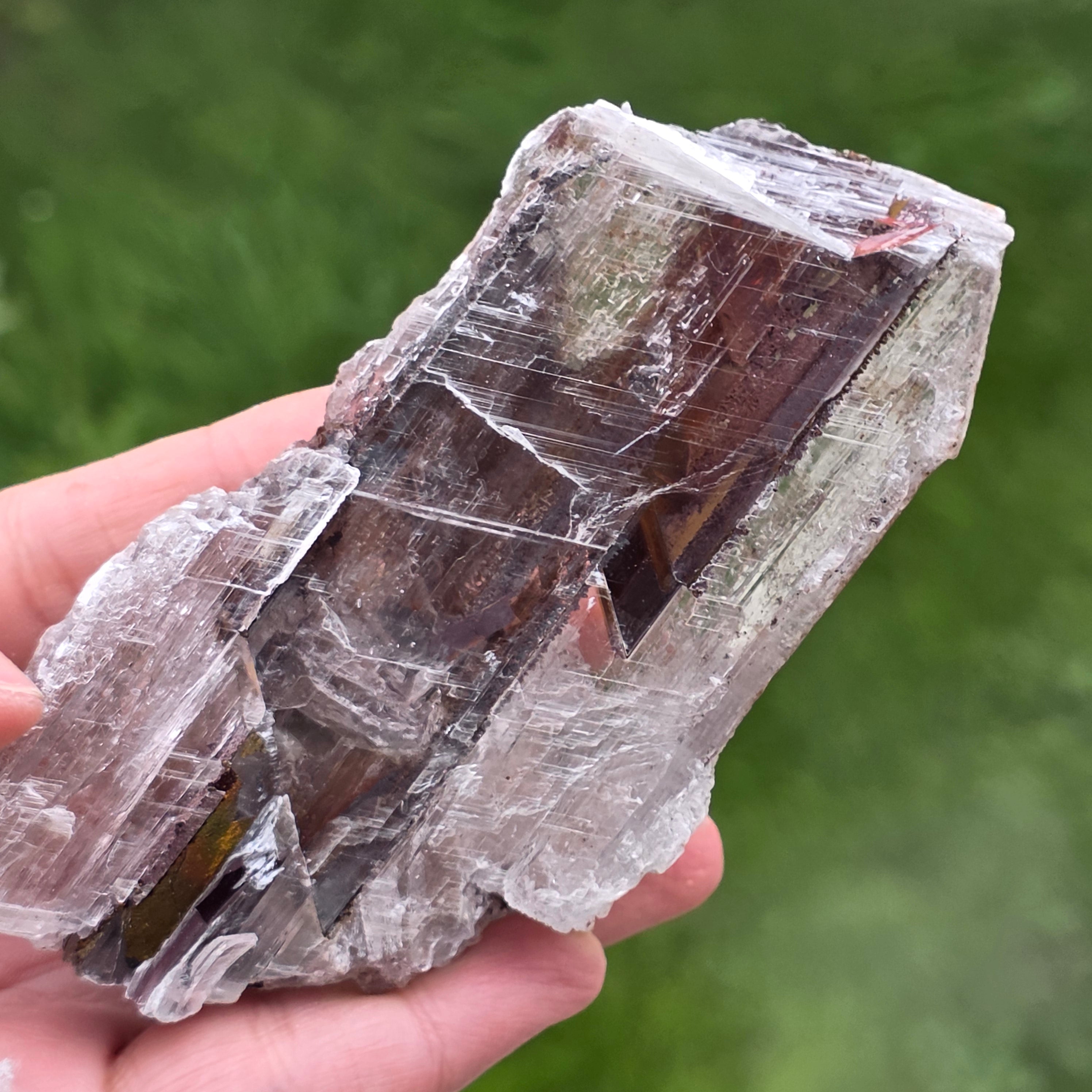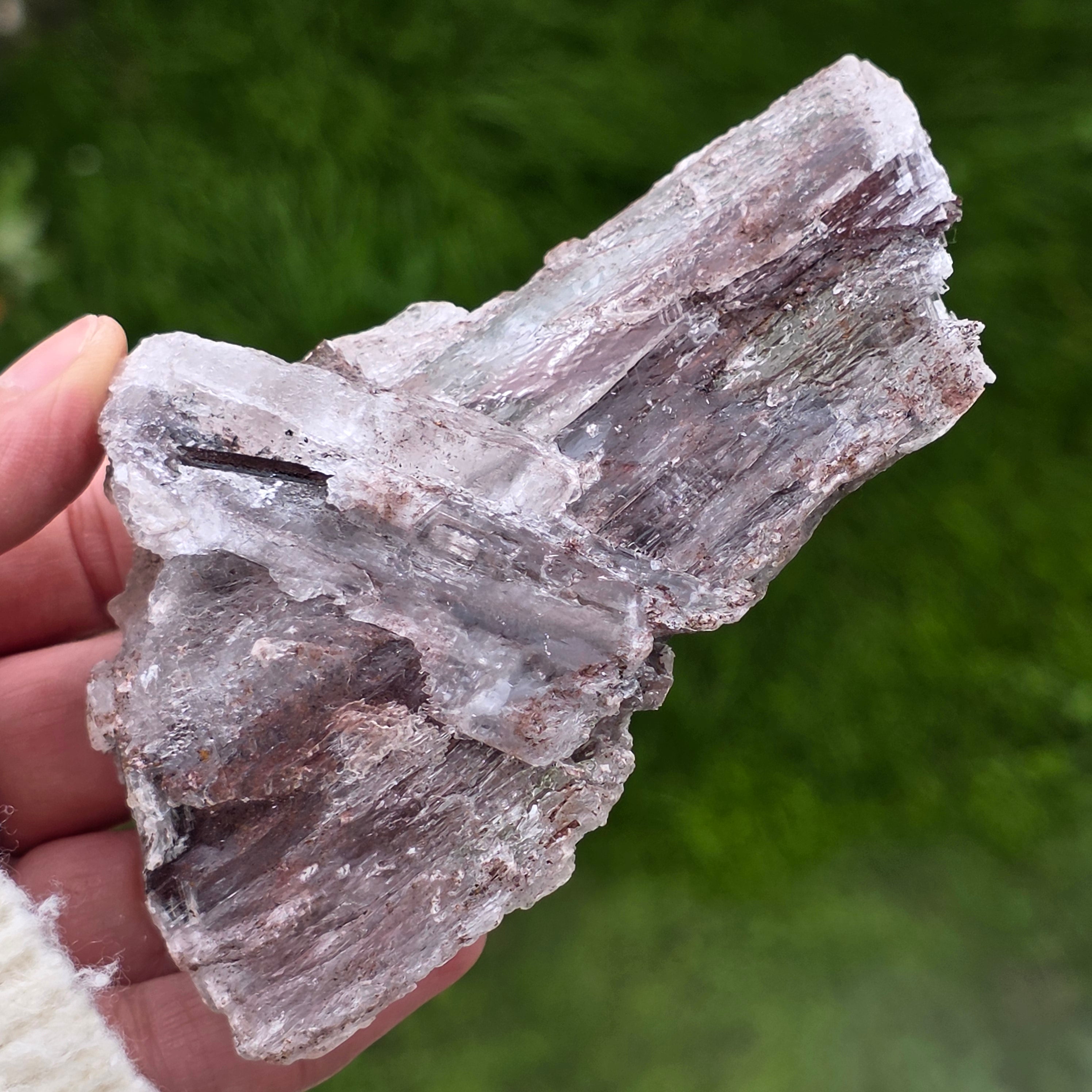 Selenitul apare sub formă de cristale alungite sau plăci translucide, cu luciu mătăsos și textură fină, în timp ce hematitul este prezent sub formă de incluziuni, pelicule sau depuneri naturale, care accentuează structura cristalului și îi conferă profunzime vizuală.