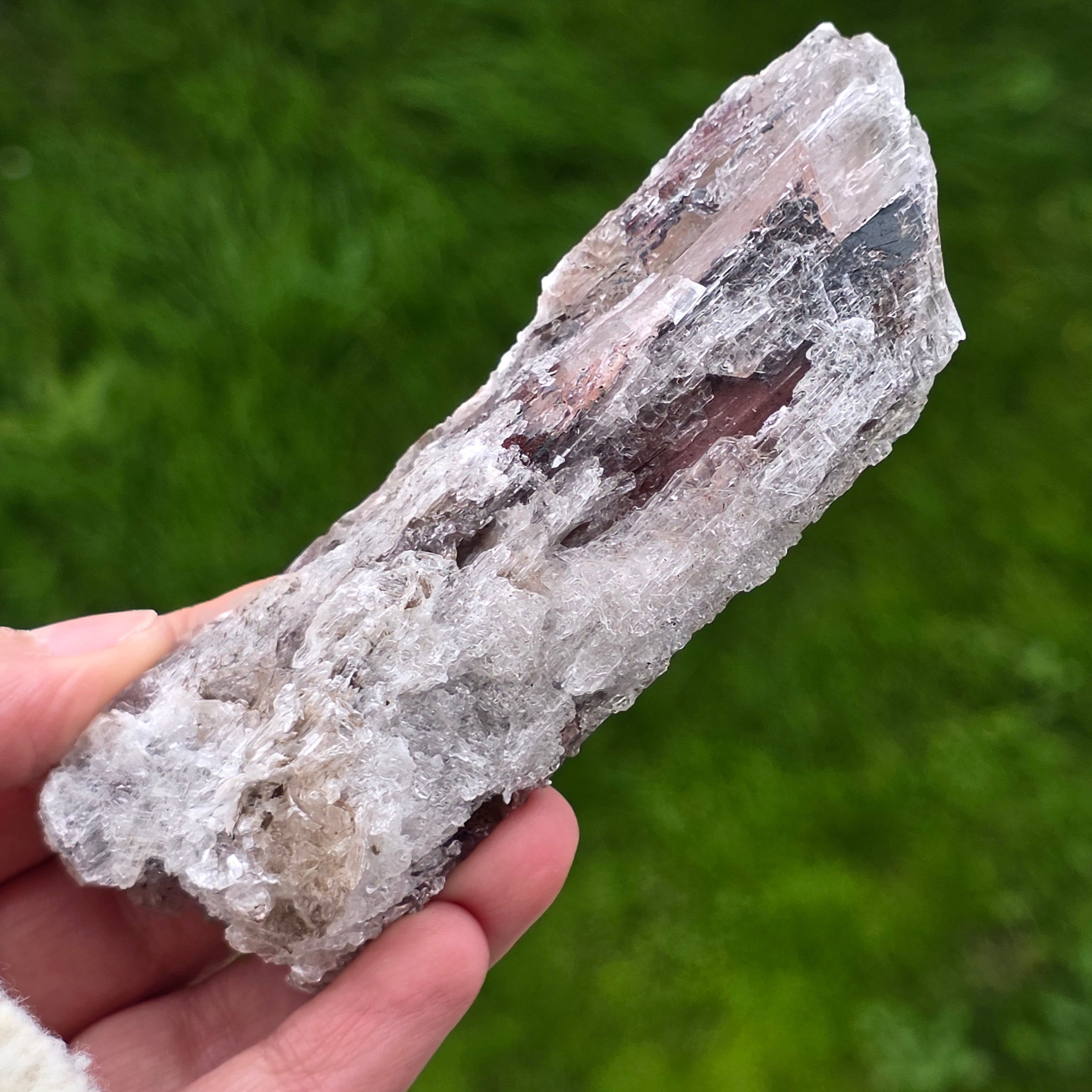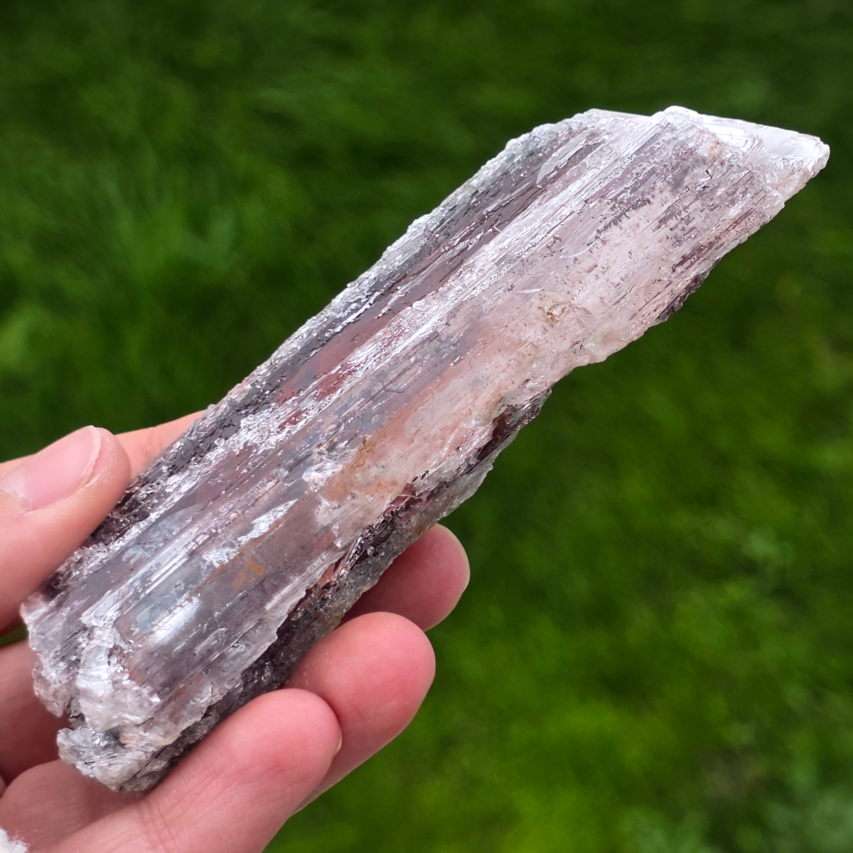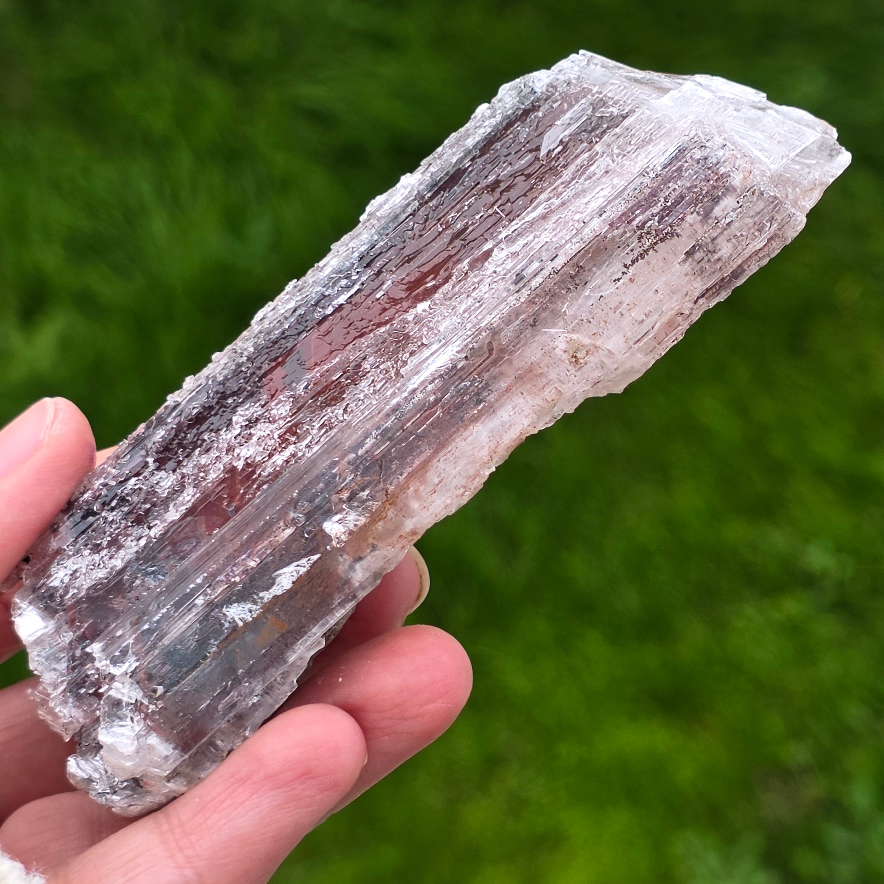 Selenitul apare sub formă de cristale alungite sau plăci translucide, cu luciu mătăsos și textură fină, în timp ce hematitul este prezent sub formă de incluziuni, pelicule sau depuneri naturale, care accentuează structura cristalului și îi conferă profunzime vizuală.