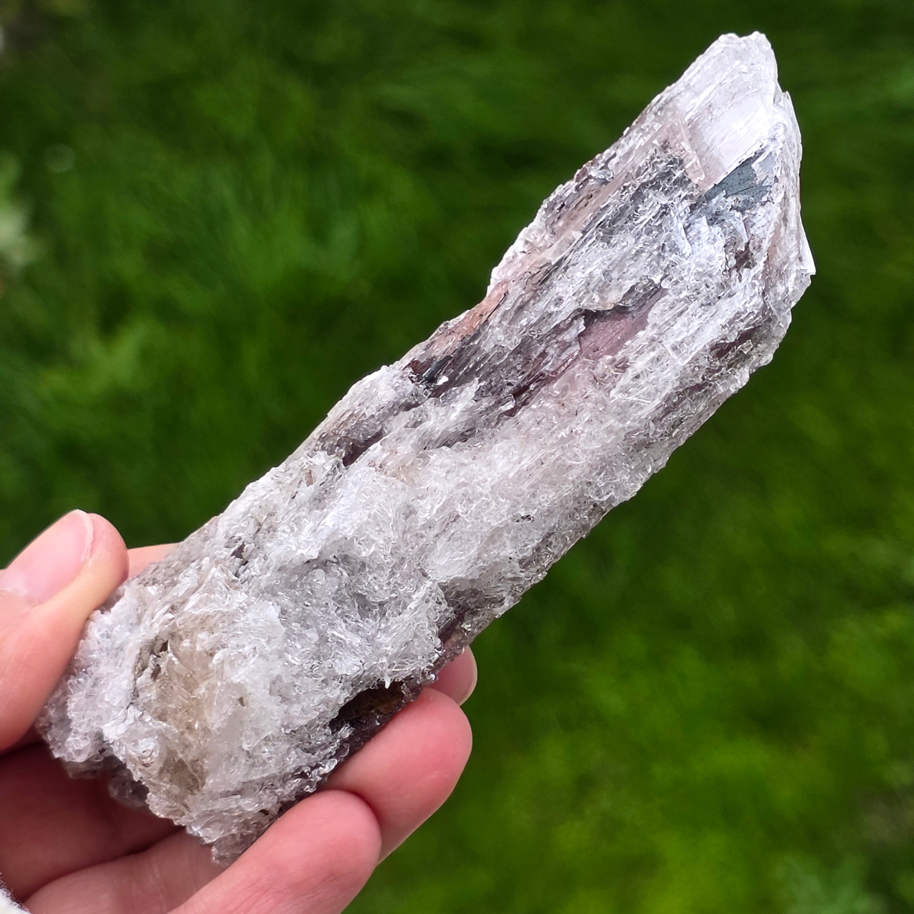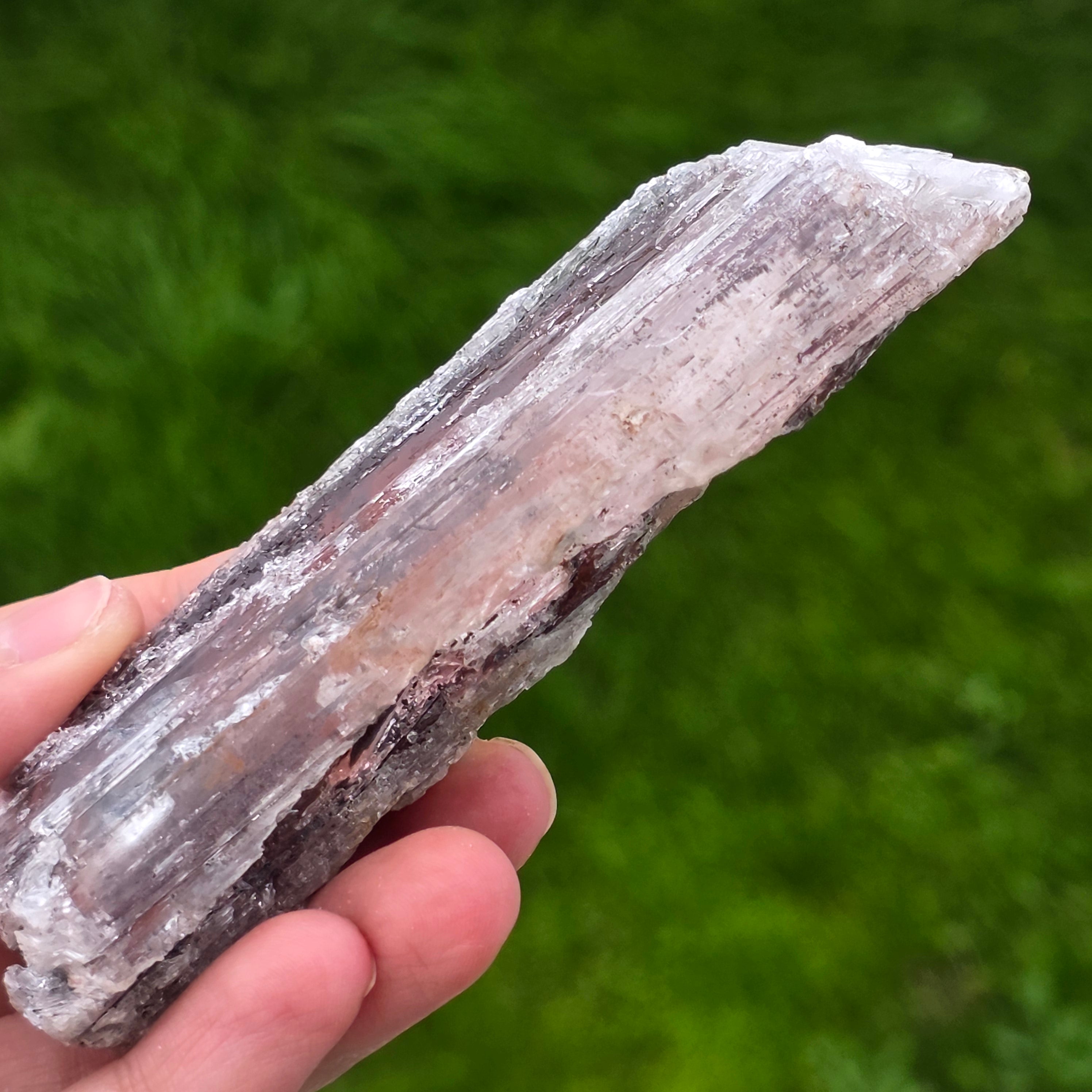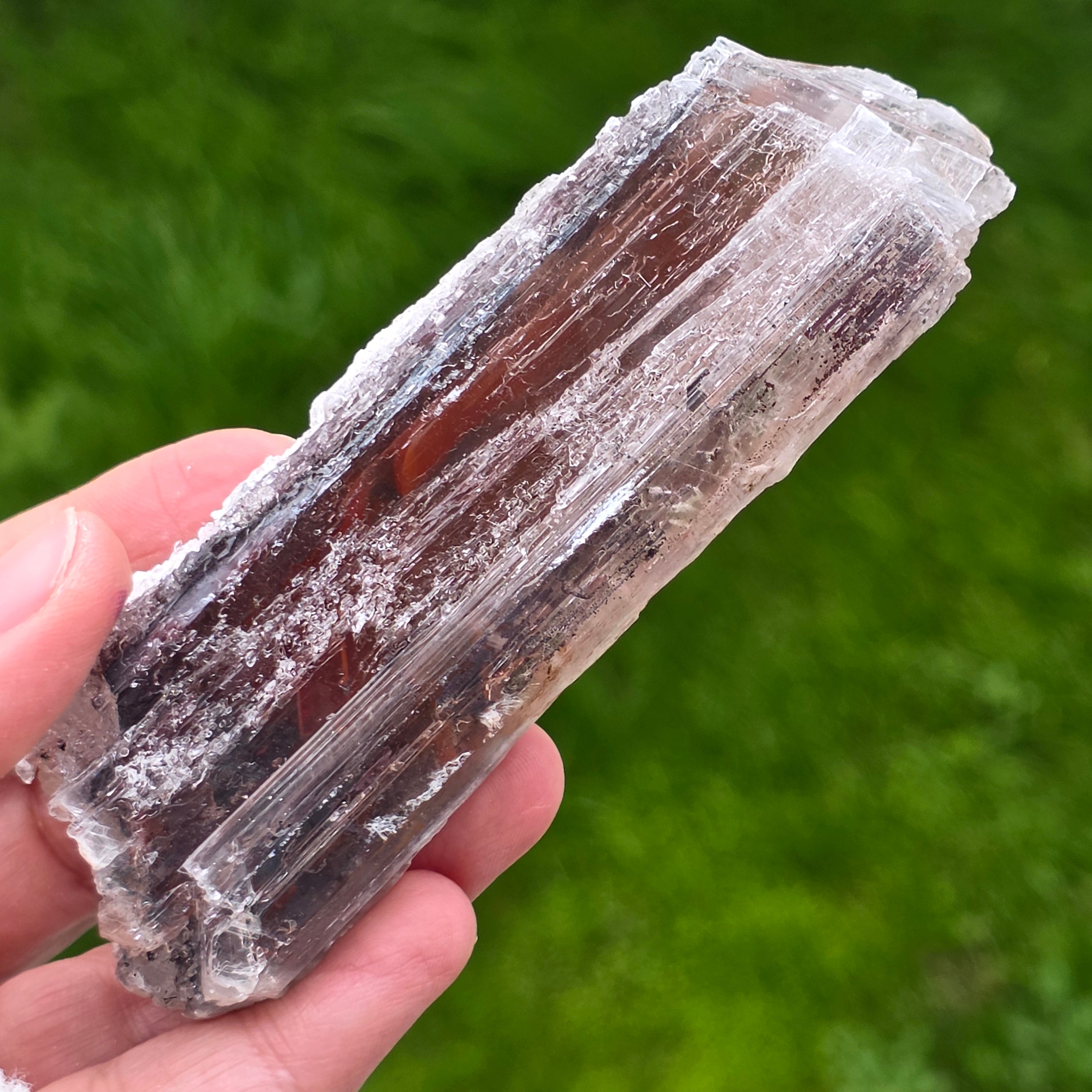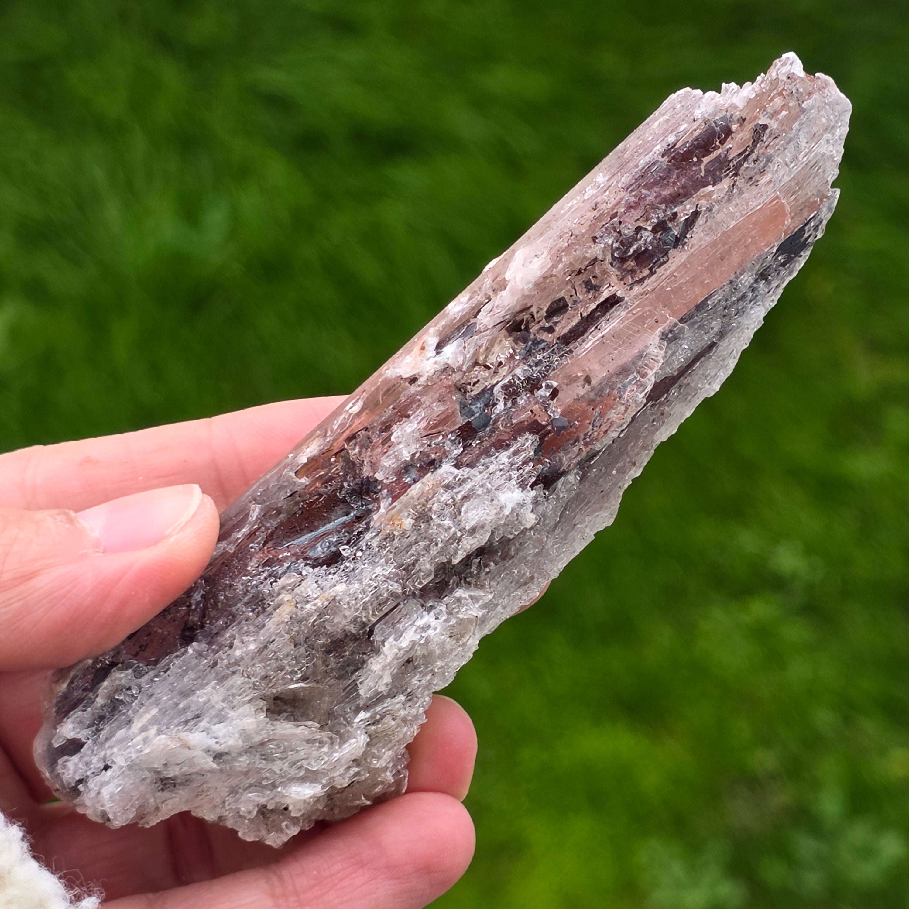 Selenitul apare sub formă de cristale alungite sau plăci translucide, cu luciu mătăsos și textură fină, în timp ce hematitul este prezent sub formă de incluziuni, pelicule sau depuneri naturale, care accentuează structura cristalului și îi conferă profunzime vizuală.