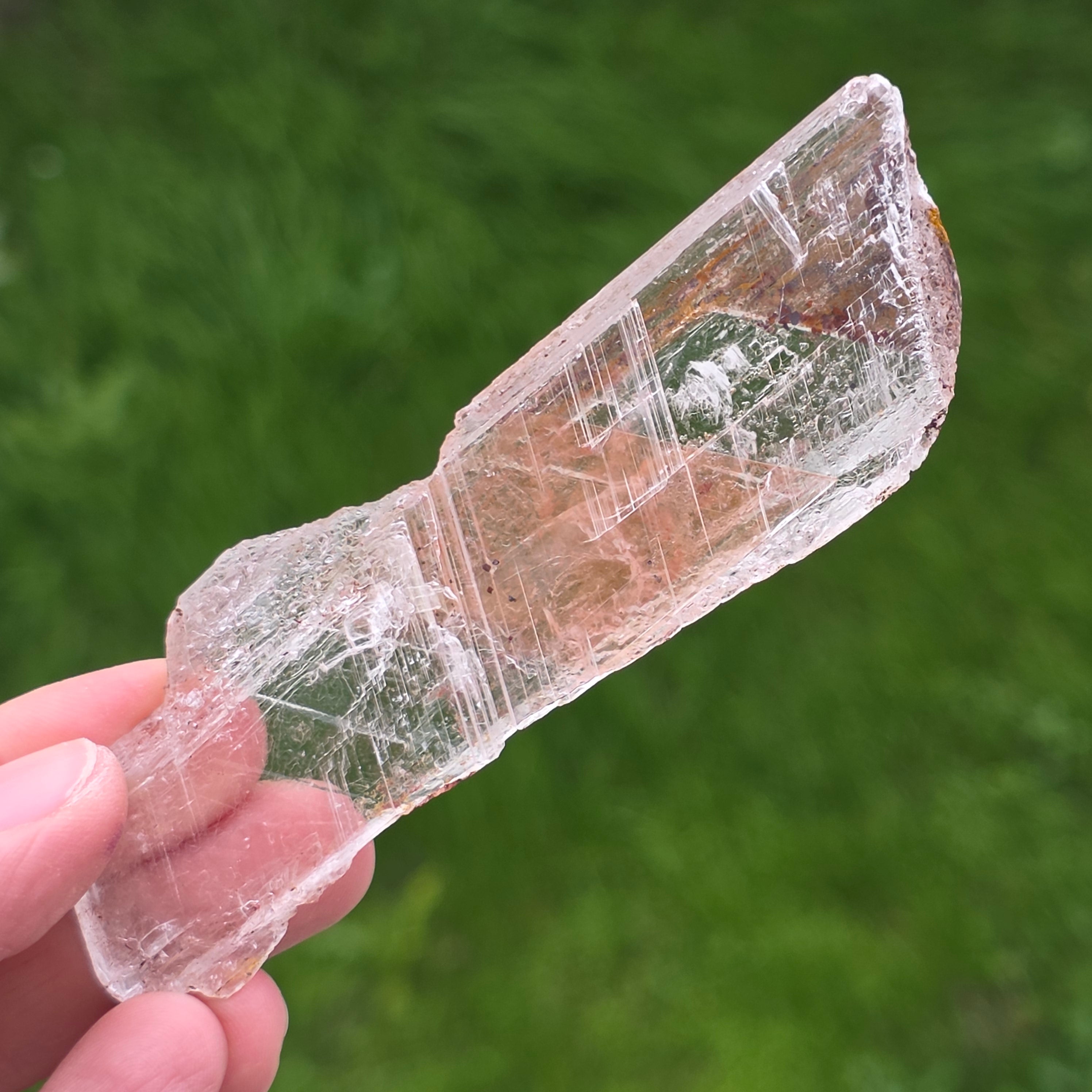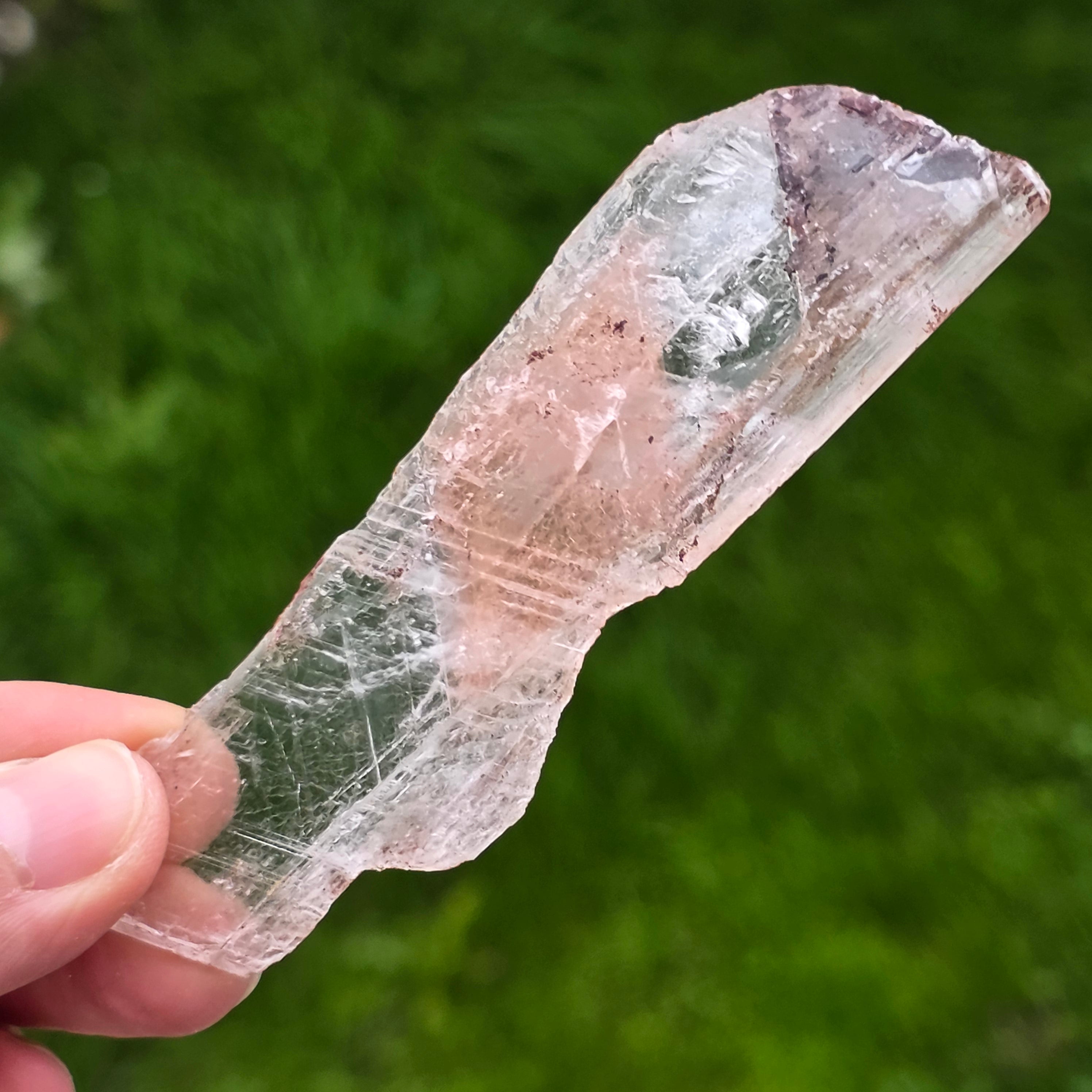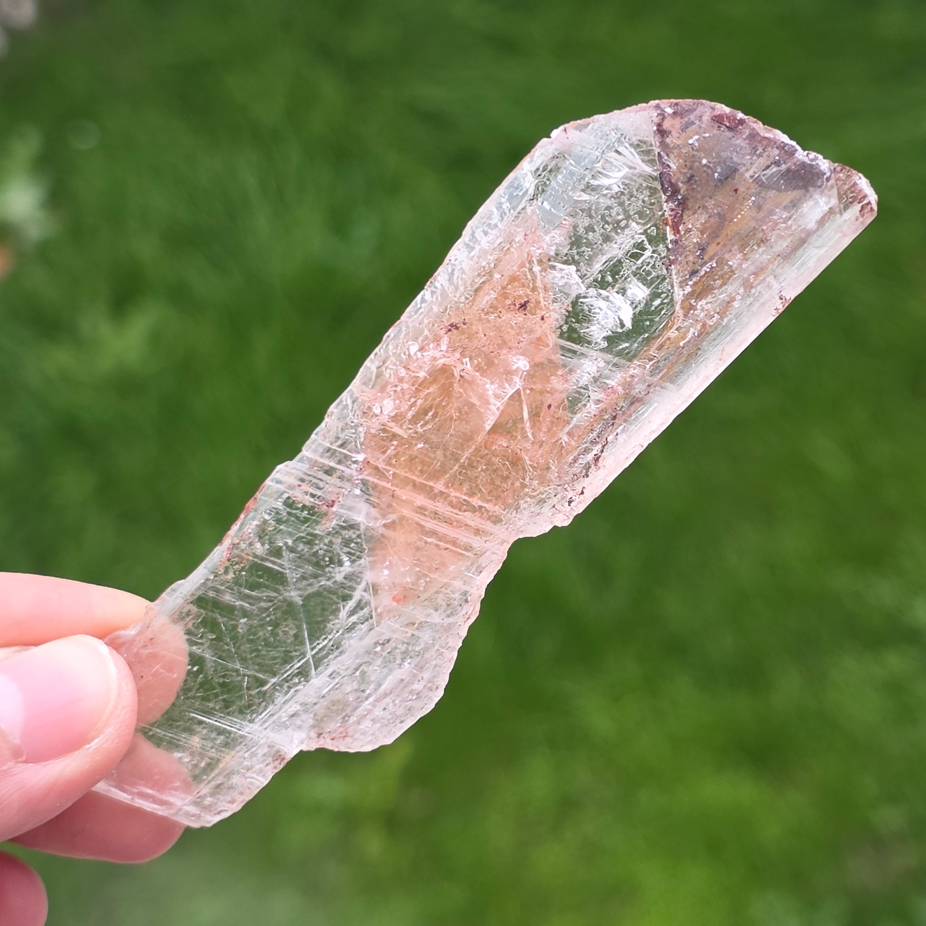 Selenitul apare sub formă de cristale alungite sau plăci translucide, cu luciu mătăsos și textură fină, în timp ce hematitul este prezent sub formă de incluziuni, pelicule sau depuneri naturale, care accentuează structura cristalului și îi conferă profunzime vizuală.