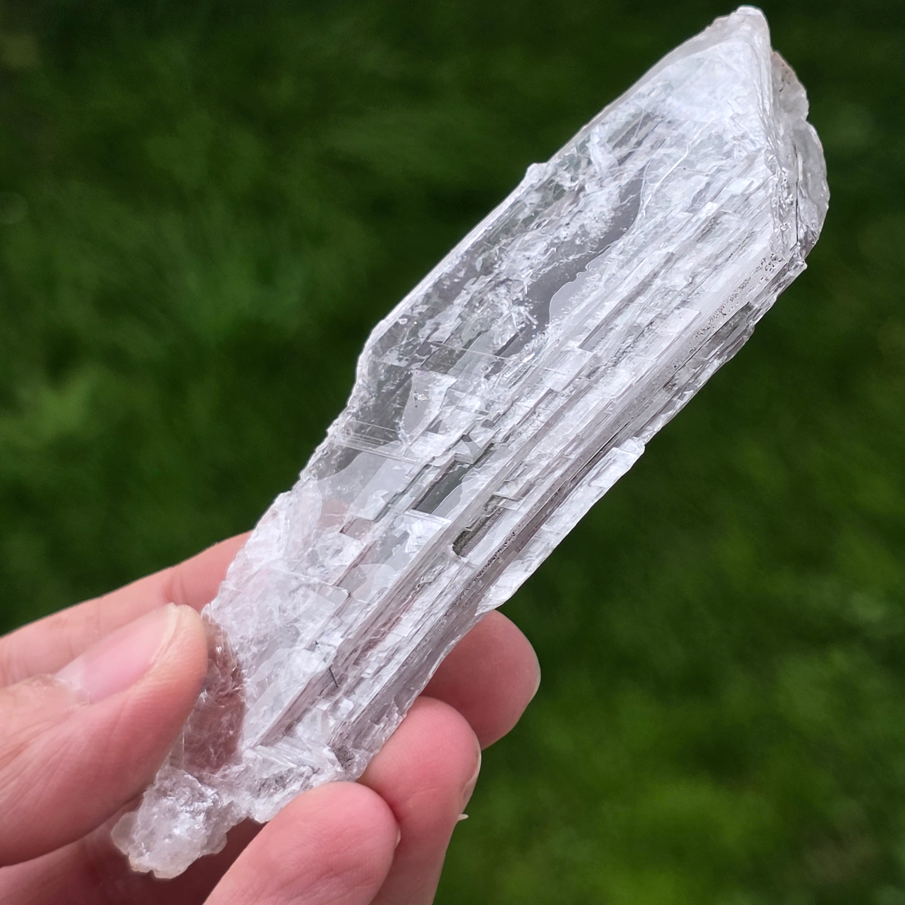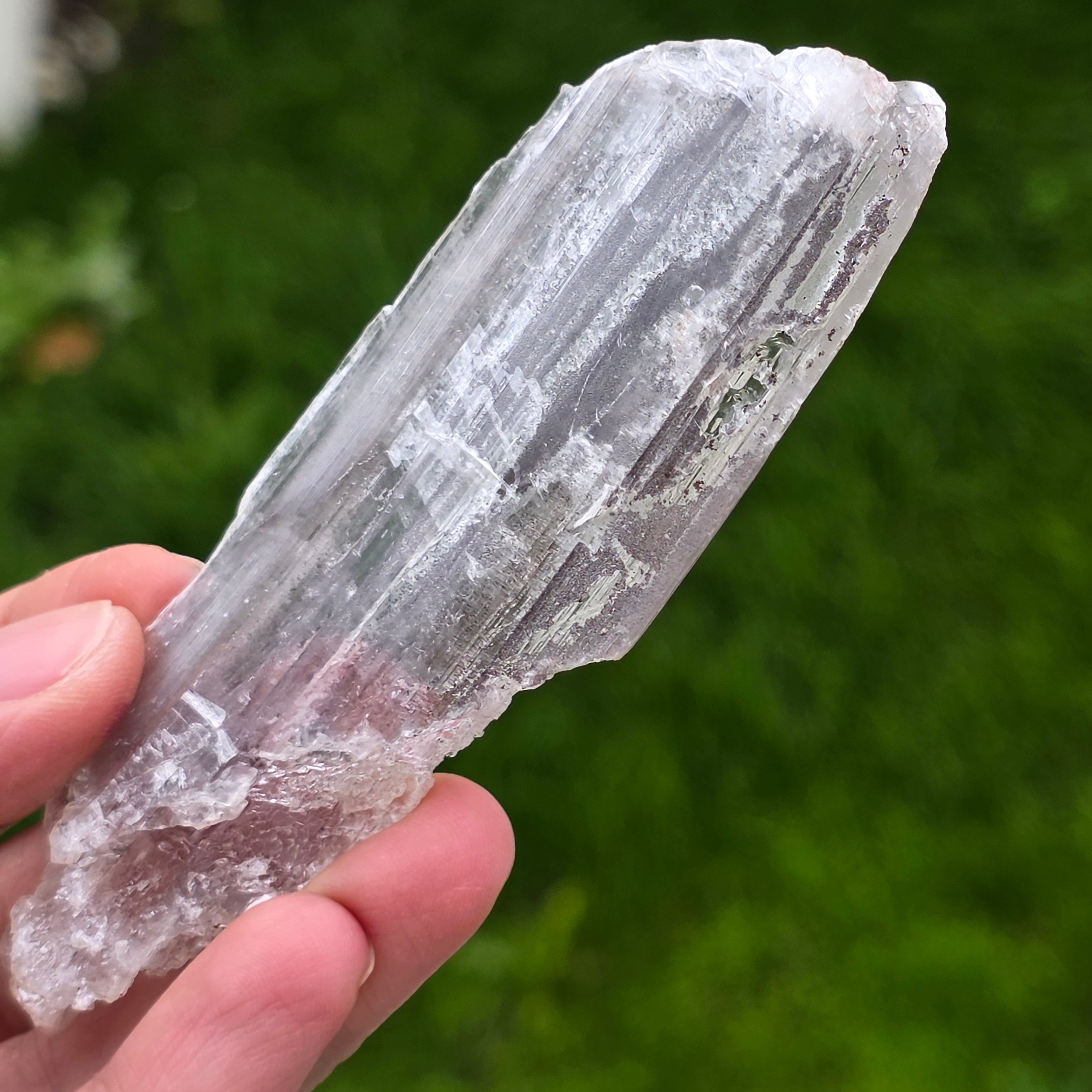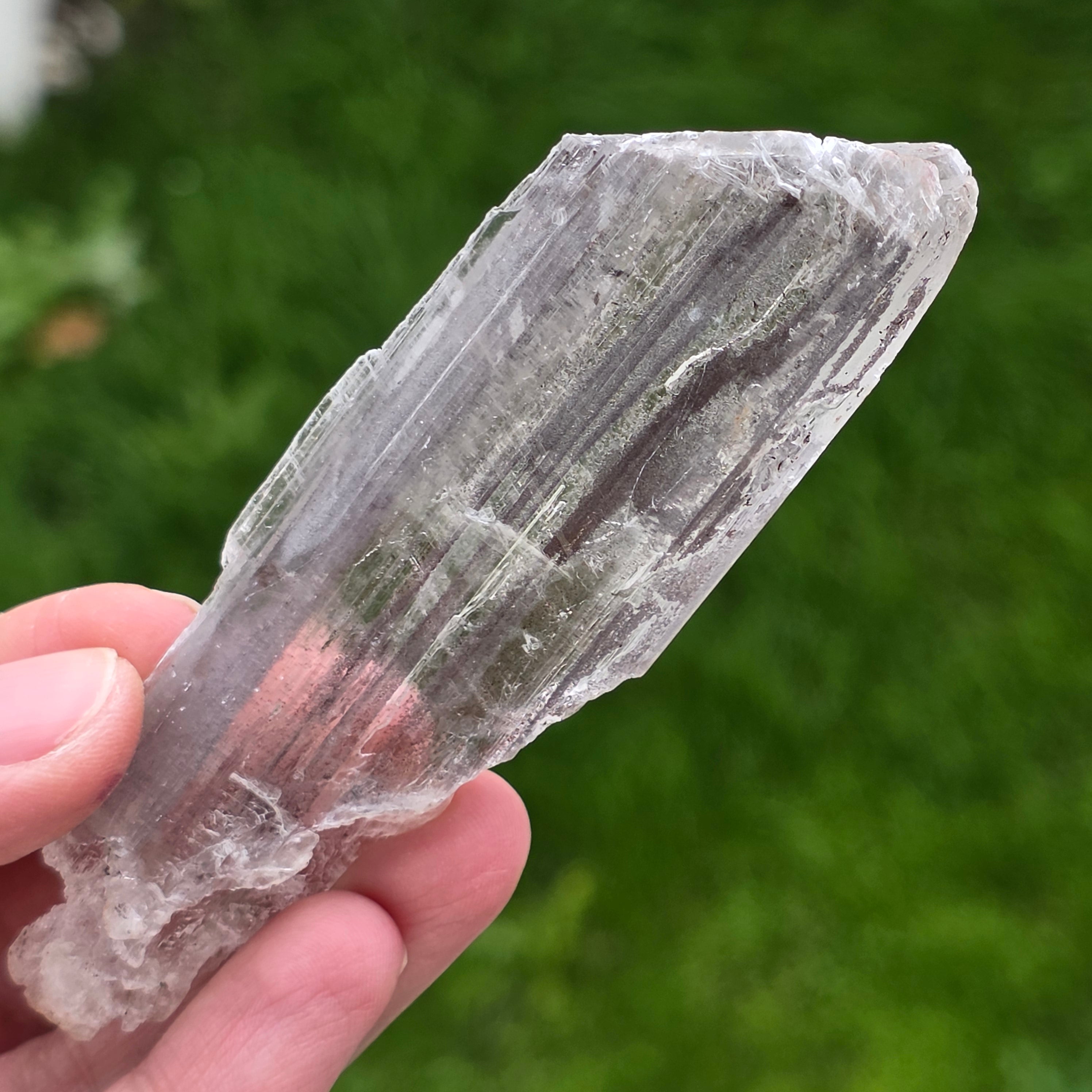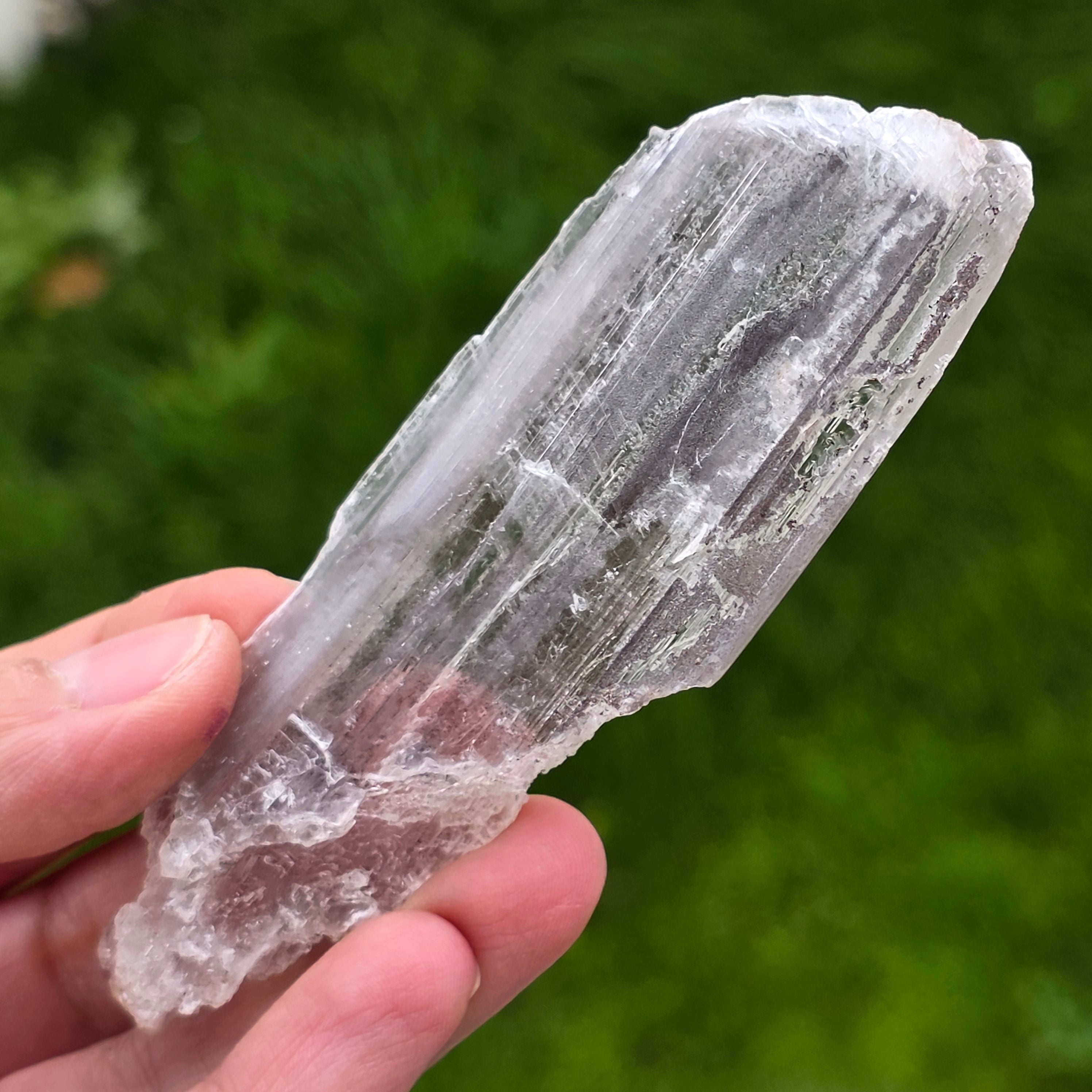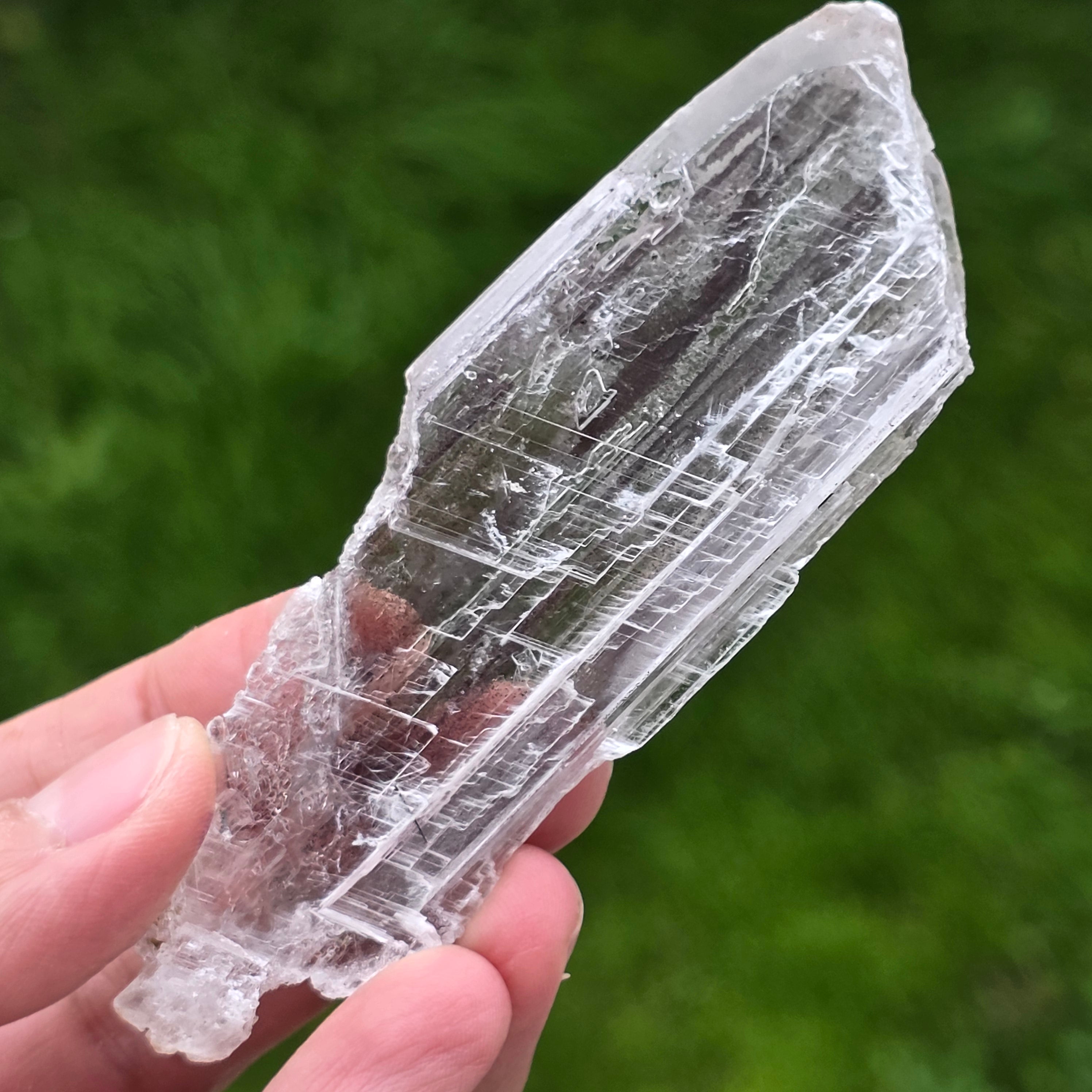 Selenitul apare sub formă de cristale alungite sau plăci translucide, cu luciu mătăsos și textură fină, în timp ce hematitul este prezent sub formă de incluziuni, pelicule sau depuneri naturale, care accentuează structura cristalului și îi conferă profunzime vizuală.
