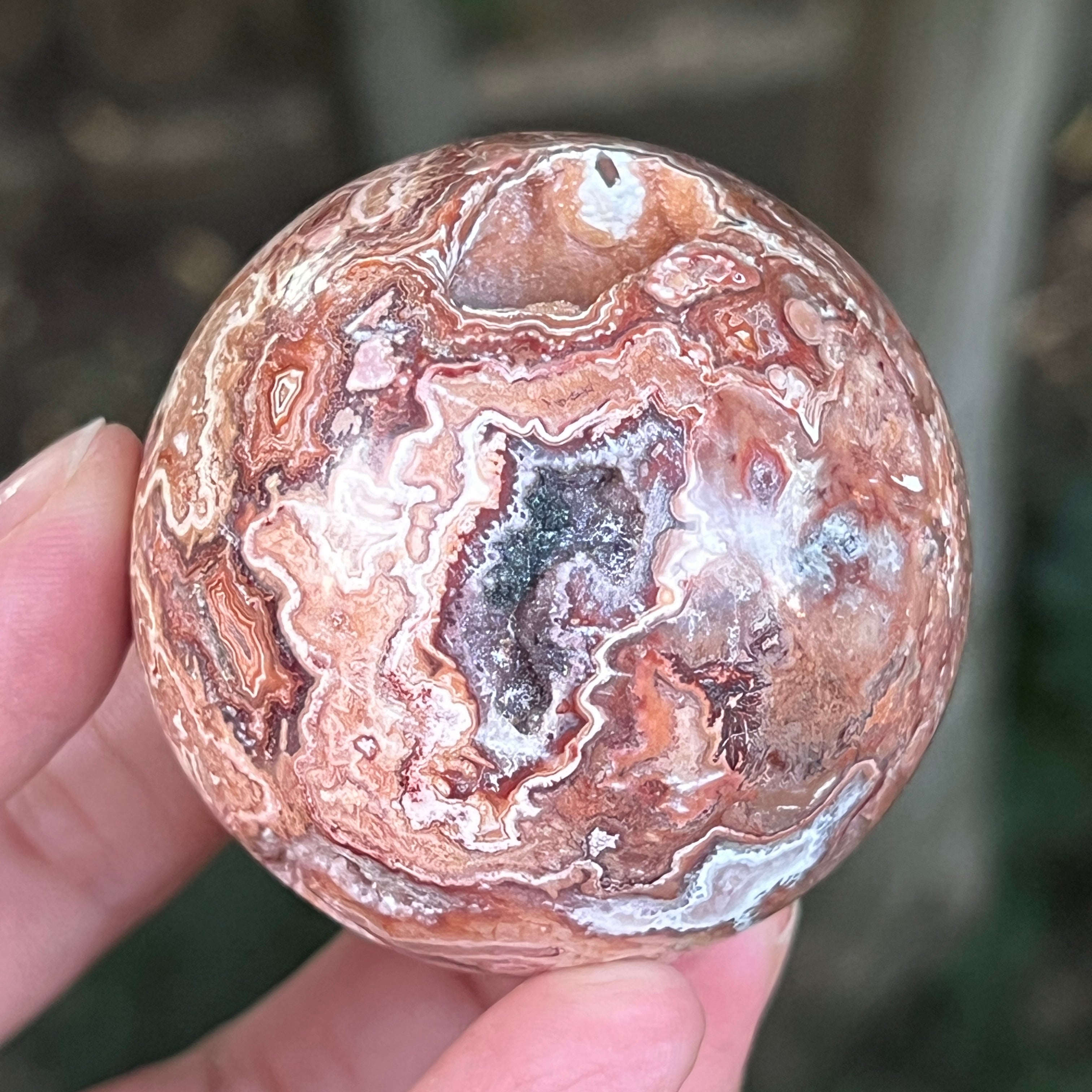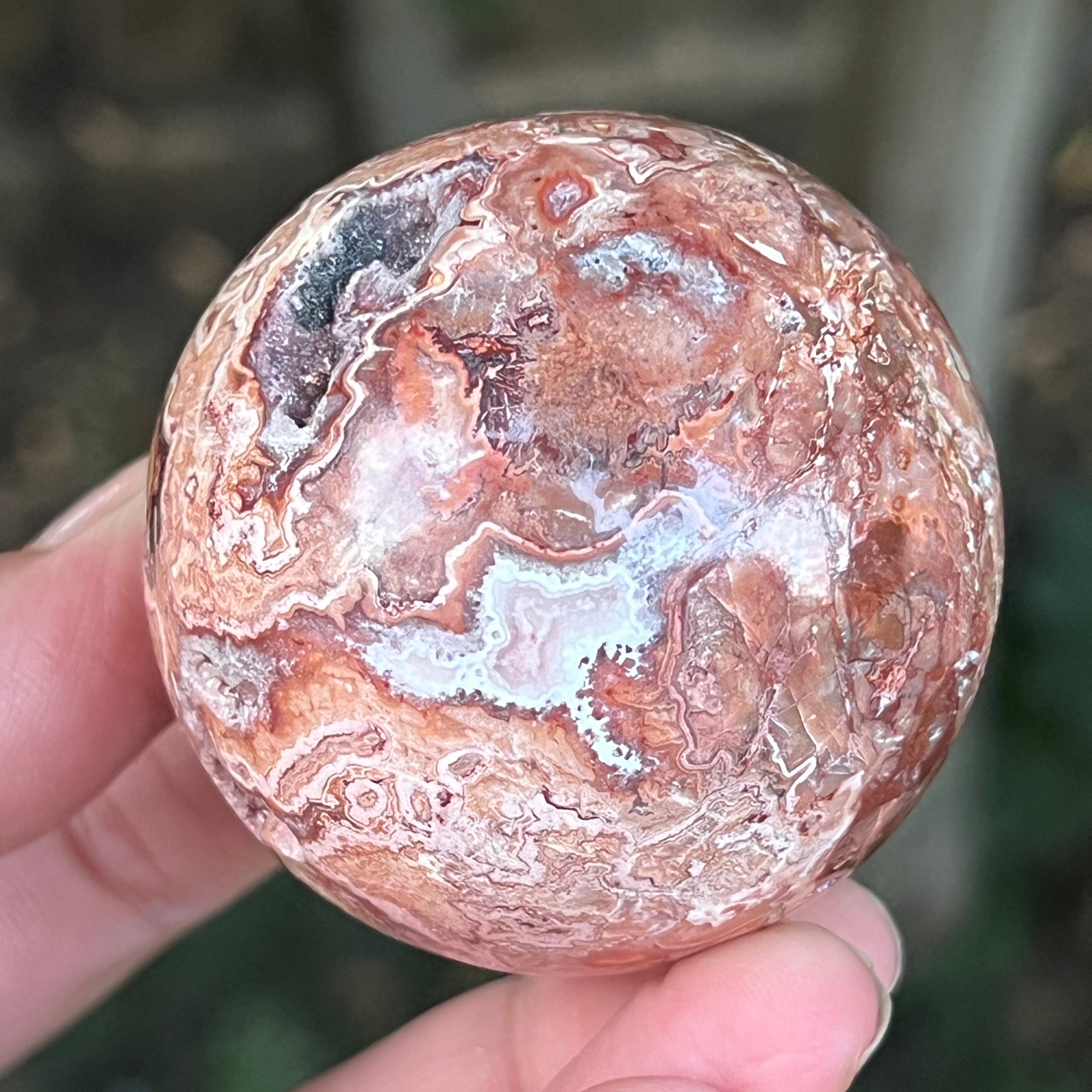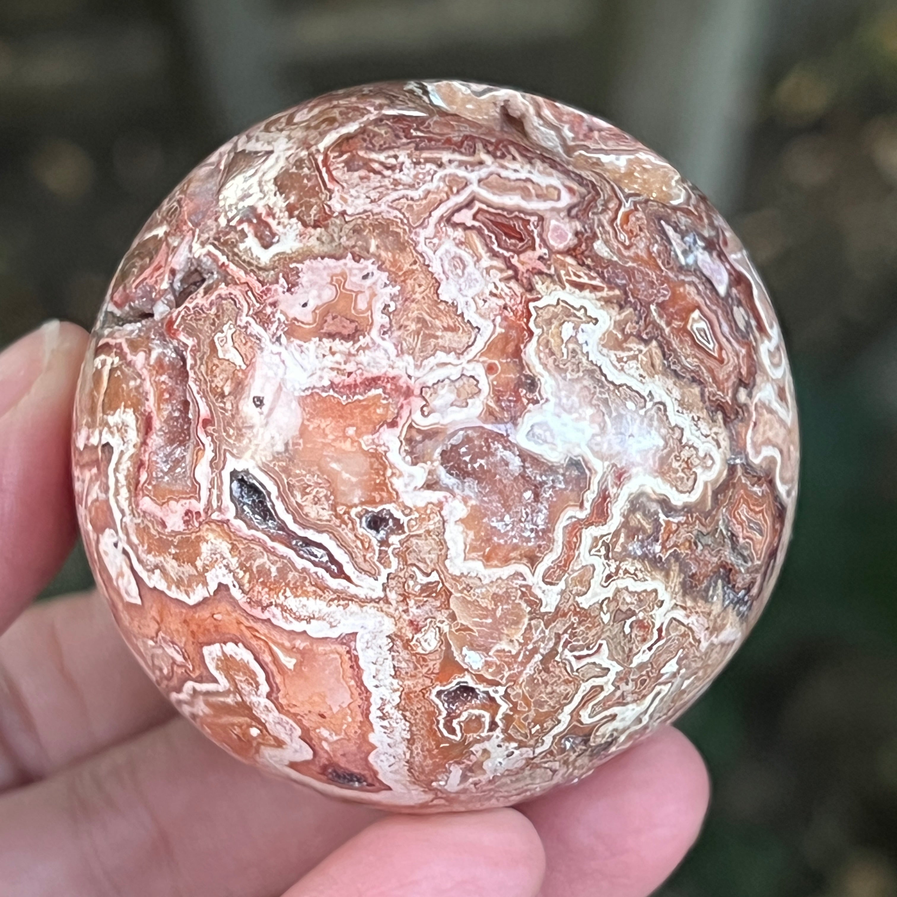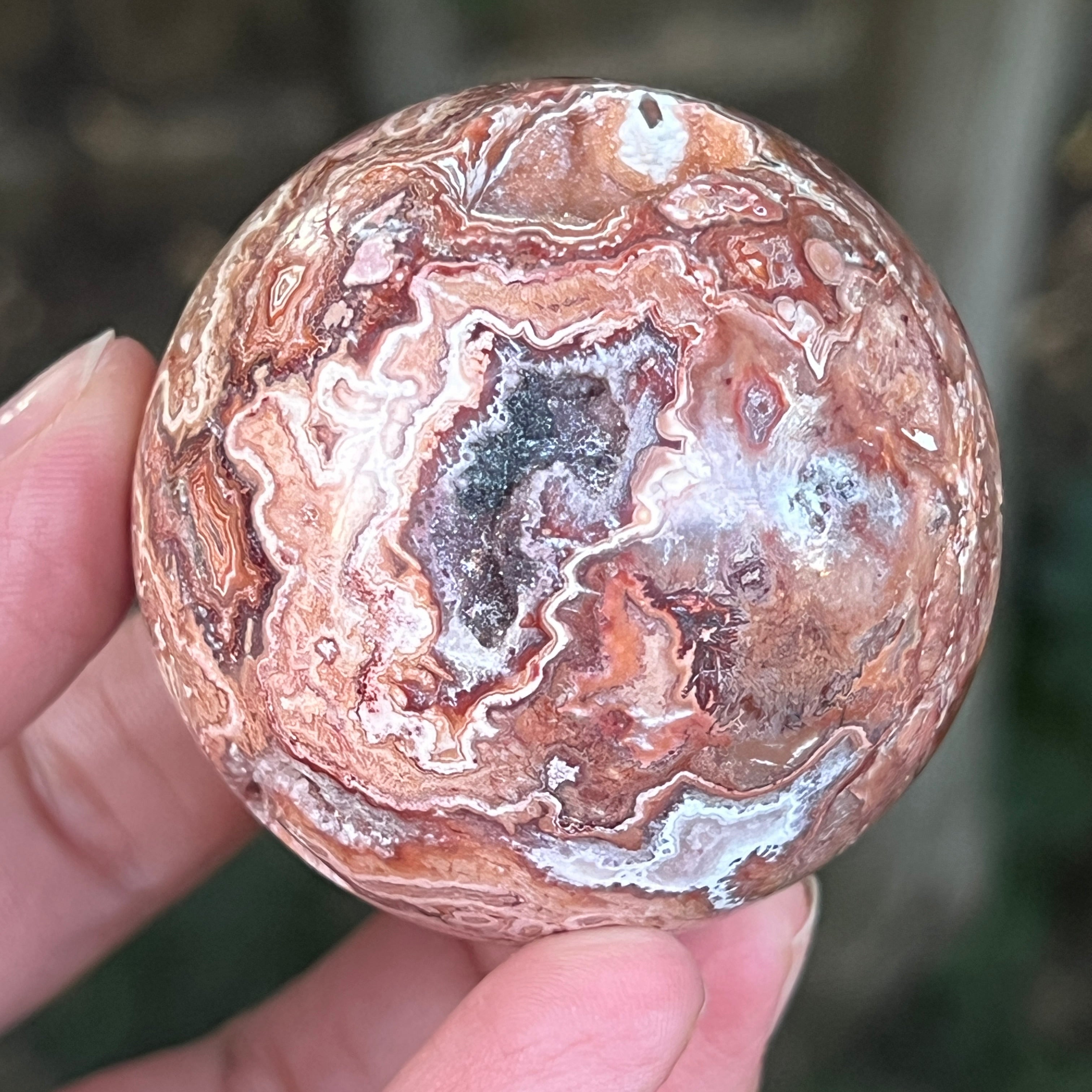 Agatul Crazy Lace este o varietate de calcedonie din grupa cuarțului, format prin depuneri ritmice de silice în cavitățile rocilor vulcanice, ceea ce creează benzile sale ondulate distincte. Compoziția sa chimică este SiO₂ (dioxid de siliciu), iar culorile sale variate (galben, portocaliu, roșu, alb și maro) sunt datorate impurităților de fier și alte minerale.