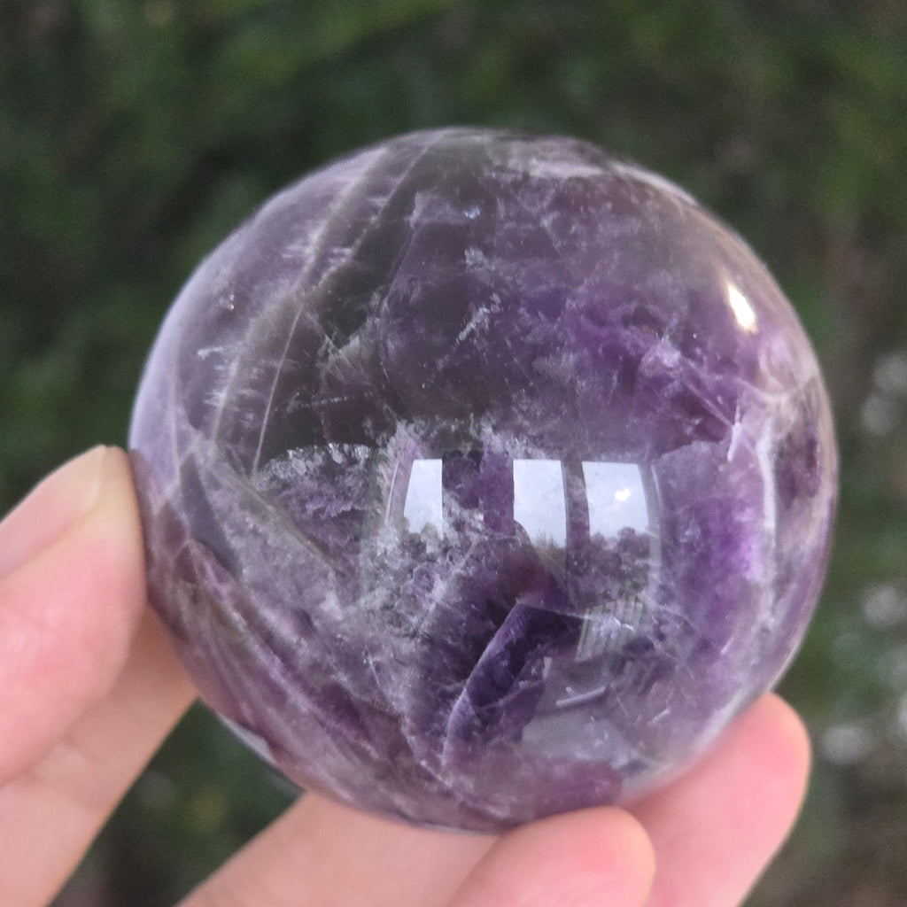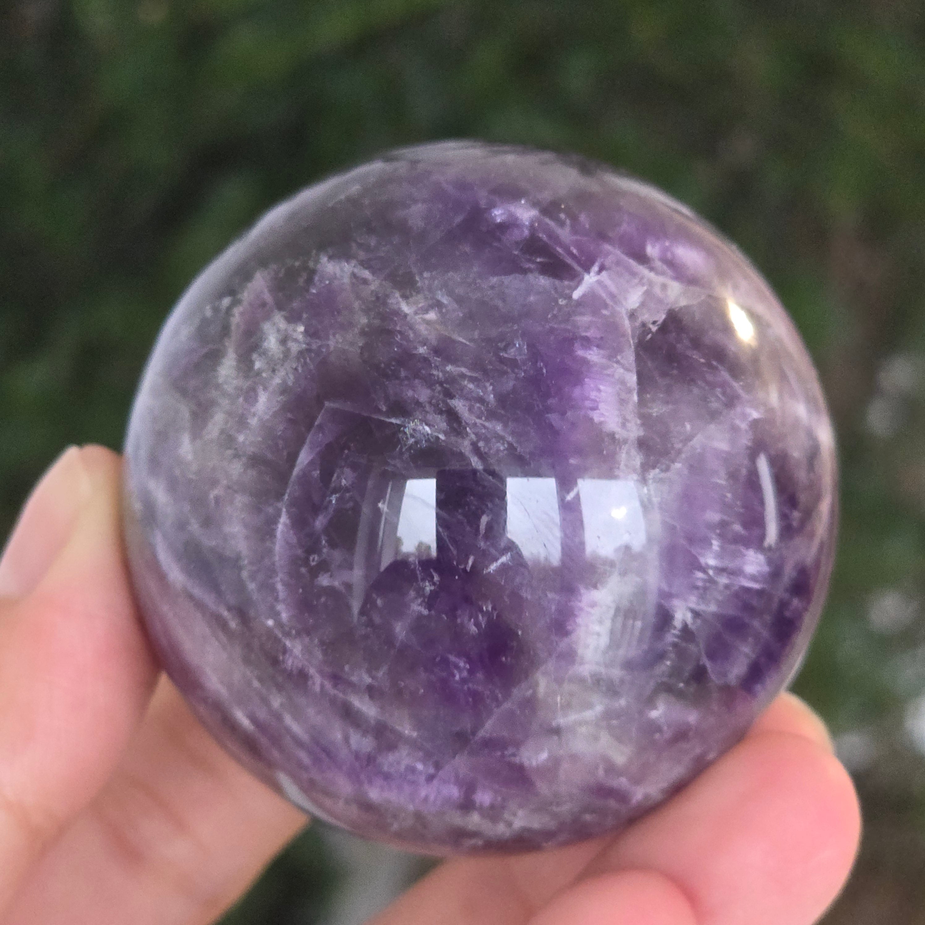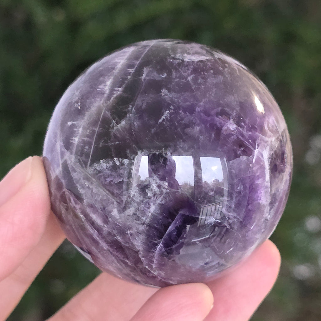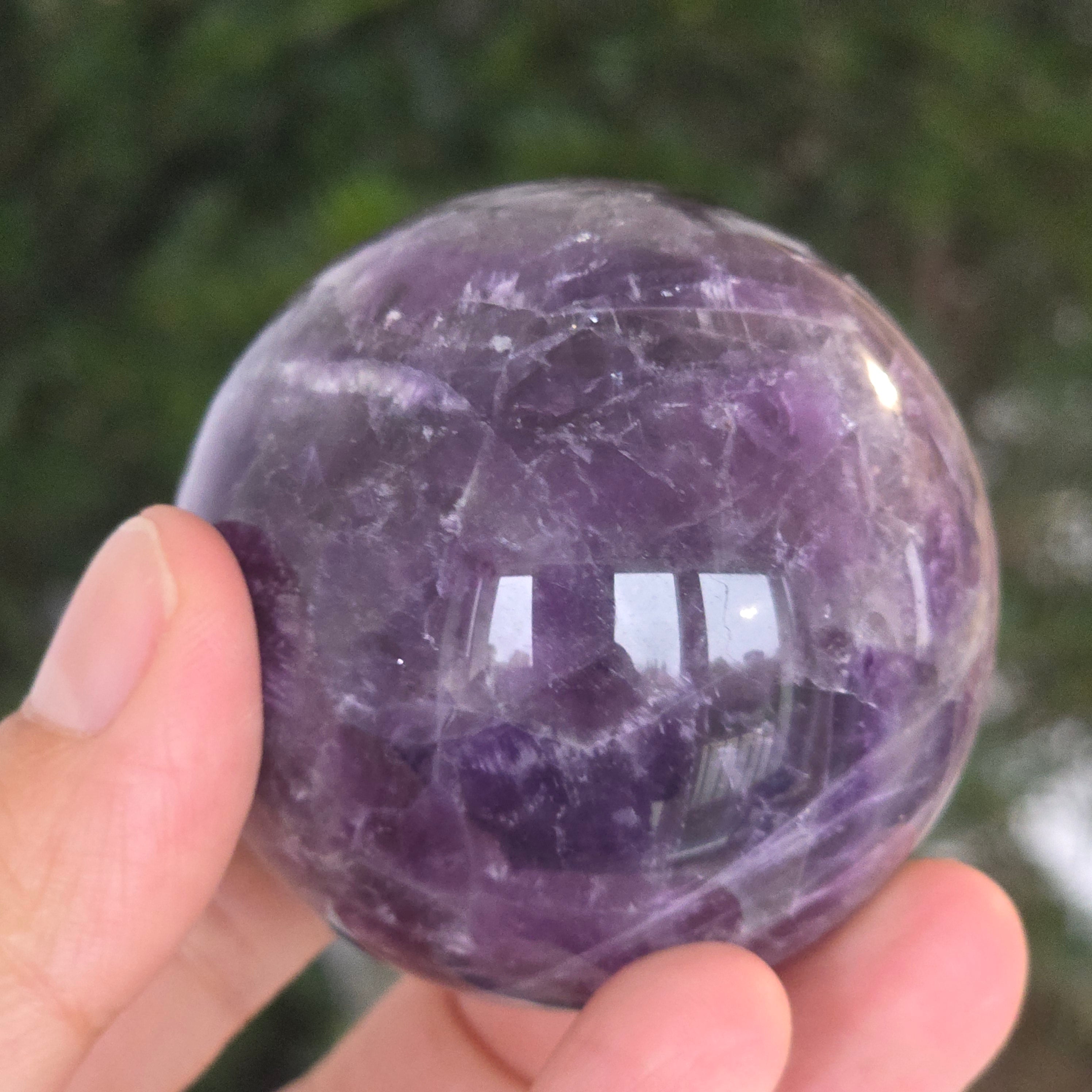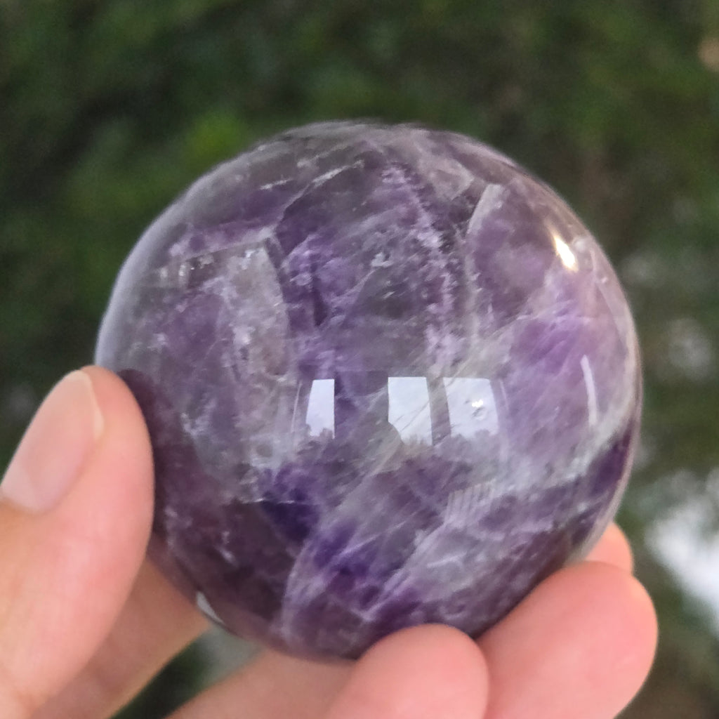 O sferă ce pare să concentreze în interior lumina unei nopți liliachii. Această piesă unicat din ametist chevron natural, dezvăluie straturi uimitoare de violet, alb și lavandă, dispuse în forme în V – semnul distinctiv al acestei varietăți rare de ametist. Suprafața perfect șlefuită, catifelată la atingere, oglindește lumina cu o finețe hipnotică, aducând liniște și rafinament în orice spațiu.