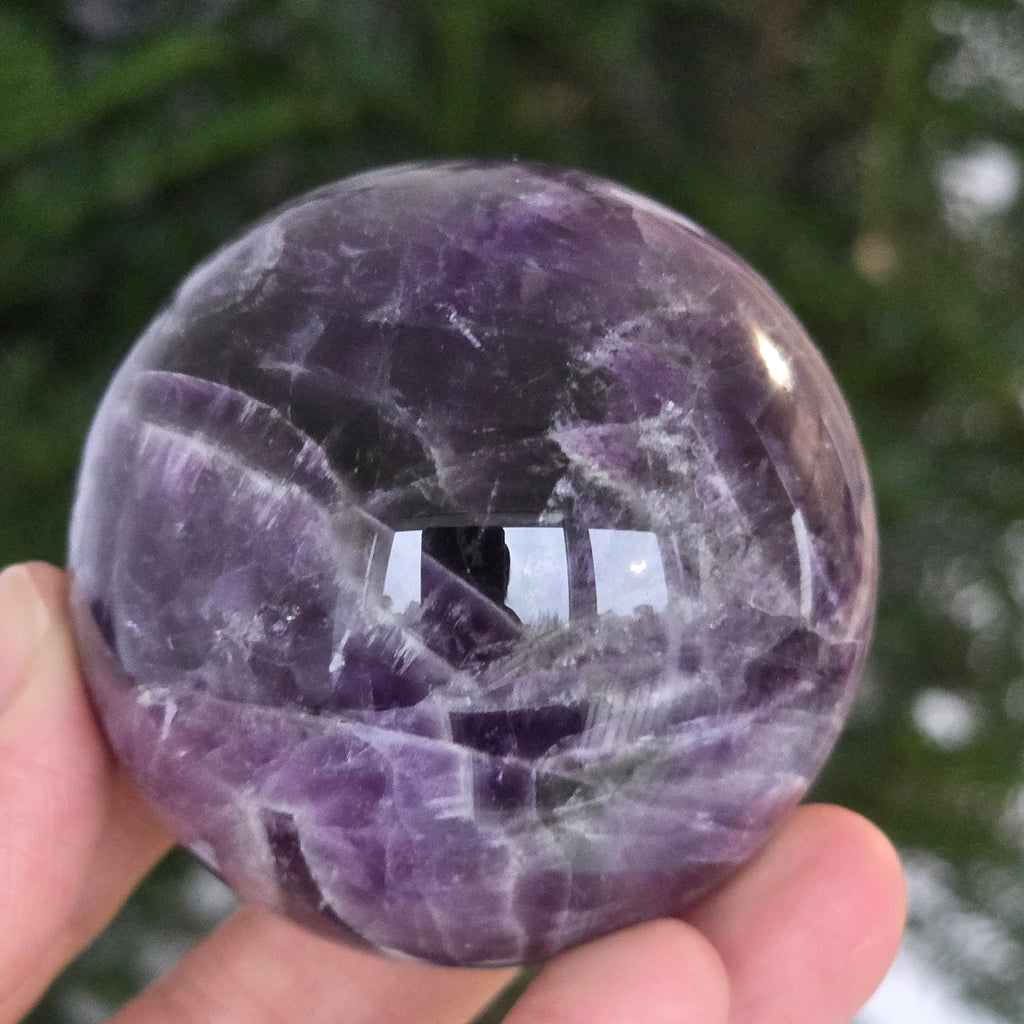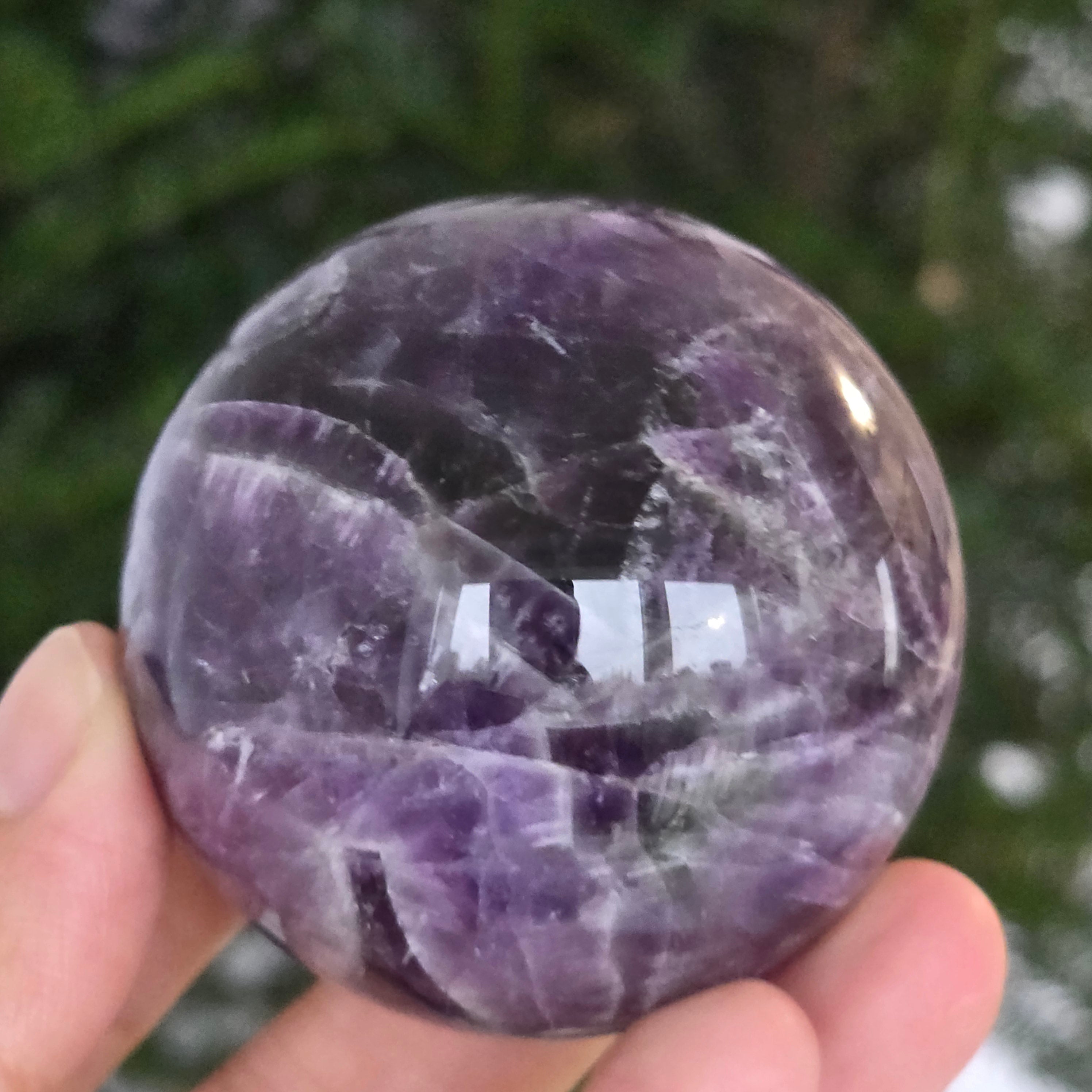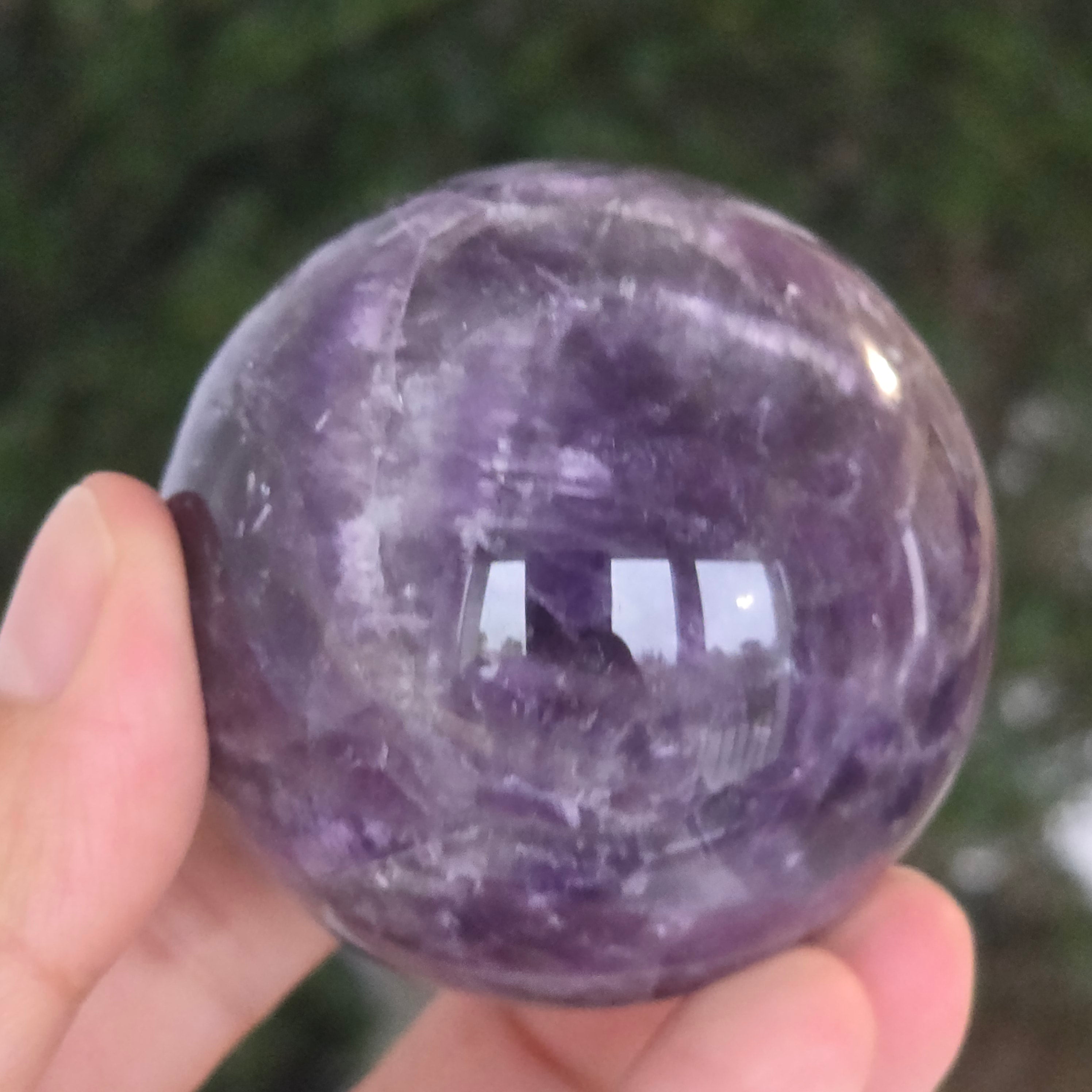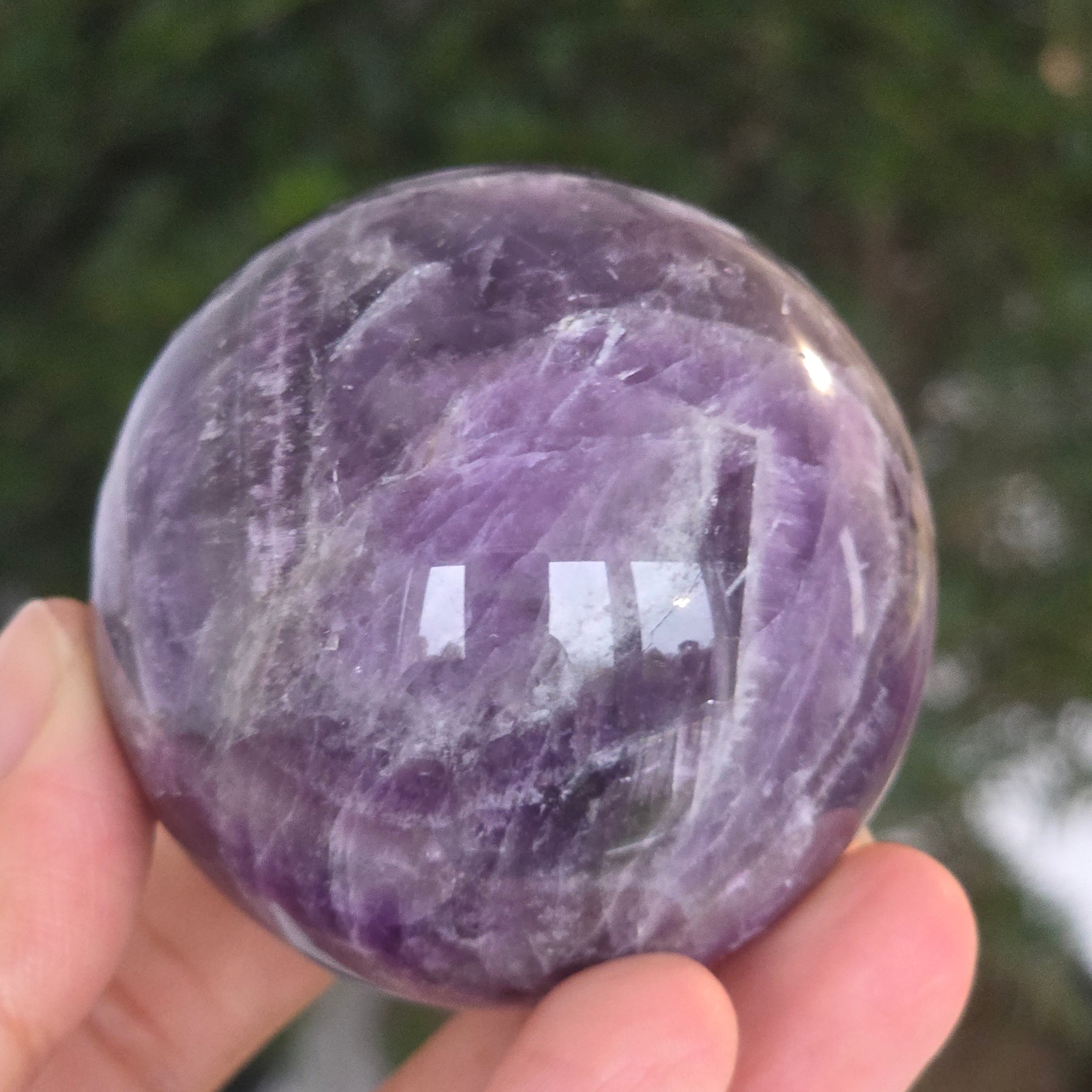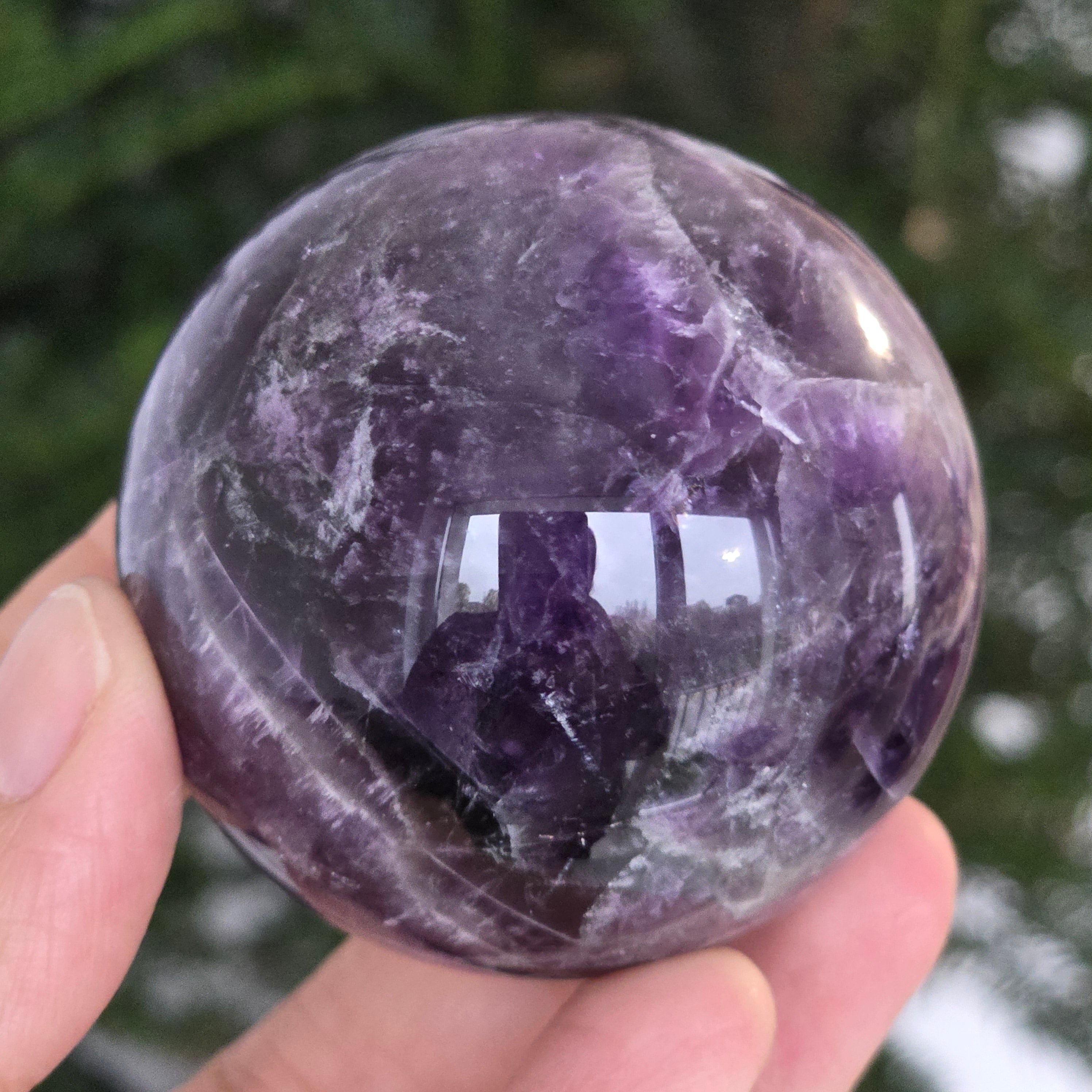 O sferă ce pare să concentreze în interior lumina unei nopți liliachii. Această piesă unicat din ametist chevron natural, dezvăluie straturi uimitoare de violet, alb și lavandă, dispuse în forme în V – semnul distinctiv al acestei varietăți rare de ametist. Suprafața perfect șlefuită, catifelată la atingere, oglindește lumina cu o finețe hipnotică, aducând liniște și rafinament în orice spațiu.