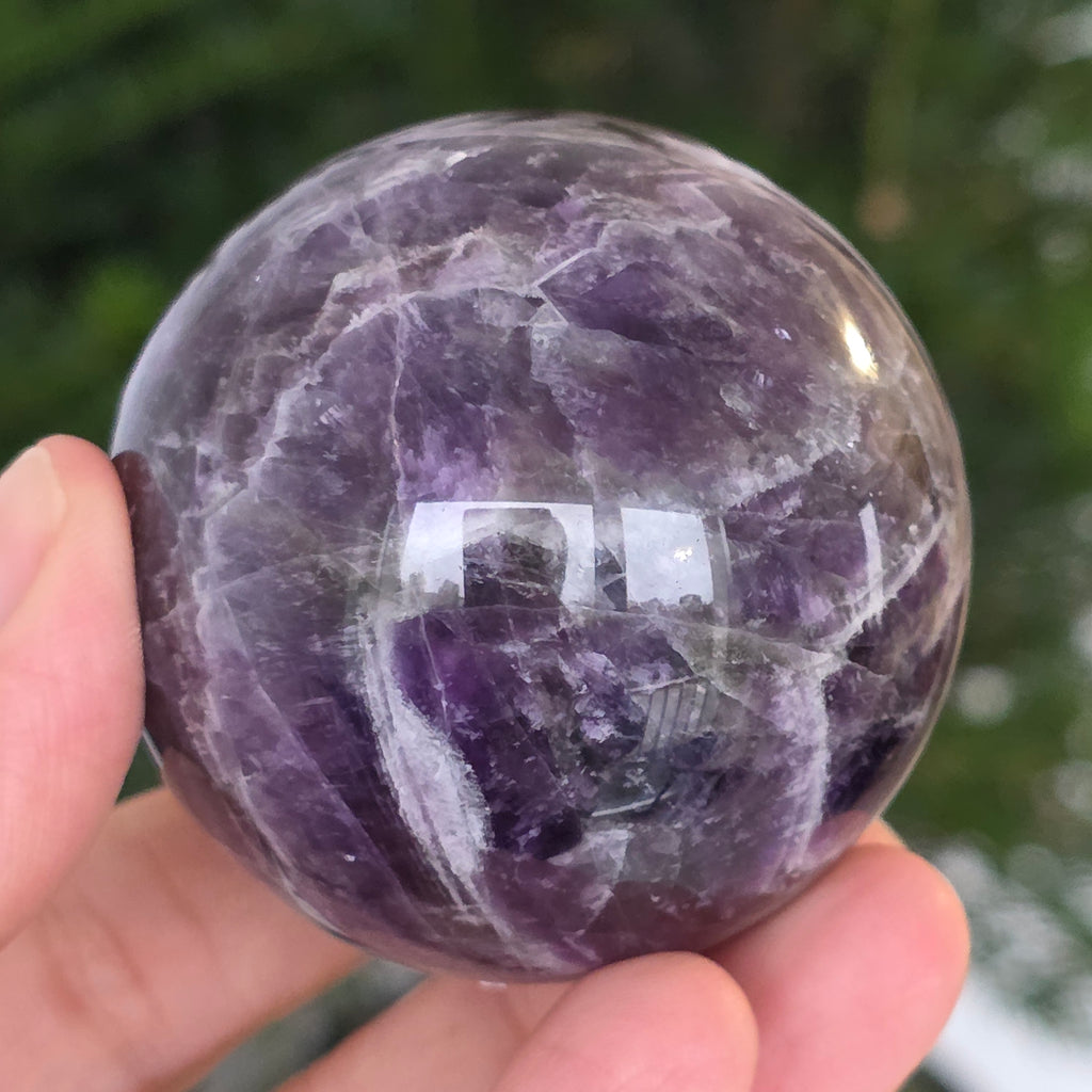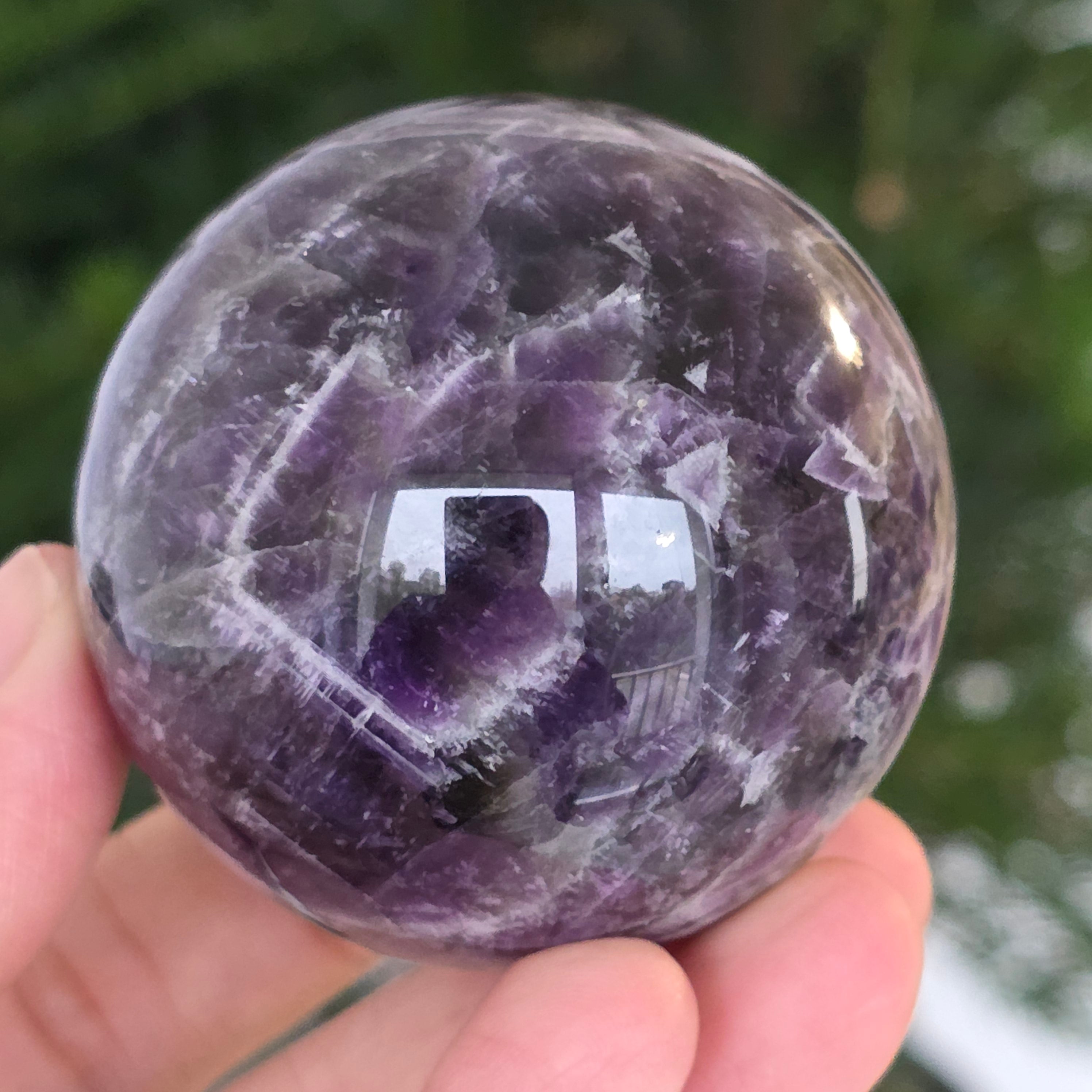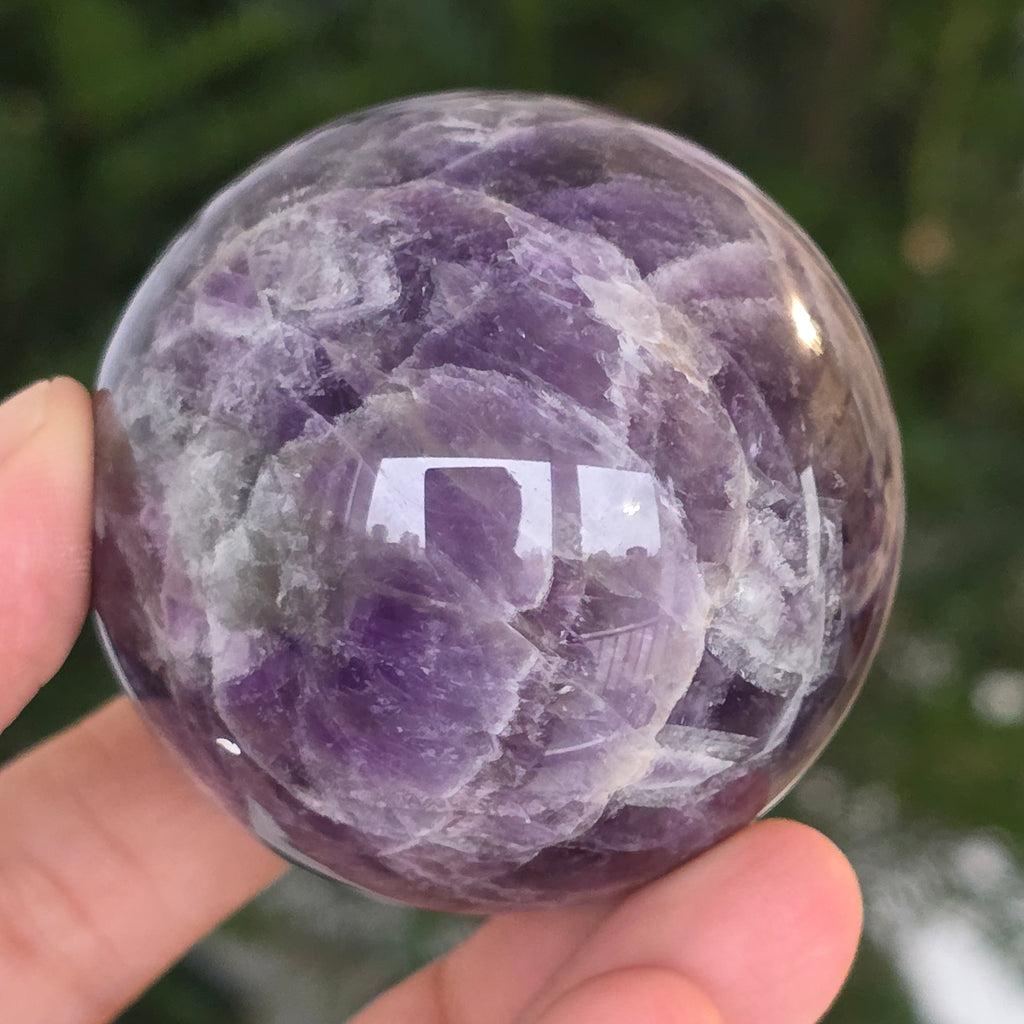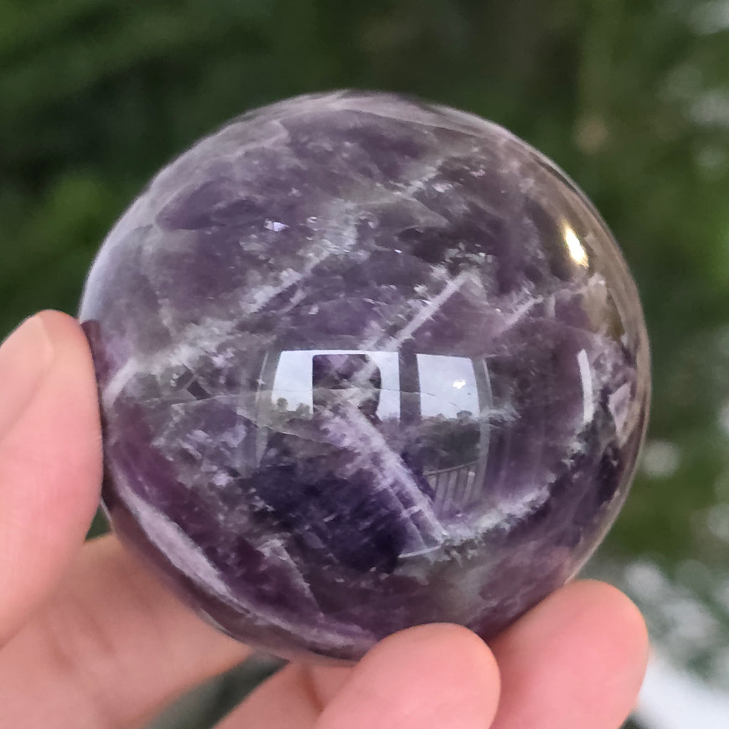 O sferă ce pare să concentreze în interior lumina unei nopți liliachii. Această piesă unicat din ametist chevron natural, dezvăluie straturi uimitoare de violet, alb și lavandă, dispuse în forme în V – semnul distinctiv al acestei varietăți rare de ametist. Suprafața perfect șlefuită, catifelată la atingere, oglindește lumina cu o finețe hipnotică, aducând liniște și rafinament în orice spațiu.
