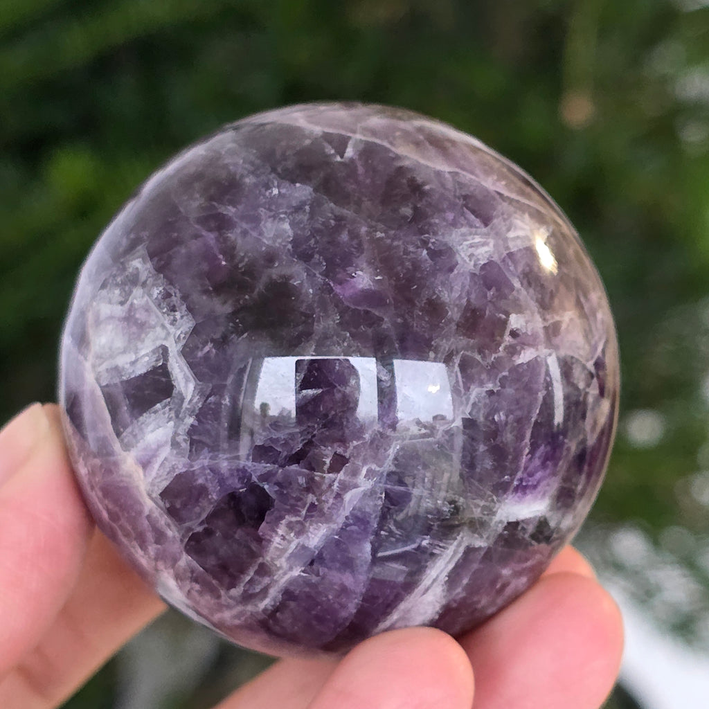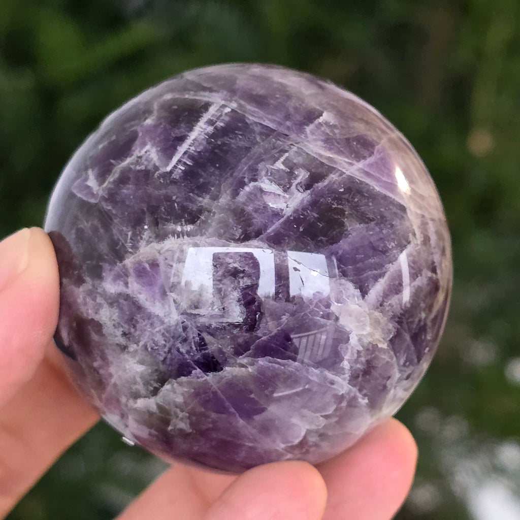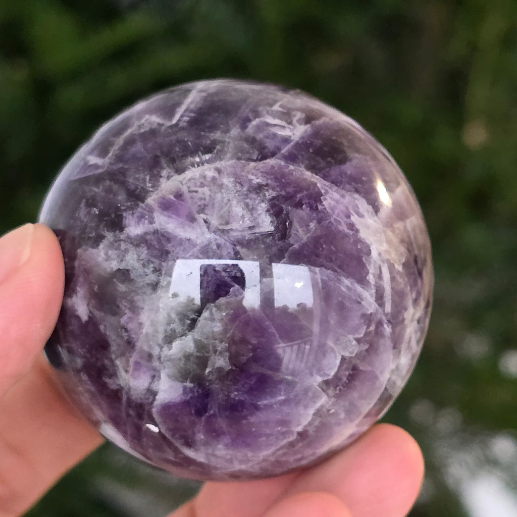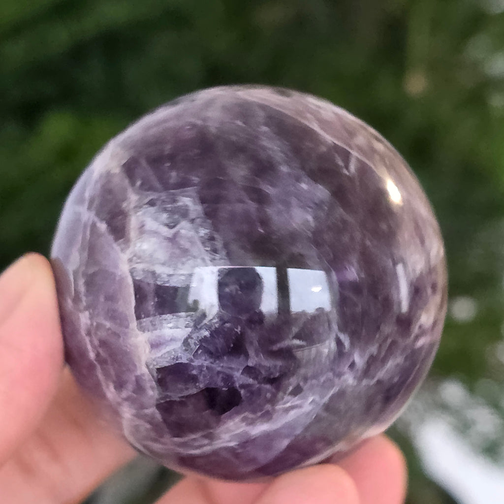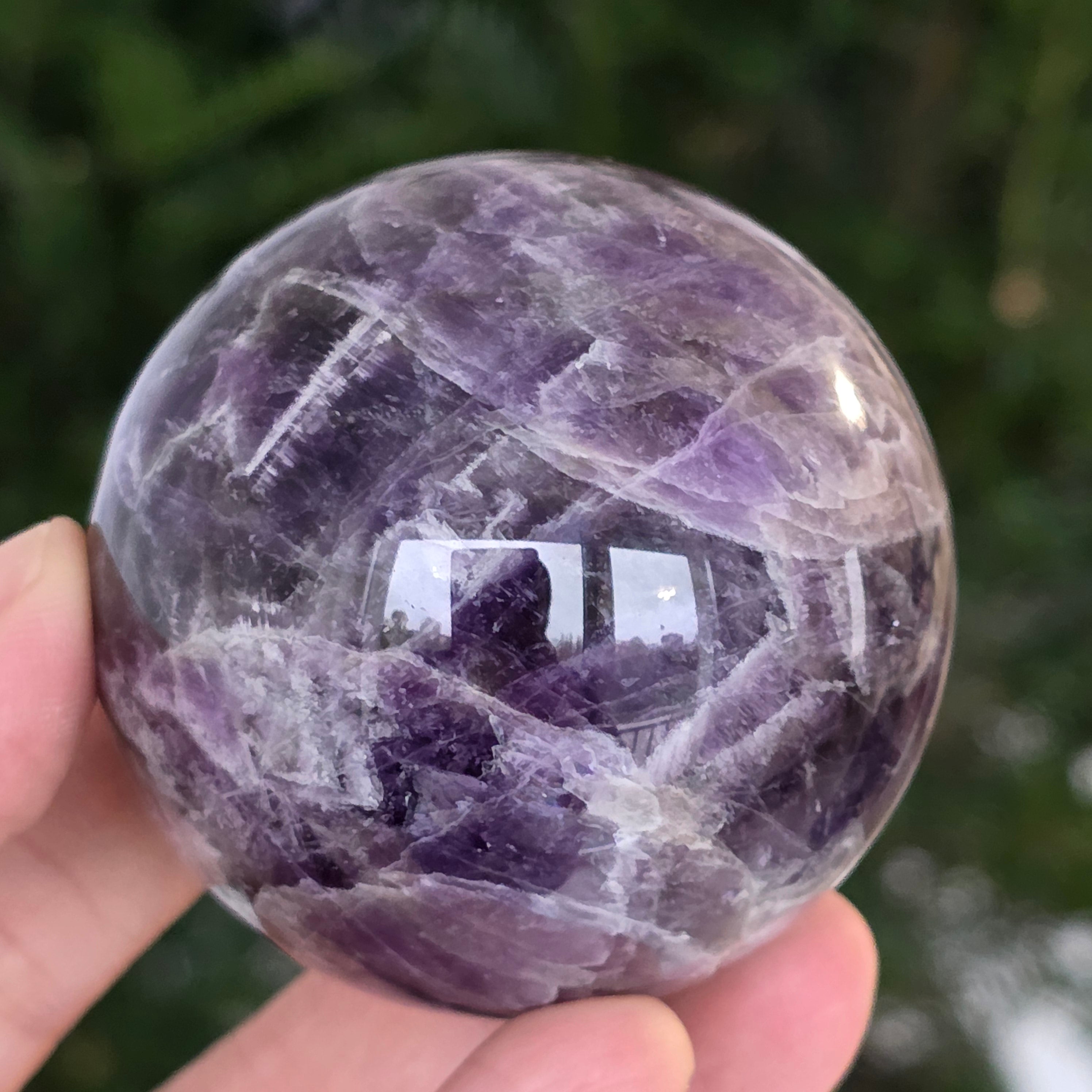 O sferă ce pare să concentreze în interior lumina unei nopți liliachii. Această piesă unicat din ametist chevron natural, dezvăluie straturi uimitoare de violet, alb și lavandă, dispuse în forme în V – semnul distinctiv al acestei varietăți rare de ametist. Suprafața perfect șlefuită, catifelată la atingere, oglindește lumina cu o finețe hipnotică, aducând liniște și rafinament în orice spațiu.