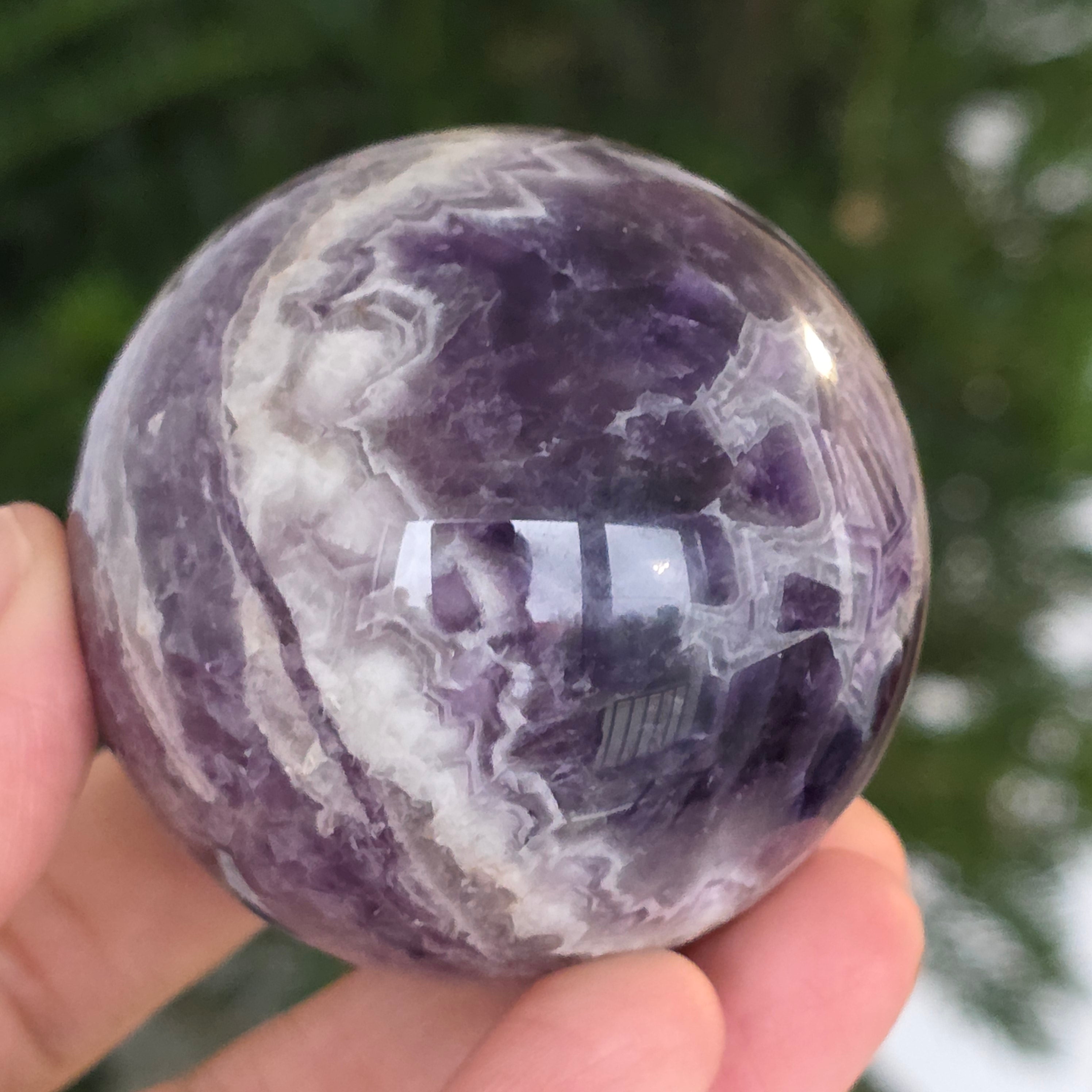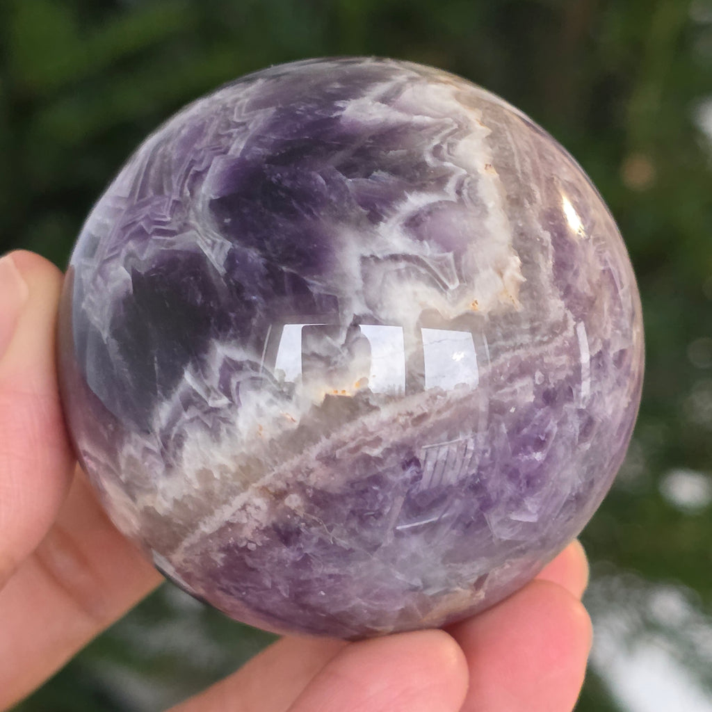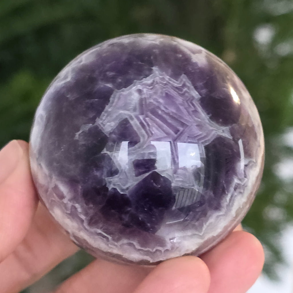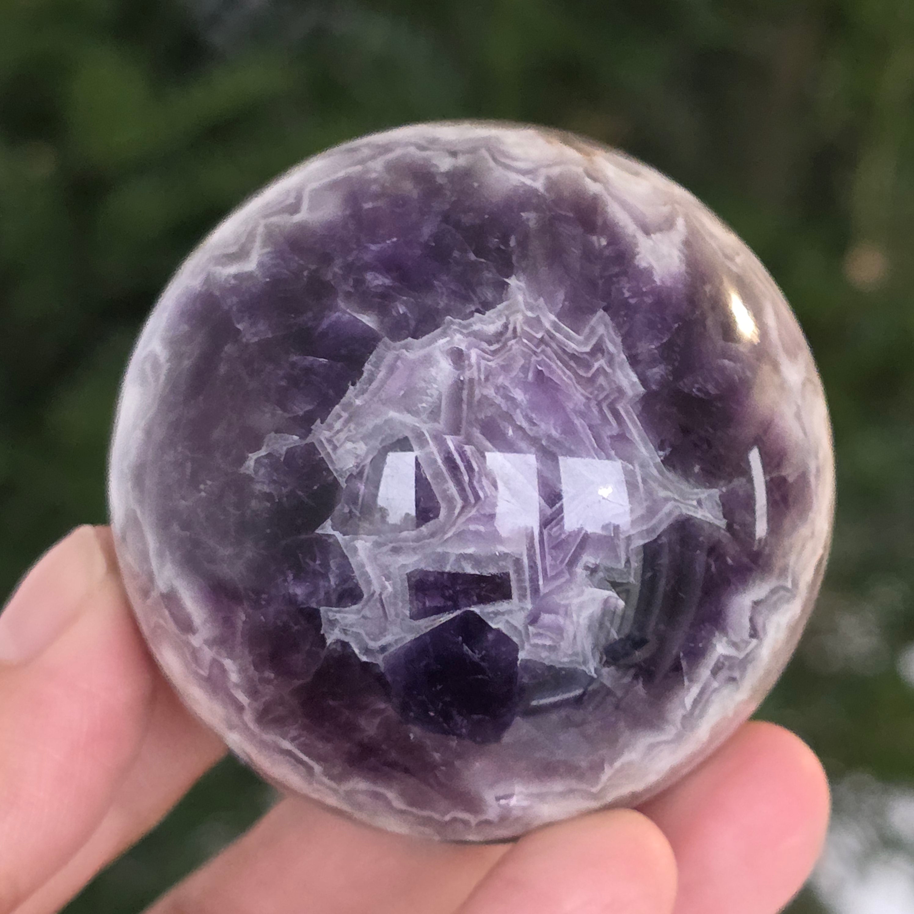O sferă ce pare să concentreze în interior lumina unei nopți liliachii. Această piesă unicat din ametist chevron natural, dezvăluie straturi uimitoare de violet, alb și lavandă, dispuse în forme în V – semnul distinctiv al acestei varietăți rare de ametist. Suprafața perfect șlefuită, catifelată la atingere, oglindește lumina cu o finețe hipnotică, aducând liniște și rafinament în orice spațiu.